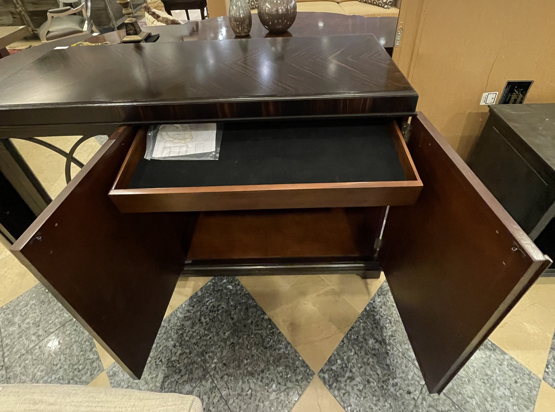 Lilian August for Hickory Chair "Grayson" sideboard. This beautiful sideboard is crafted with a dark, rich-toned wood veneer exterior that has stunning woodgrain. The piece has three mirrored doors with curved mullions. It sits on four bracket feet for added height that extend out beyond the rest of the piece. The leftmost door hides a storage compartment with one drawer and one shelf. The center and right door obscure one larger compartment that also holds one shelf. The left and right door each have one small, silver colored knob for easy opening. This beautiful sideboard is sure to elevate any space with a classic yet striking look.