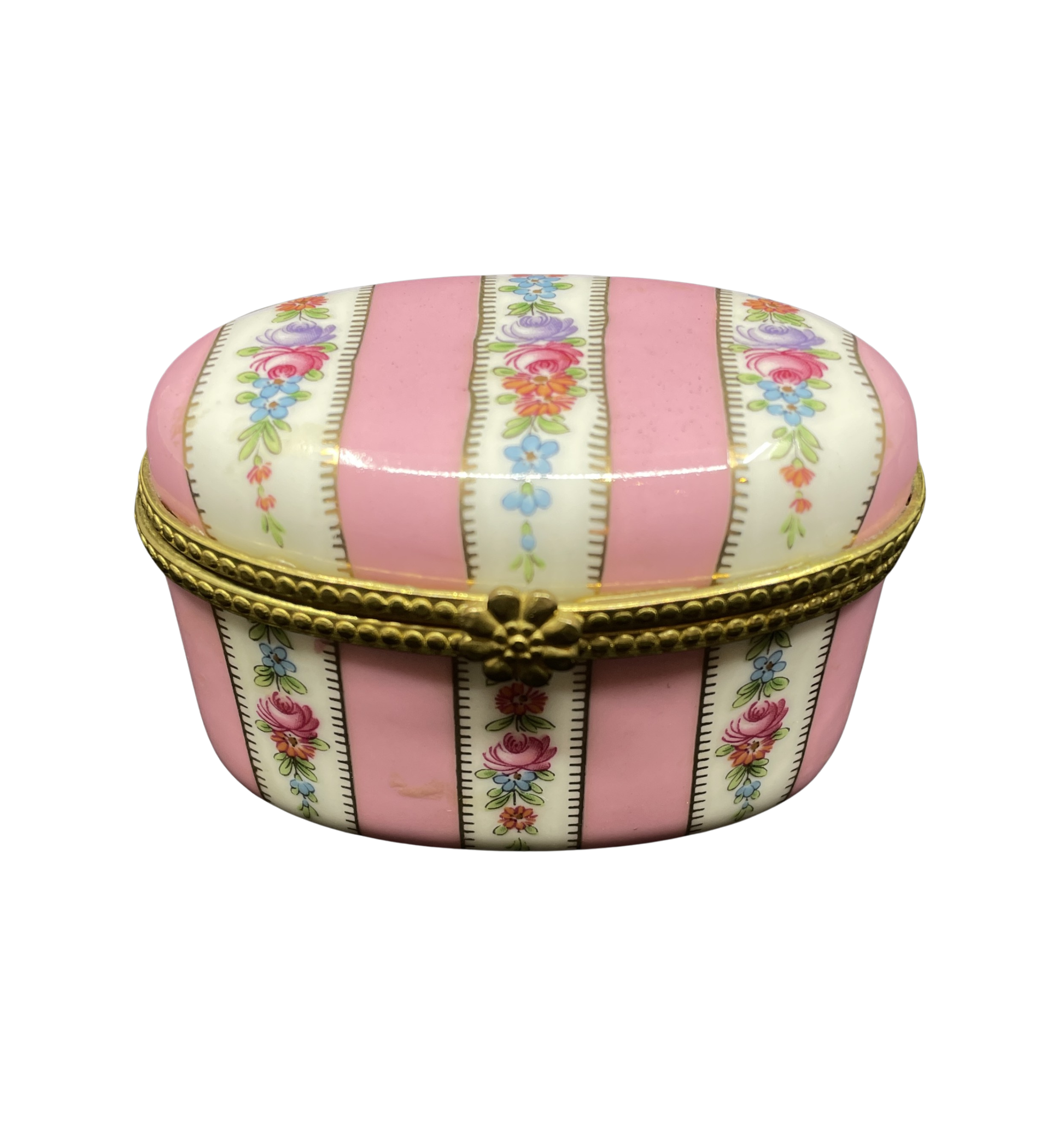 Limoges floral oval trinket box. Marked on the bottom. This beautiful oblong box features a pink base with stripes of white that are ornamented by floral details in green and pink. The outer edge of the box is accented by a brass trim with a small flower clasp detail. When opened the box reveals a small flower detail on both the top and bottom of the interior.