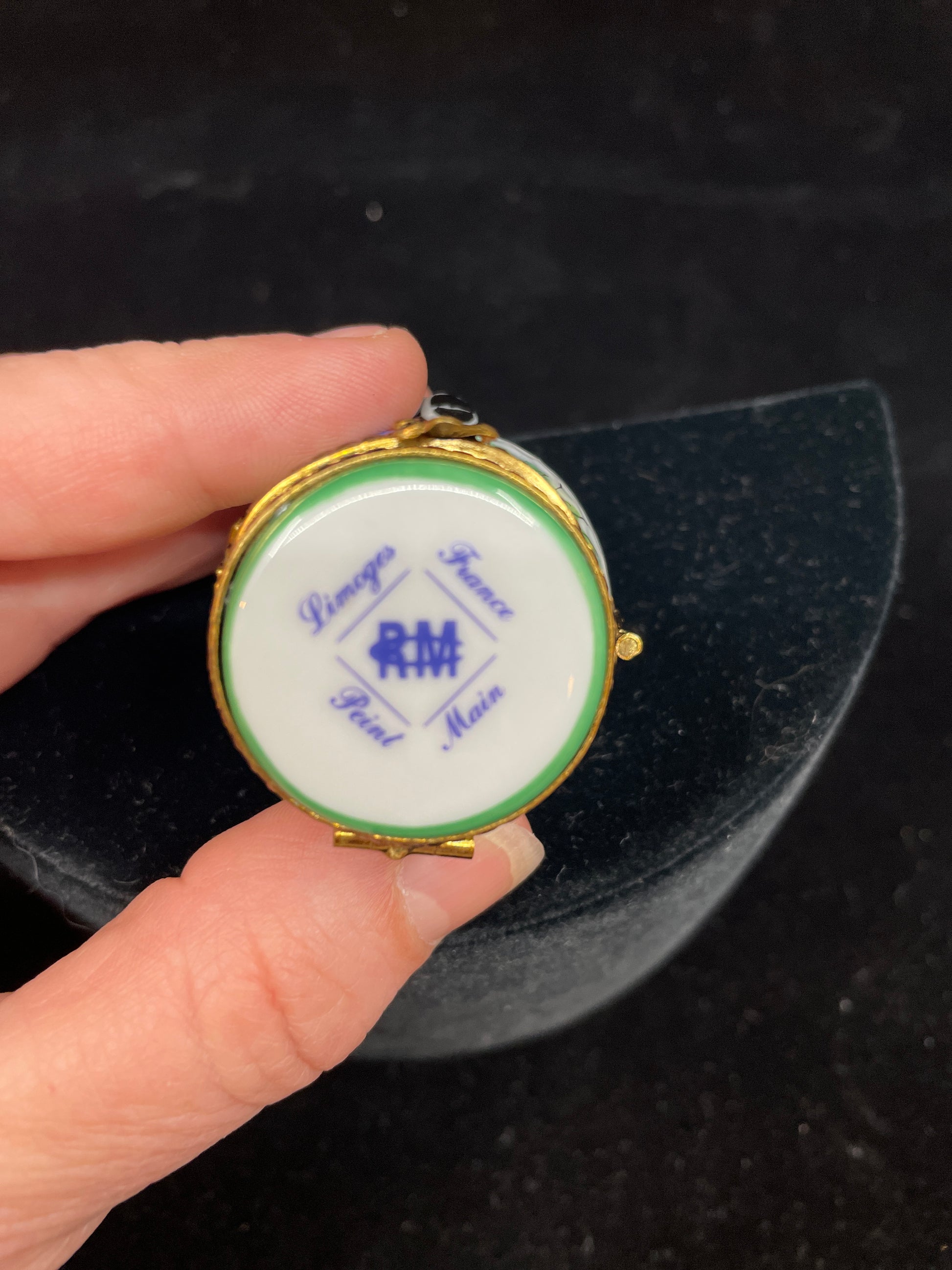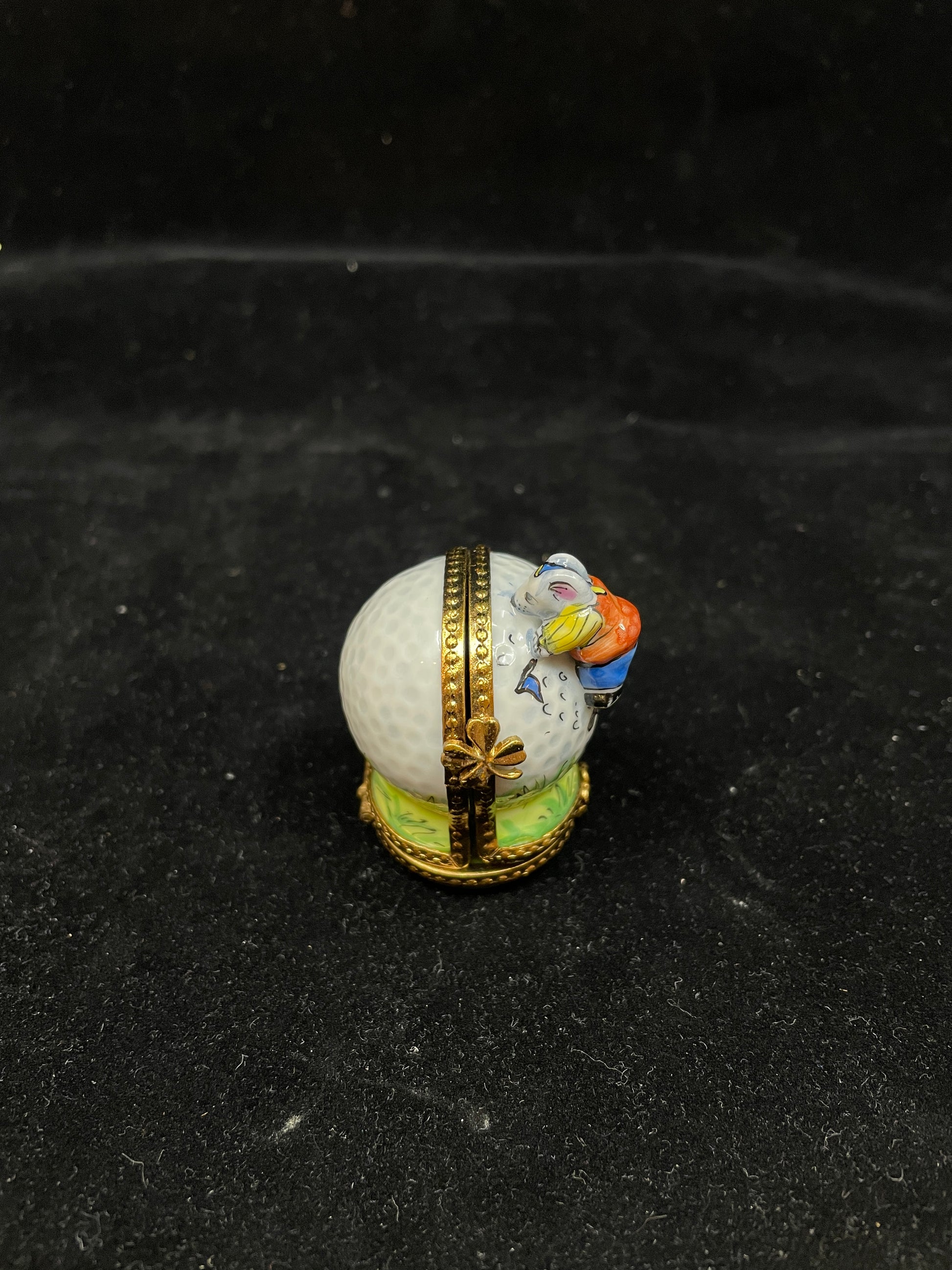 Trinket box featuring a golfing mouse on the exterior of a golf ball by the brand Limoges. Box opens to reveal a colorful golf scene with two mouse golfers. Box is double hinged and opens vertically and at bottom. The clasp of the box is a golden clover. This collectible box is specially designed and entirely hand-crafted by artisans in Limoges, France. Stamped on bottom.