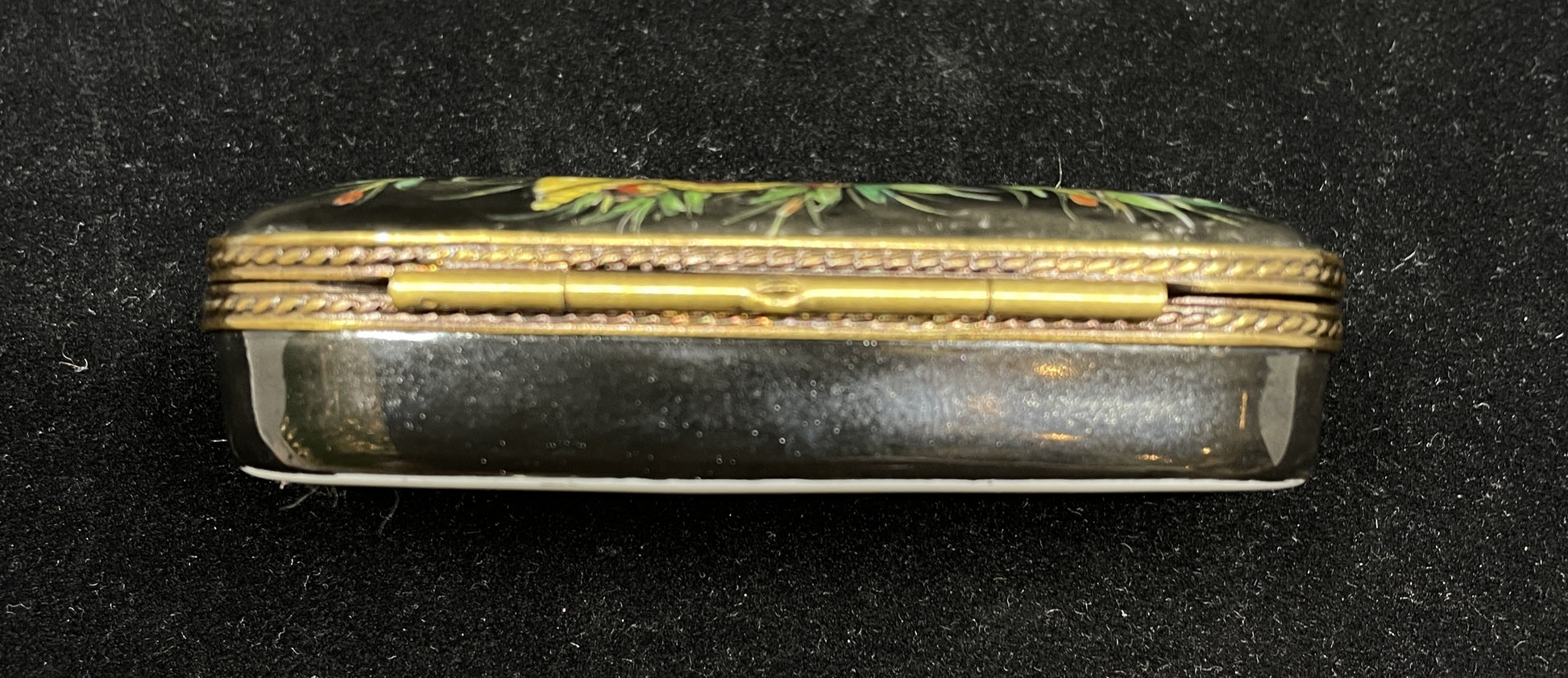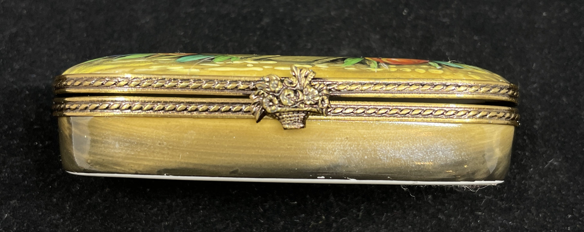 Limoges harvest scene trinket box. Marked on the bottom. This charming oblong shaped piece features an intricately painted top with a dark background. The details on the top include fruits and vegetables, florals, and a basket in the center. The edge of the box is accented with a brass trim and harvest basket clasp decoration. The box opens to reveal a white interior with a single flower in the center of both the top and bottom. A cute and vibrant piece full of character.