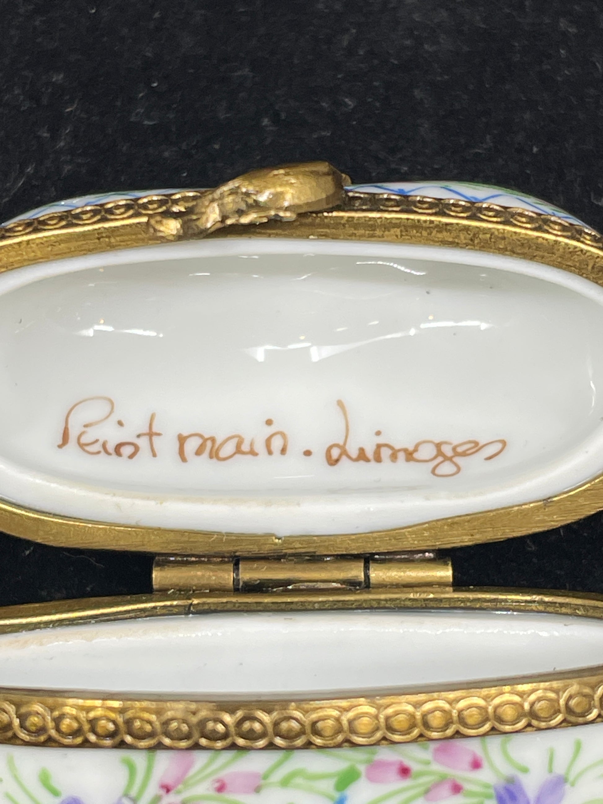 Limoges heart shaped trinket box. Marked on the interior. This beautiful little trinket box features a white base adorned with a variety of pastel painted details. Pink and purple florals on a green wreath of leaves borders the blue crossed details. The outer edge of the box is accented with a brass trim and bird shaped fastener. When opened, the box reveals a plain interior. A beautiful piece that's sure to elevate any collection.