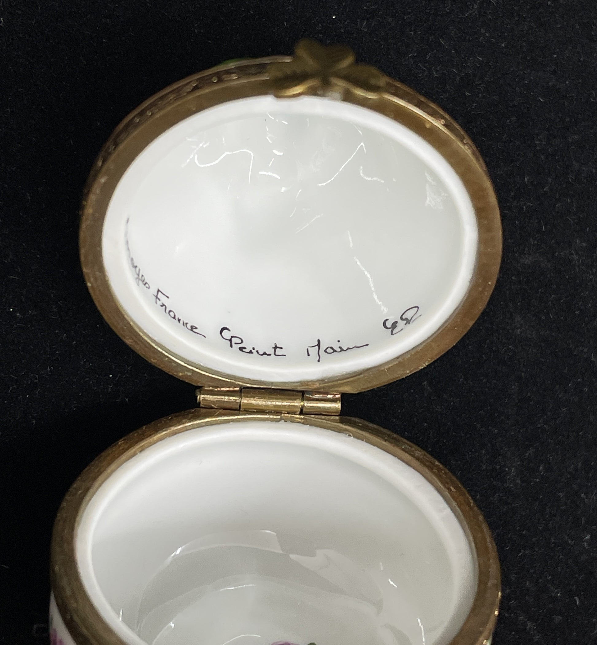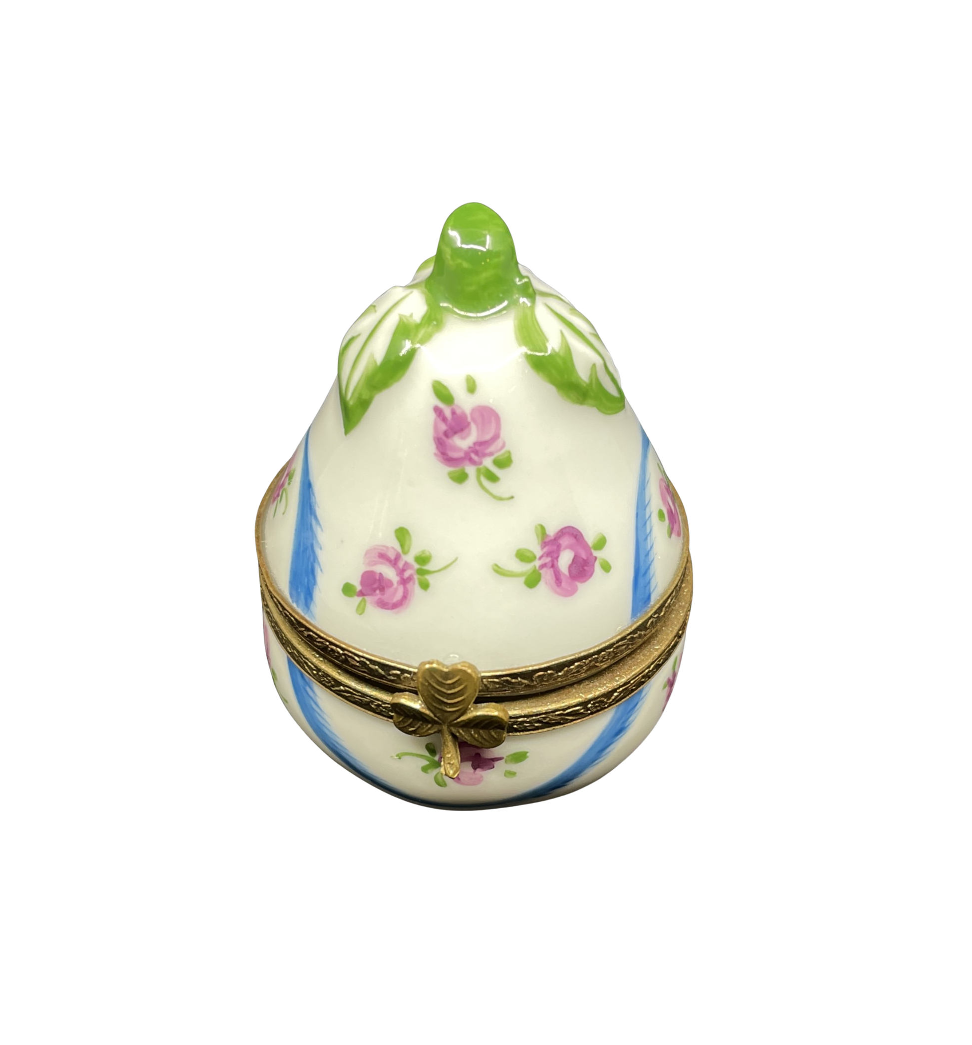 Limoges pear trinket box. Marked on the interior. This charming, pear-shaped piece features a white base painted with pink, blue, and green designs that include flowers and leaves. The outer edge of the box is accented with a brass trim and shamrock clasp decoration. When opened, the box reveals a single flower on its interior base.