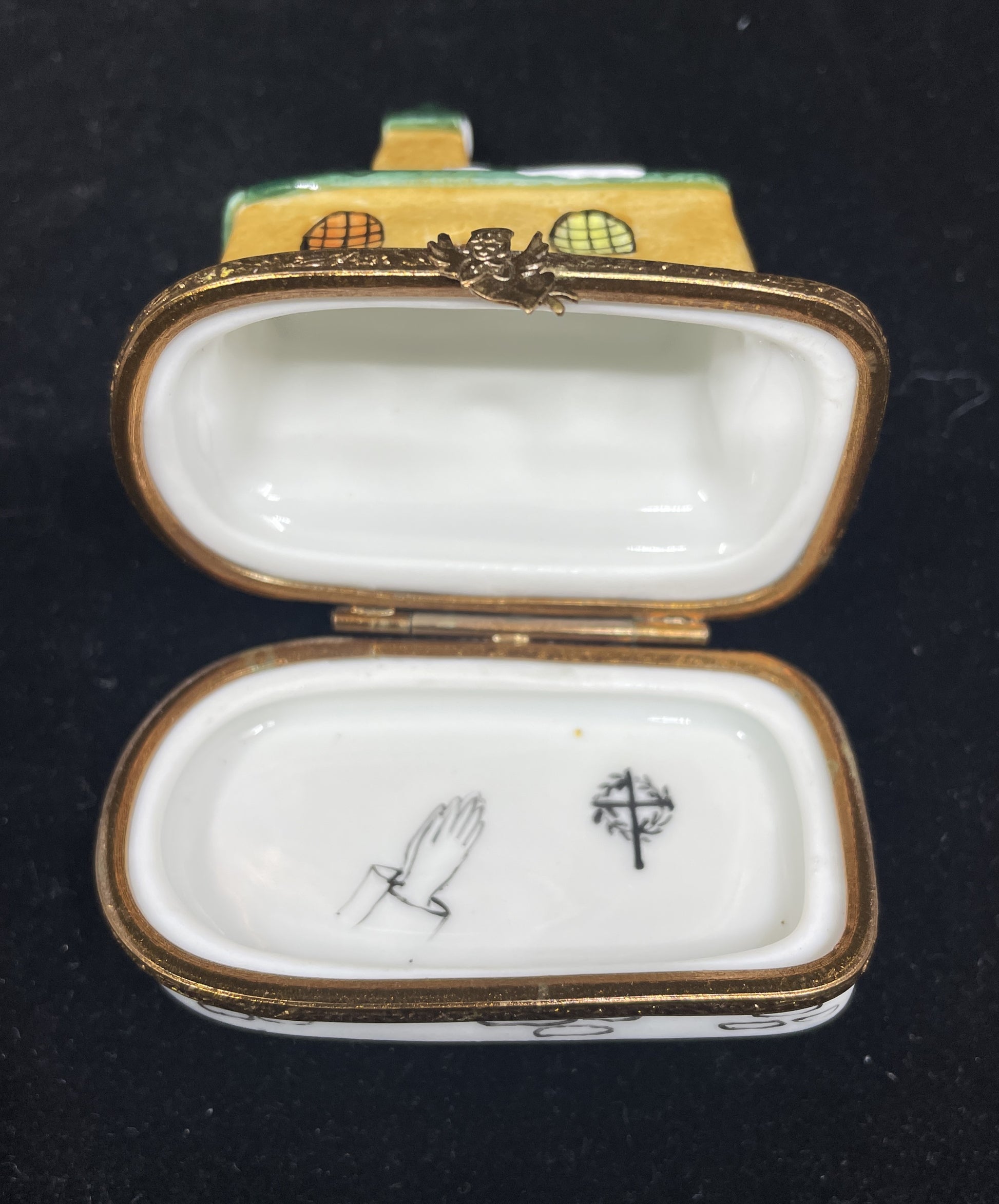 Limoges church trinket box. Marked on the bottom. This charming little trinket box features a little church on a snowy trinket box base. The church has yellow walls and a green roof sprinkled with snow. The base has a painted fence detail that surrounds the church. The outer edge of the box is accented with a metal trim and angel shaped fastener. When opened, the box reveals two small painted details in black - a cross, and prayer hands. This charming little trinket box is charming and full of detail.