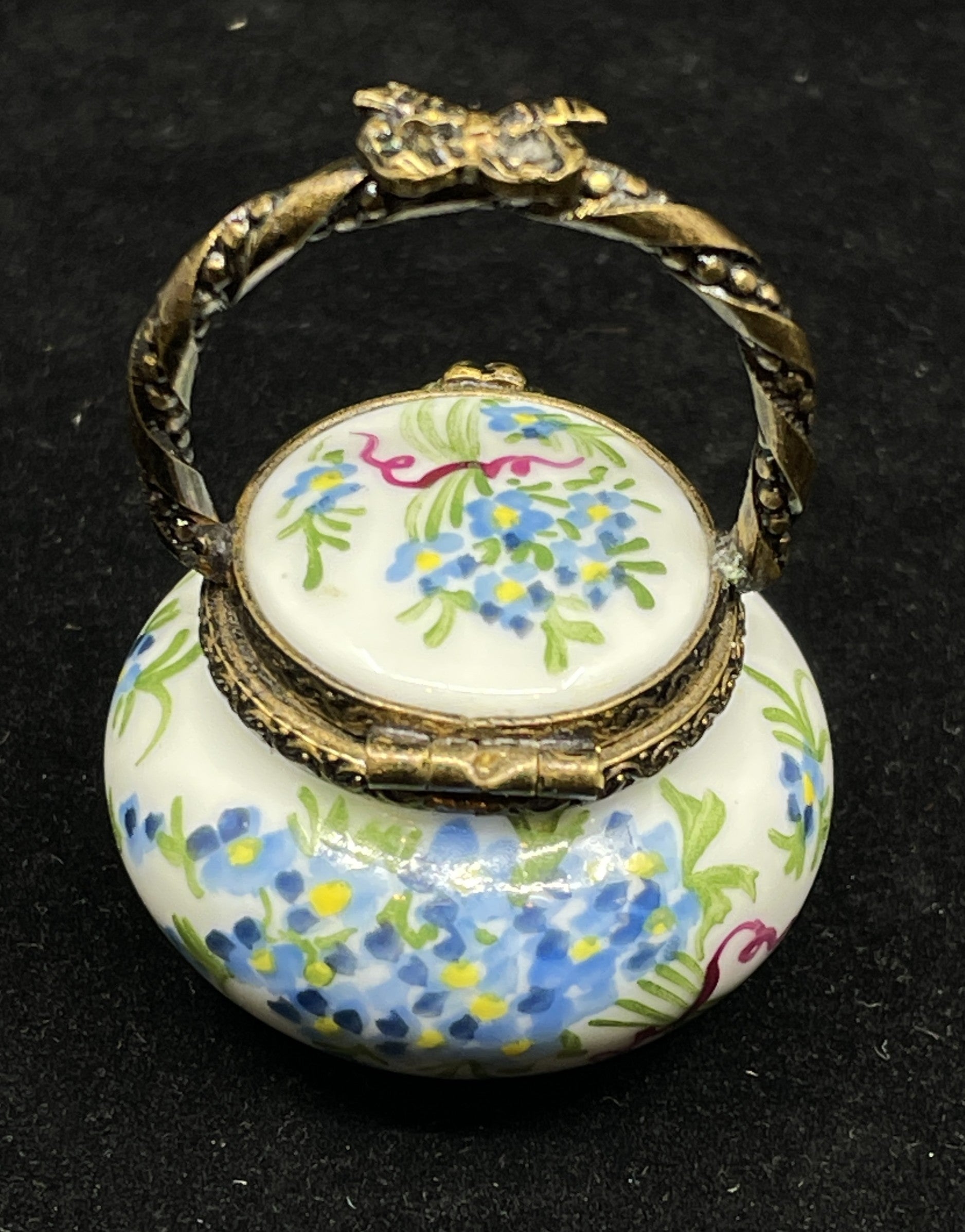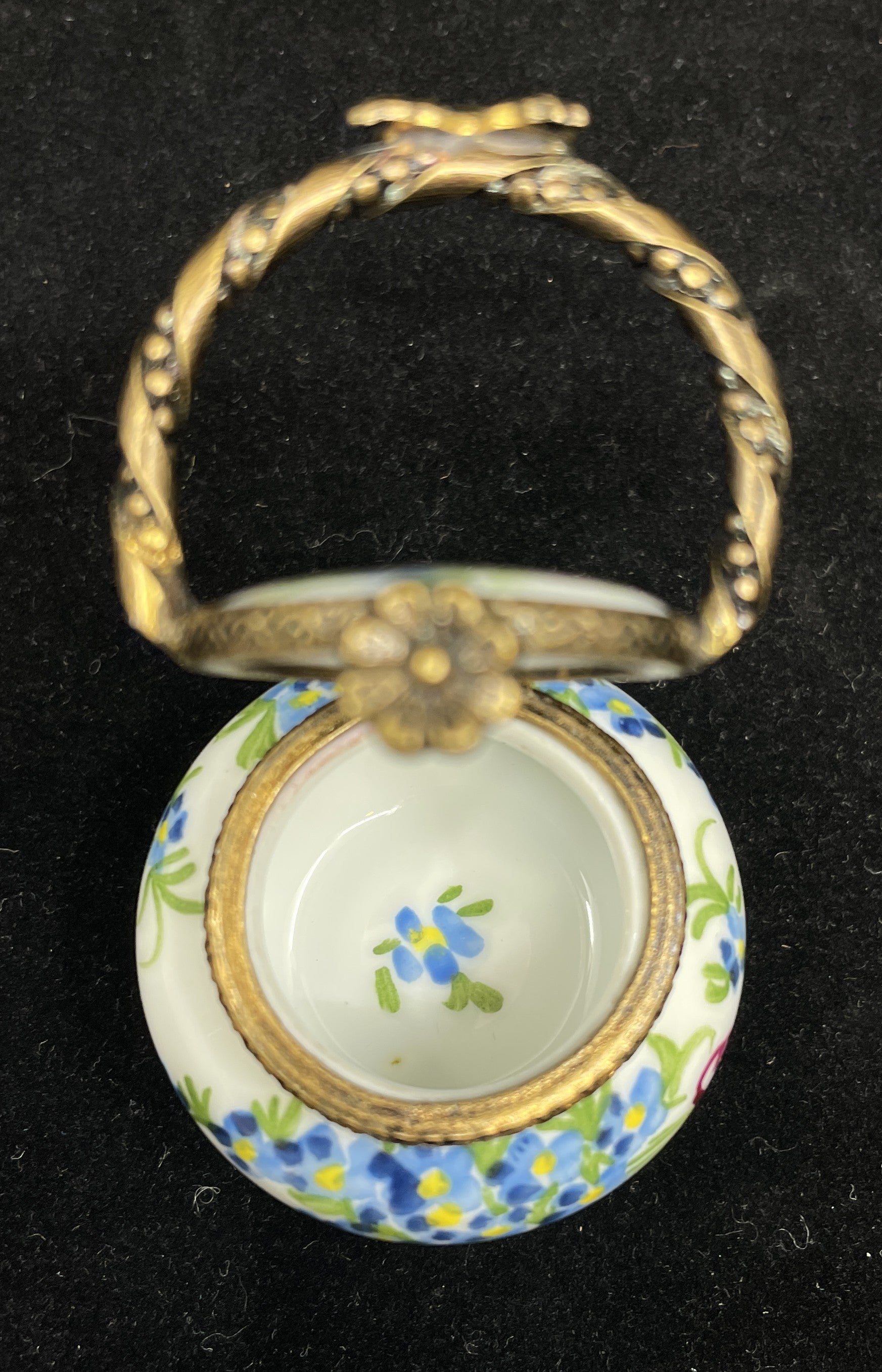 Limoges floral basket trinket box. Marked on the bottom. This charming round box has a white base painted with bright floral details in blue, pink, yellow, and green. The outer edge of the box has a brass trim that connects to the matching handle of the basket. The handle has a bow shaped accent at its highest point, and the trim has a small flower fastener. When opened, the box reveals a small painted flower that matches those on the exterior. A charming little piece that is sure to elevate any collection.