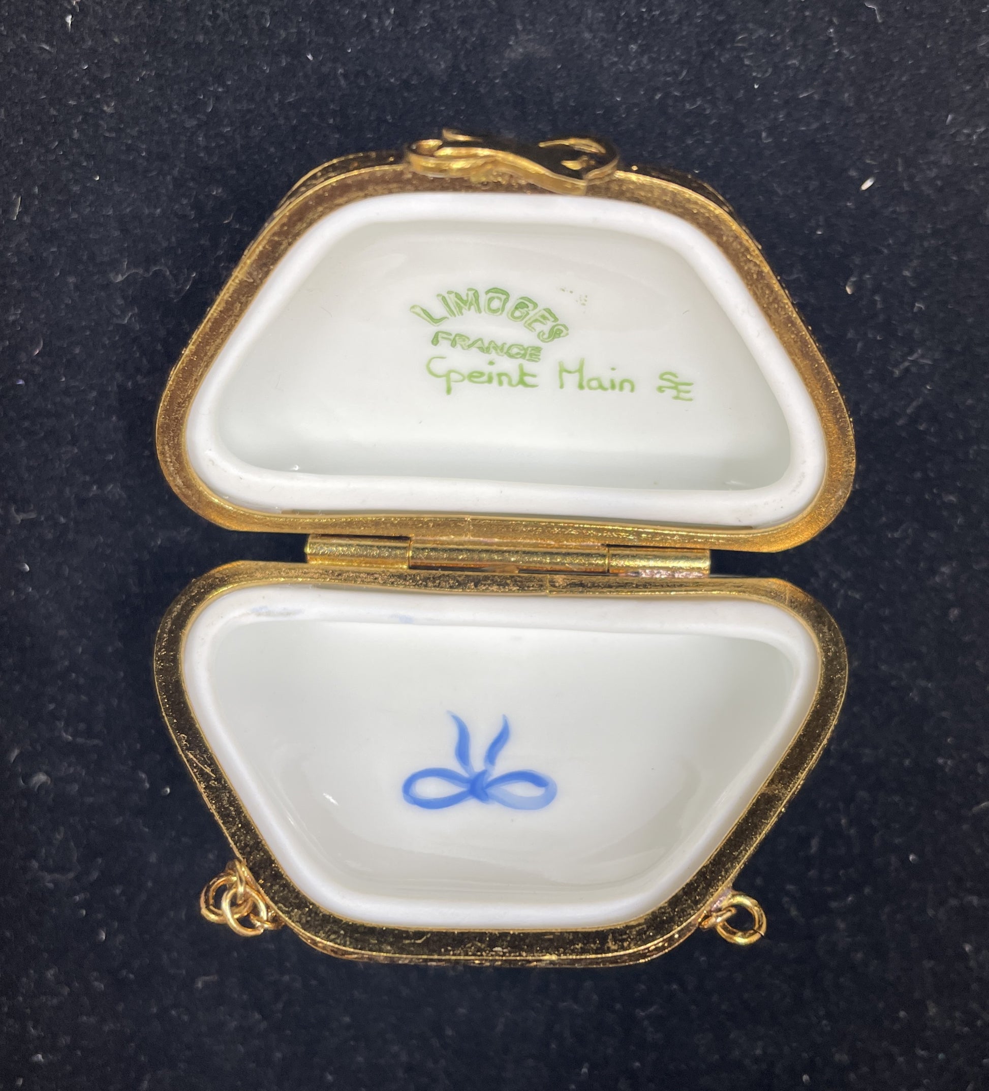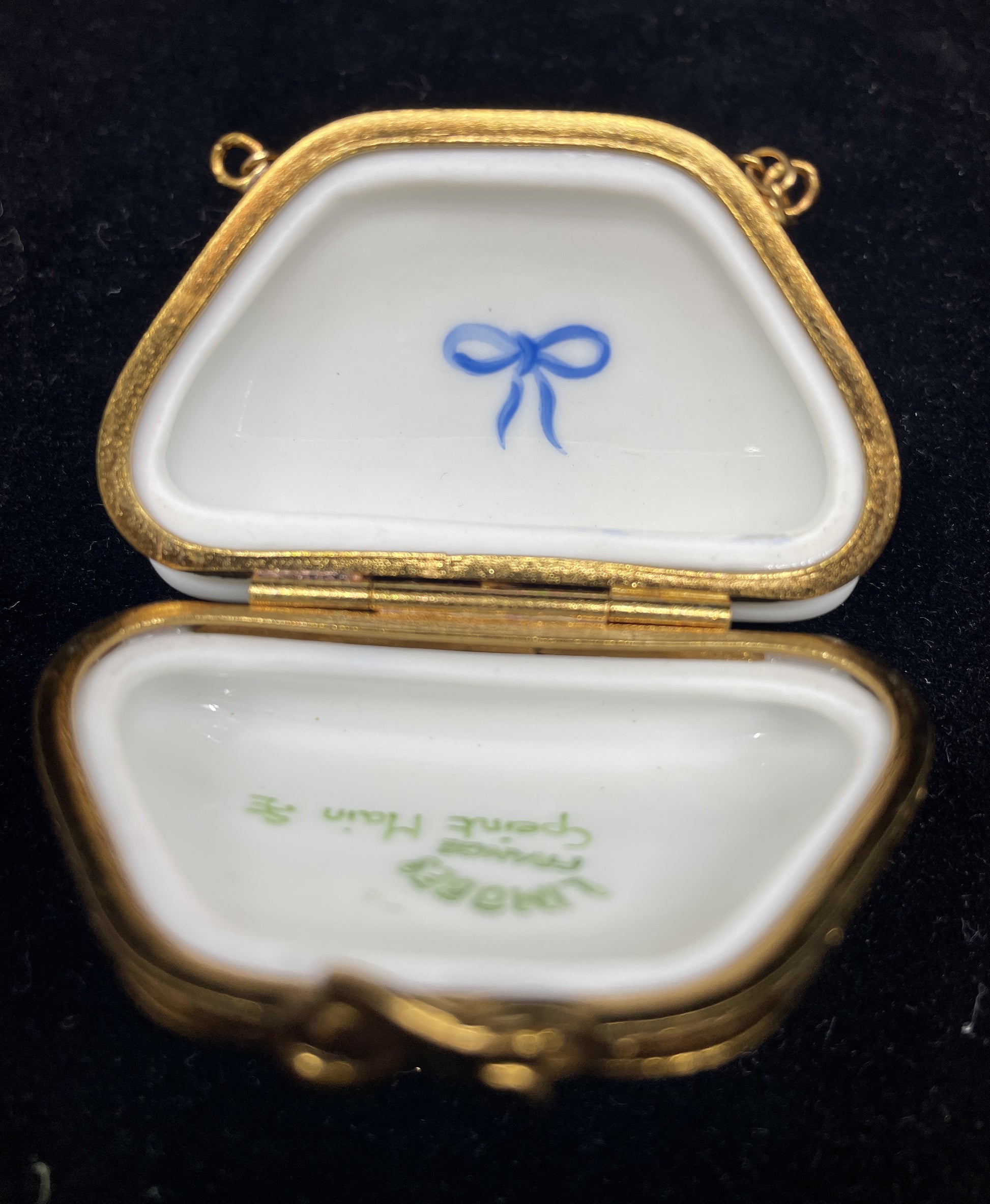 Limoges purse trinket box. Marked on the interior. This beautiful little trinket box is painted with a variety of charming designs including pink flowers with green leaves, blue bows, and gold accents on a white base. The outer edge of the box is surrounded with a brass trim and bow shaped clasp detail. The "handle" of the purse is a chain that matches the trim. When opened, the box reveals a single painted blue bow detail. A charming piece that's sure to elevate a collection.