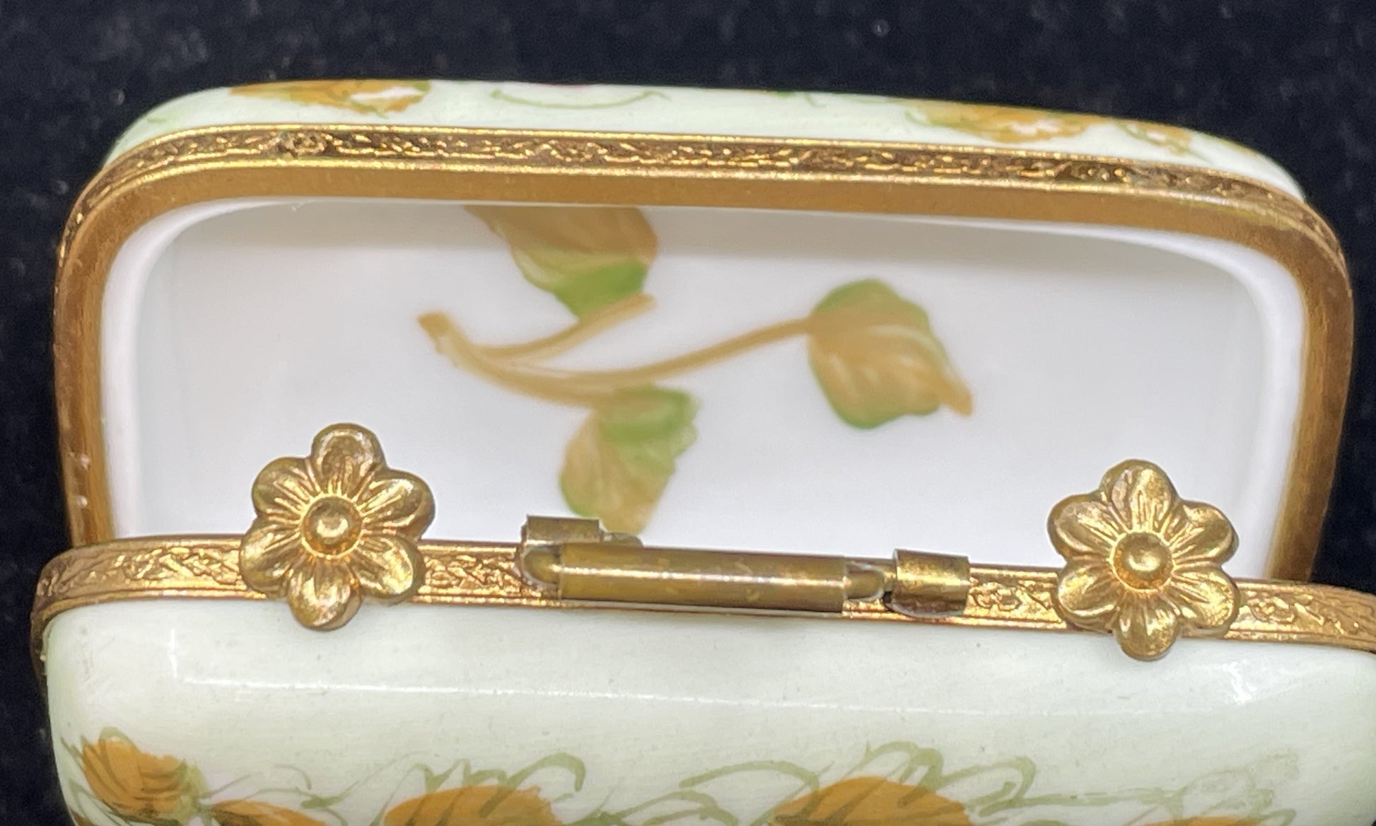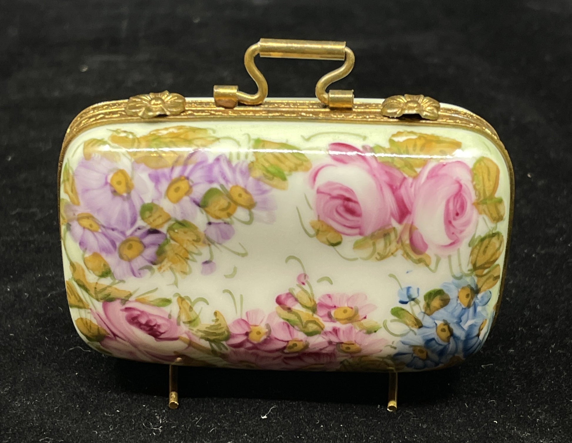 Limoges suitcase trinket box. Marked on the interior. This charming little box is shaped like a suitcase. It sits on small brass legs that help it stand upright, and the top is accented with a small handle to further push the suitcase design. The white base of the piece is beautifully painted on the one side with bright florals in a rainbow of colors. The other side is painted with a ring of green leaves. The outer edge of the box is accented with a brass trim that holds two small flower shaped fasteners. When opened, the box reveals more painted leaves on both the top and bottom. A beautiful little piece that's sure to elevate any collection with its stunning painted florals and charming design.