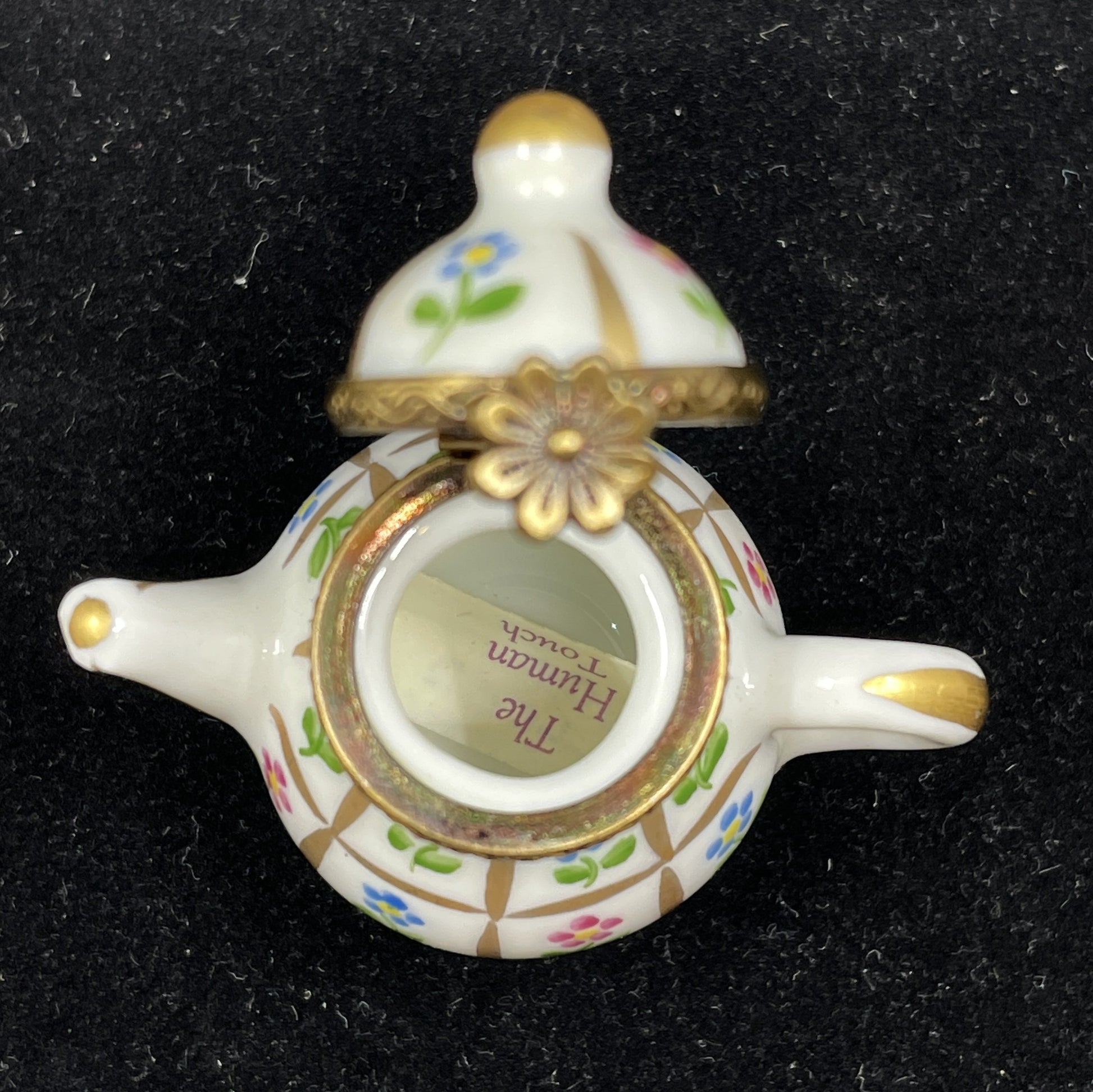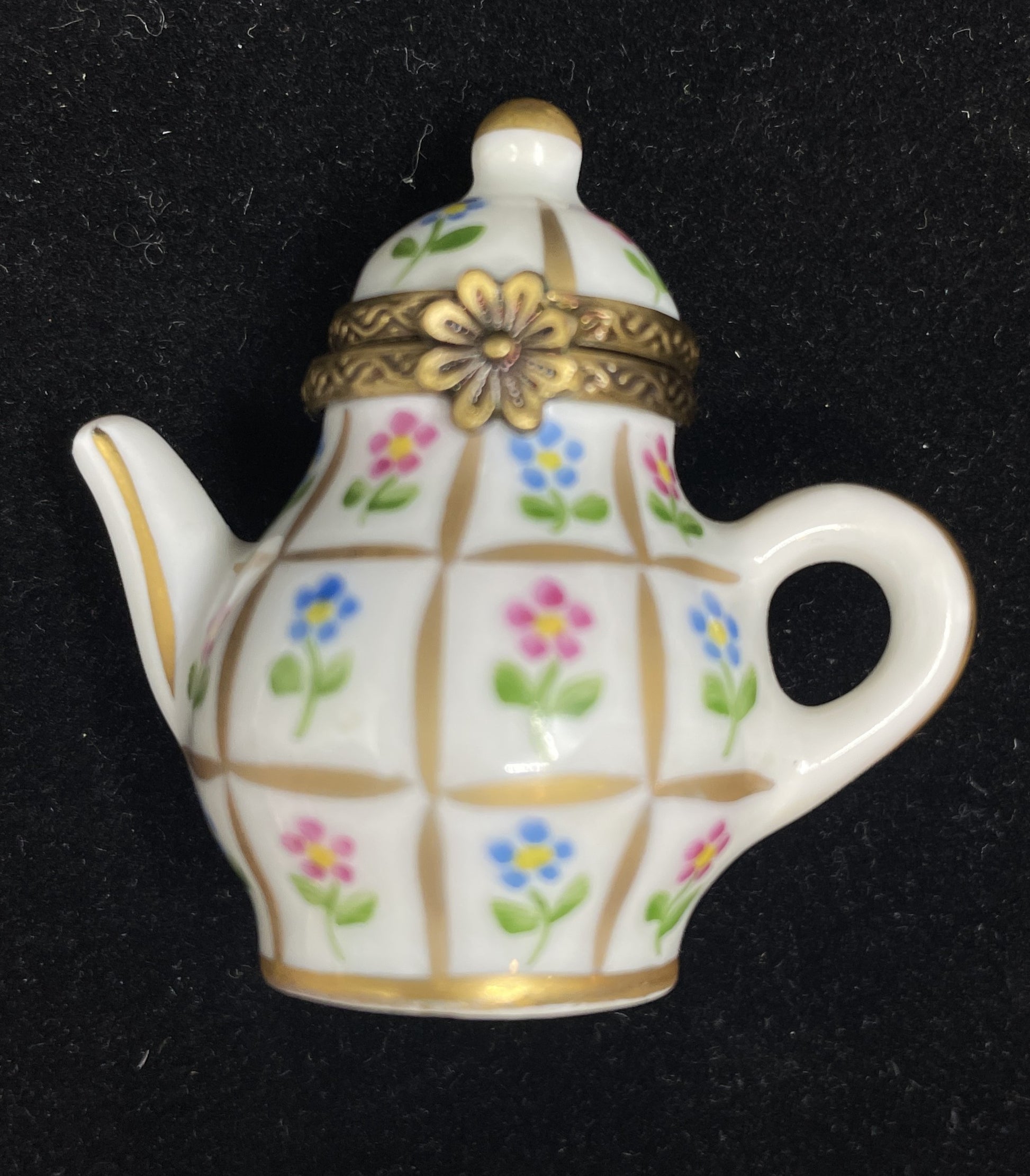 Limoges teapot trinket box. Marked on the bottom. This charming little piece is shaped like a tall teapot. The body and lid are painted with cute little flowers with pink or blue petals, green stems and leaves, and yellow centers. The handle, spout, lid, and space between each flower are accented with gold details. The outer edge of the box is accented with a brass trim and small flower fastener. The box does not have any painted details on the inside but the original tag is placed inside. A charming little piece that's sure to elevate any collection with its unique shape and charming colors.
