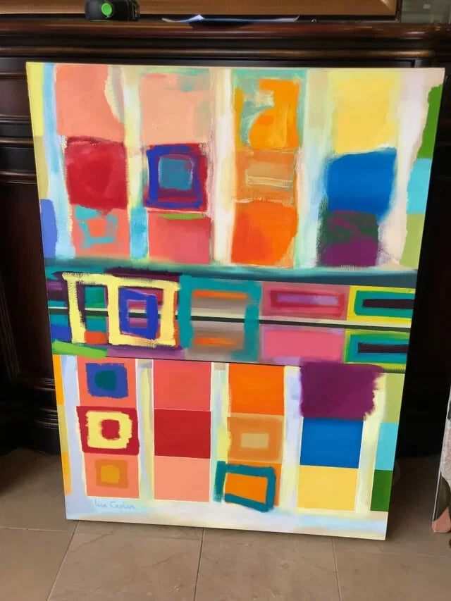Acrylic on canvas abstract titled "Triads" by Lisa Caplan. Art features a thick vertically hung canvas with colorful block and square shapes. Signed by artist lower left.
