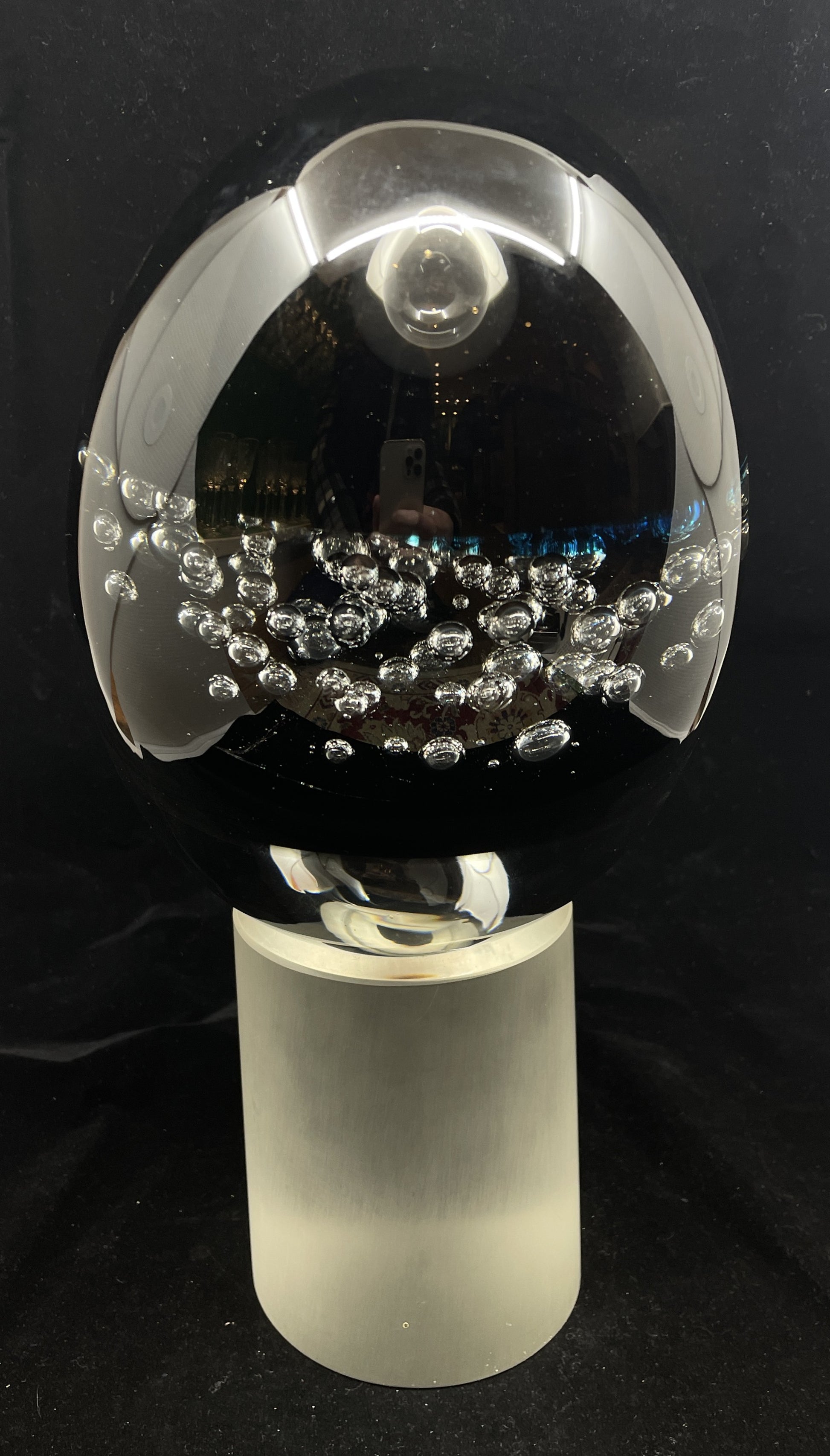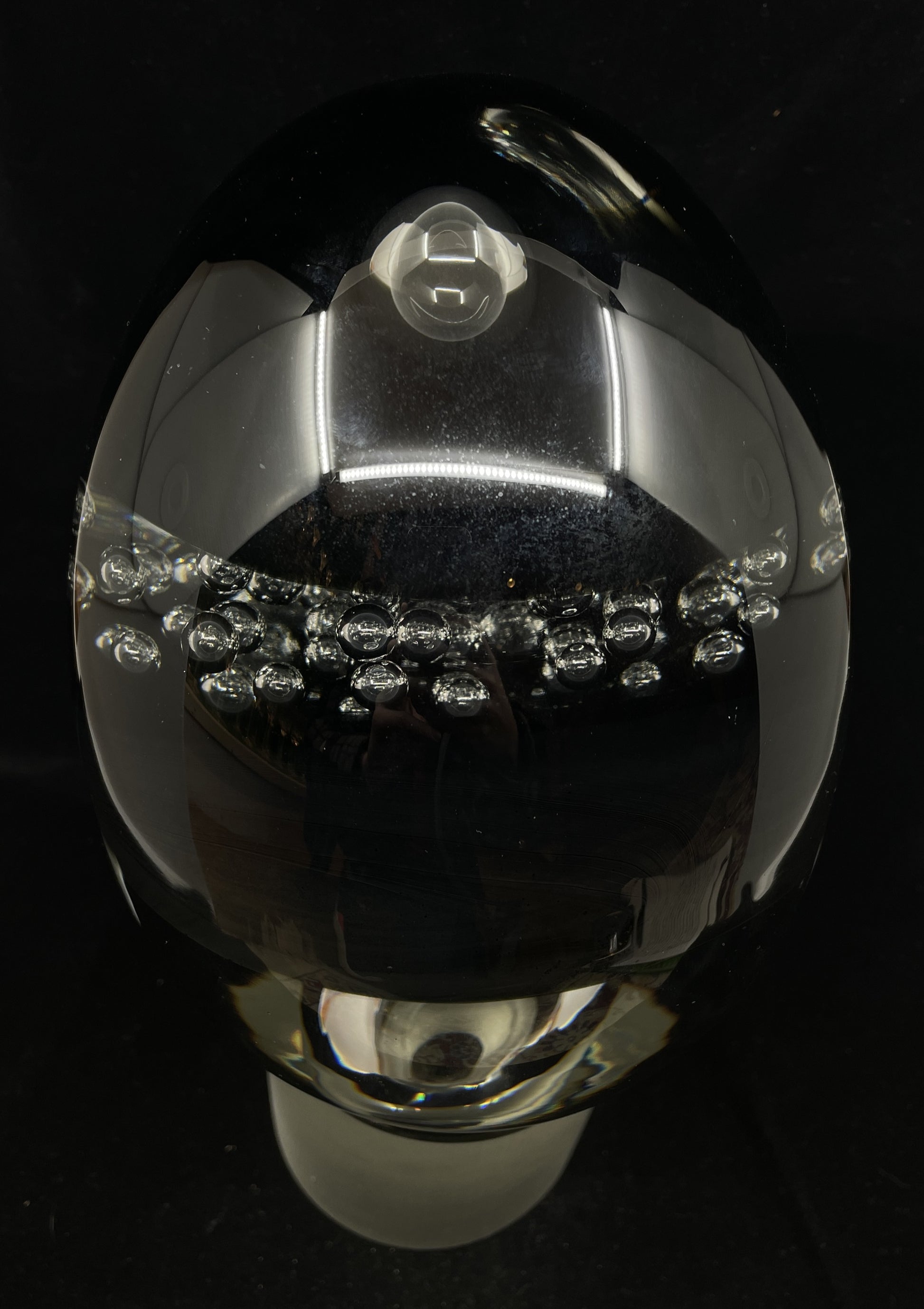 Livio Seguso Murano glass egg on pedestal. Signature incised on the bottom. Livio Seguso was born in Murano, Italy and still works there to this day. He has mastered the art of glassmaking and emphasizes absolute forms that do not represent any existing thing, rather choosing to create dreamlike, never before seen experiences. This particular piece has an egg-like form on a cylindrical base. The base is frosted, and cut on a bias that gives the entire piece a weightless, tilted feel. The egg is angled similarly. The egg is also full of details that include bands of dark and clear glass. The center notably is filled with many light-catching bubbles. A touch of blue can be seen from a certain angle, but otherwise the piece has a black and white, space age appearance. This gorgeous piece is sure to draw eyes with its unique, out-of-this-world look.