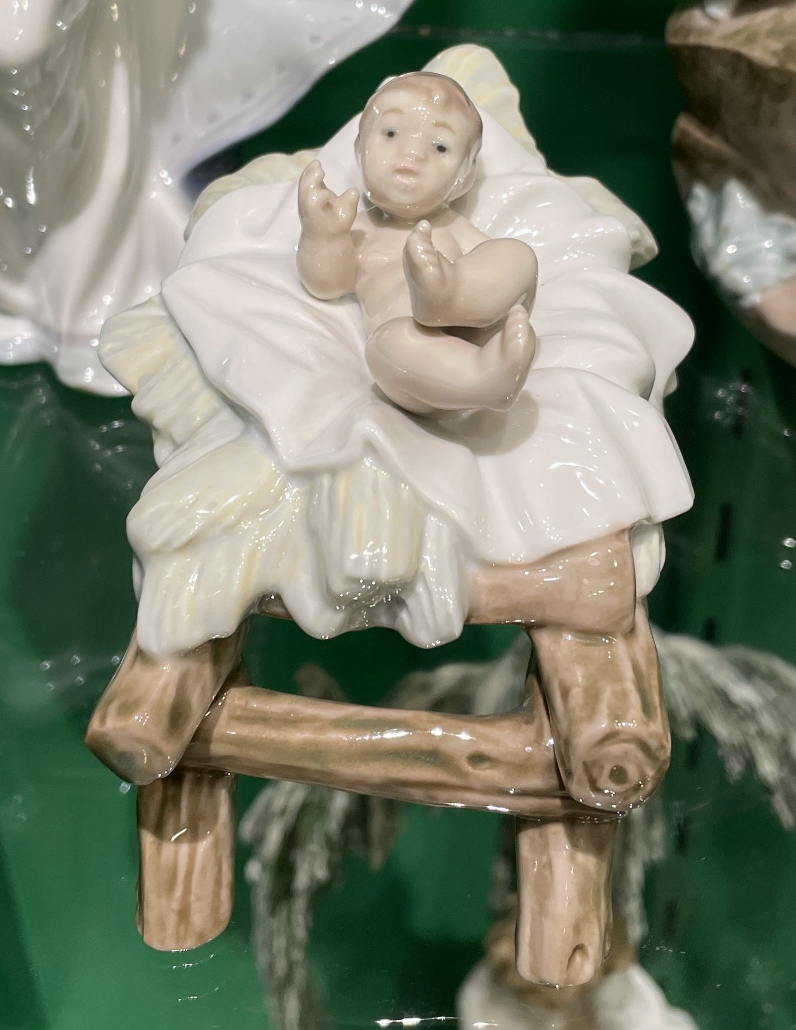 Rare Lladro 1990s six piece Nativity scene. Stamped with the logo on the base of the piece. This beautiful set of porcelain figures includes a shepherd boy, Mary, Joseph, baby Jesus, a donkey, and a cow. Each piece is painted in gorgeous milky colors that really bring the scene to life. The pieces are beautifully detailed with intricate textures and additional storytelling scenery. A beautiful set that's sure to elevate a Christmas setting.