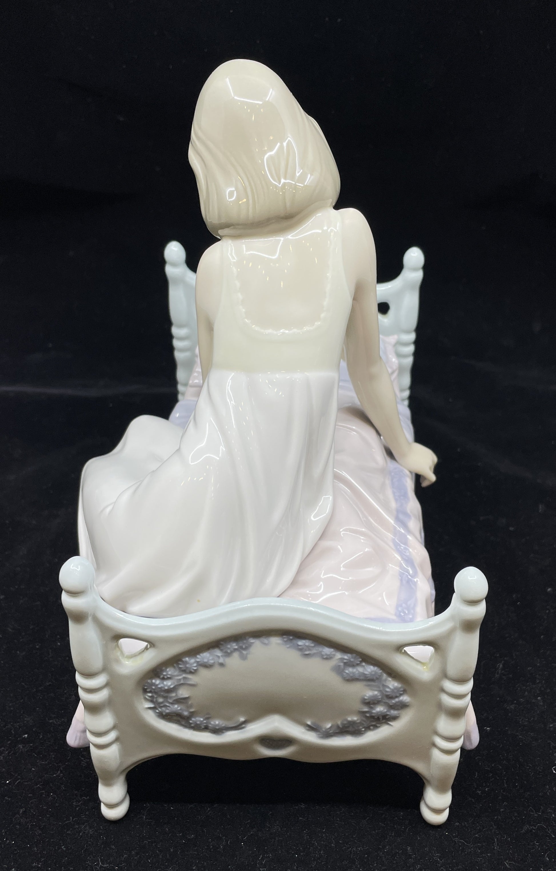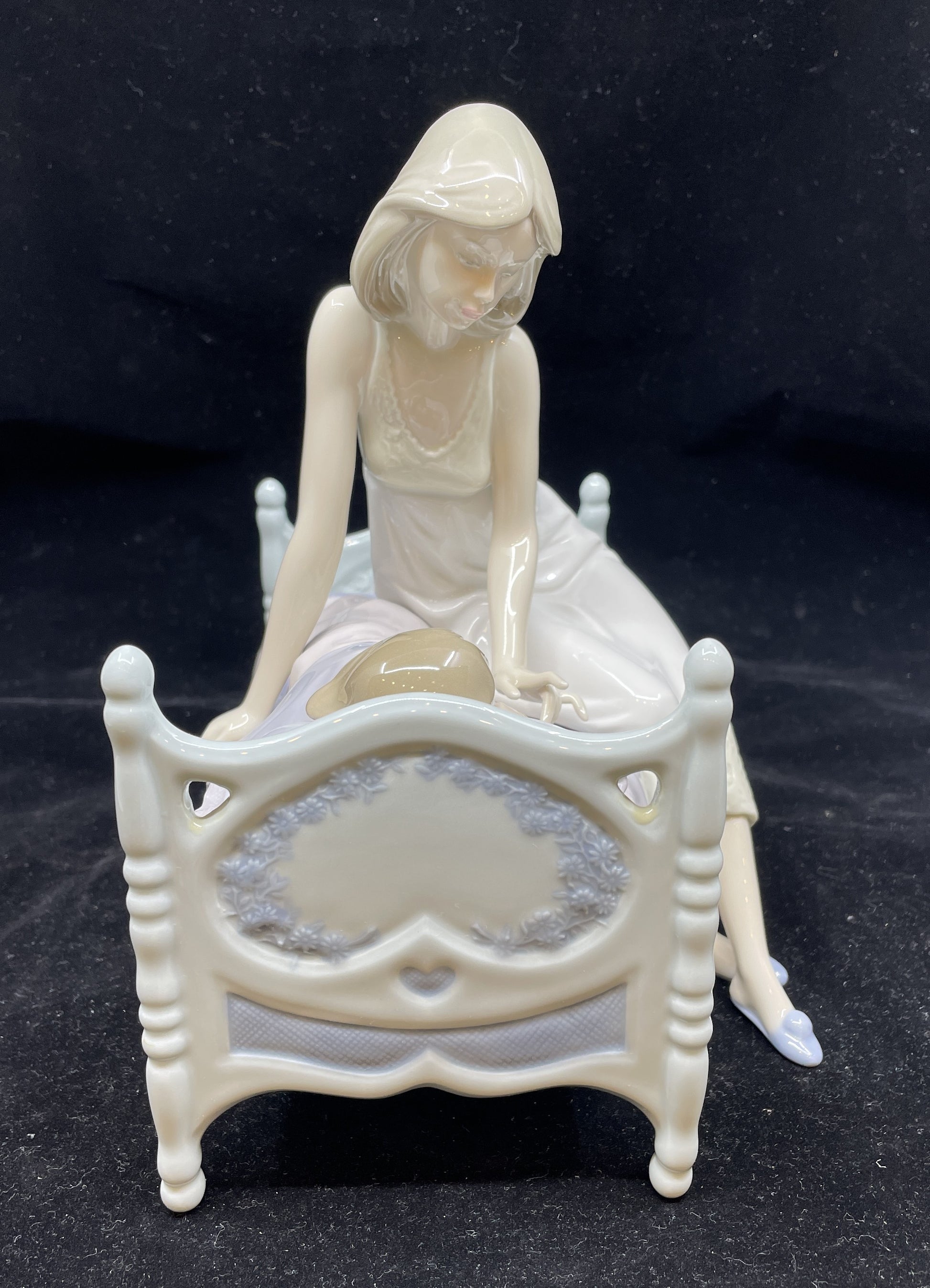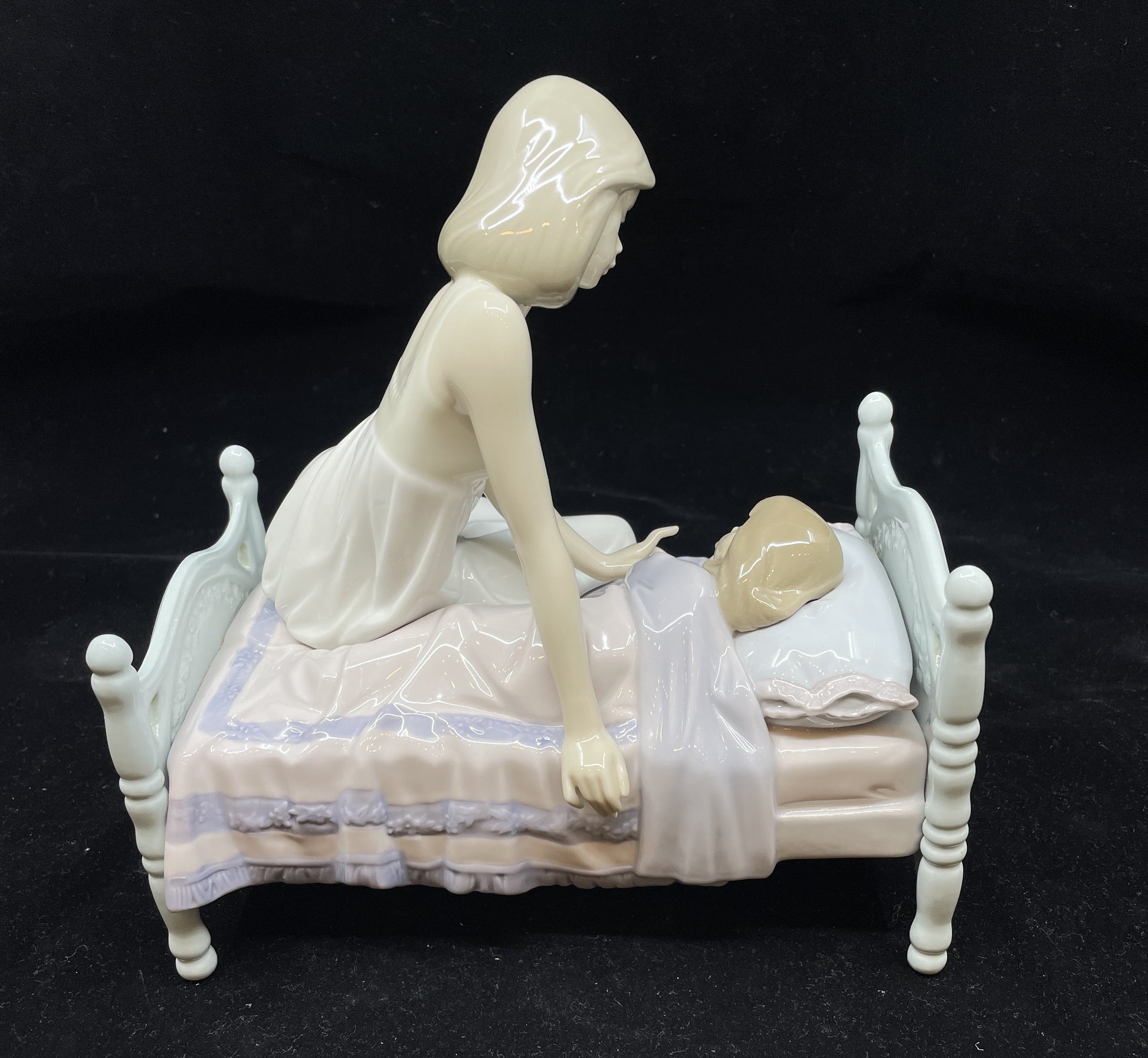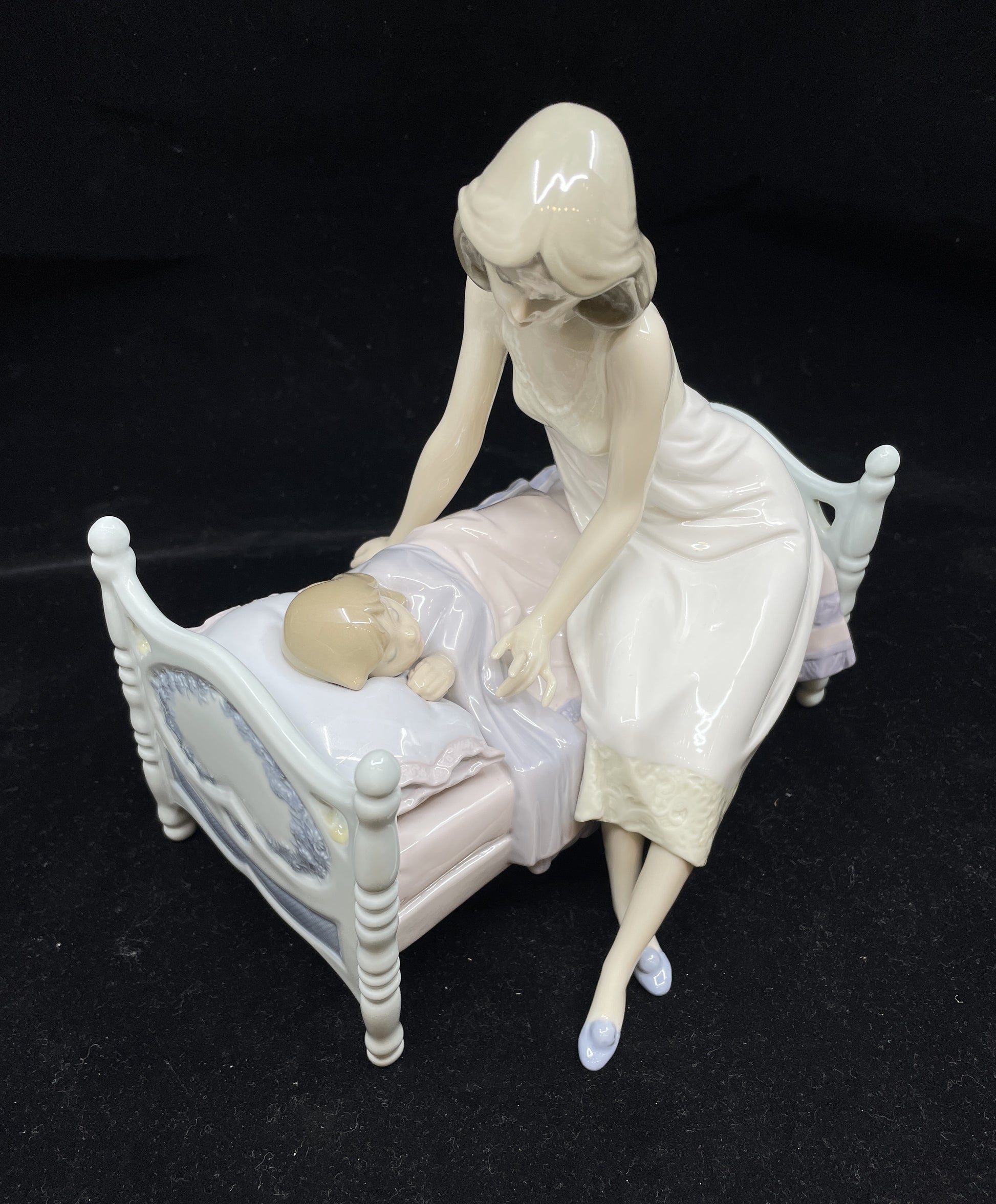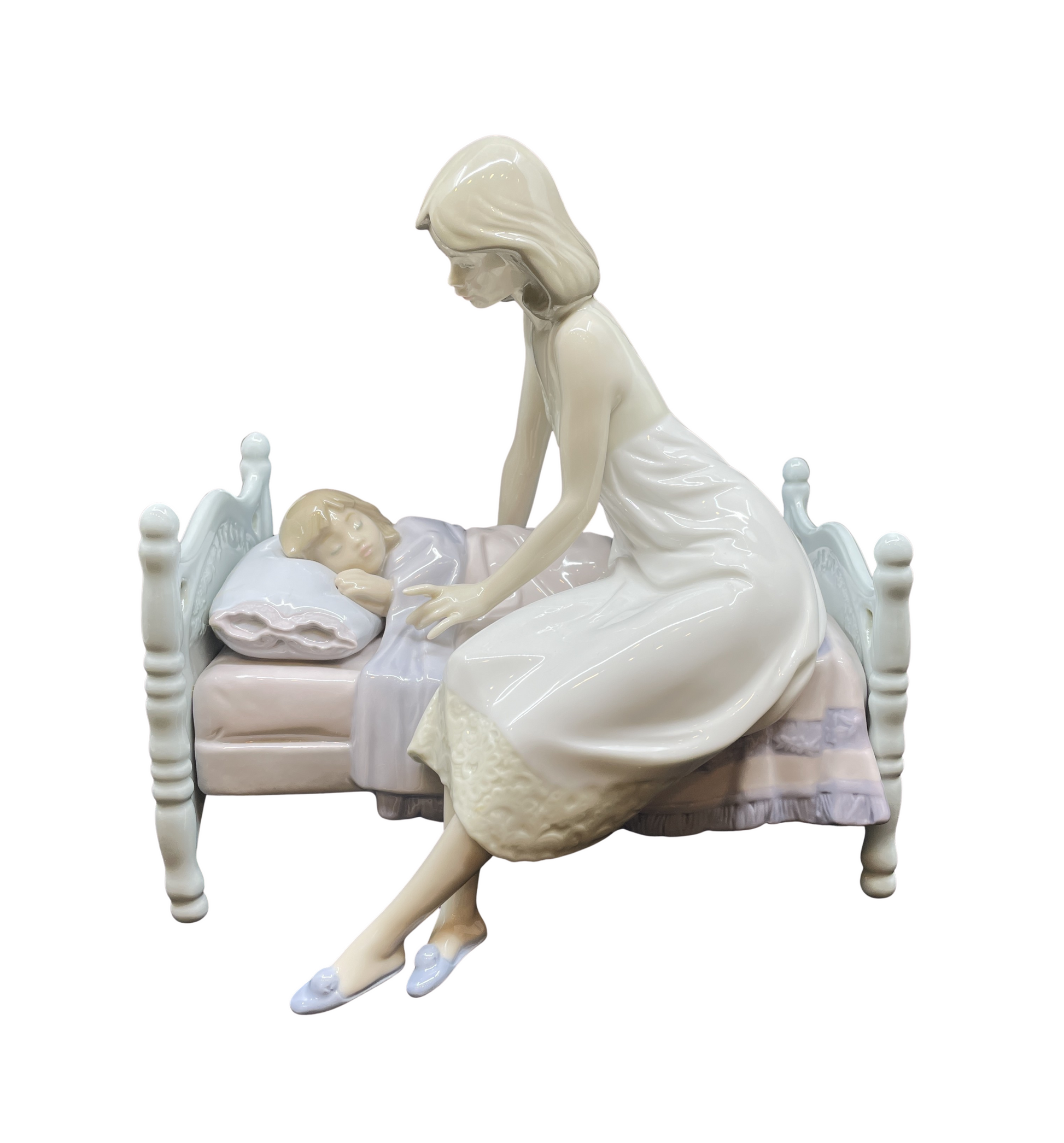 Lladro "Sleep Tight" sculpture. Stamped and numbered #5900 on the base. Includes original box. This precious piece depicts a mother tucking her daughter into bed. The piece is painted in milky neutral colors with hints of pastel pink.