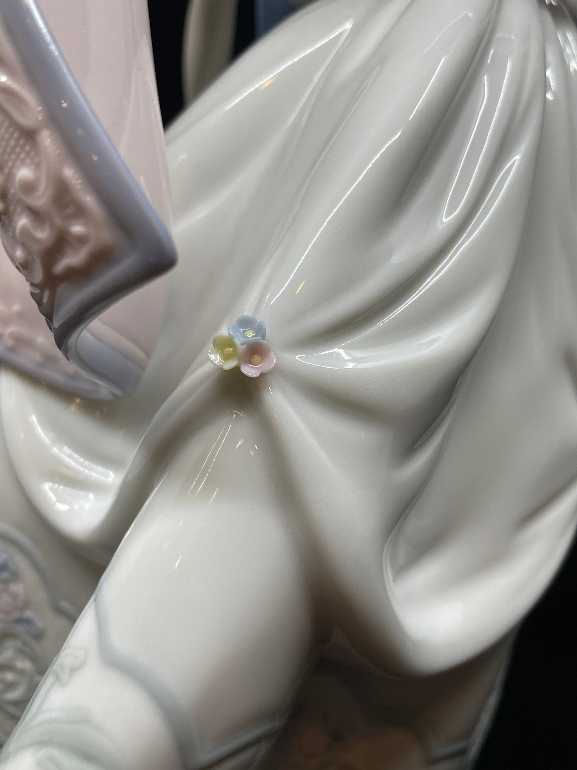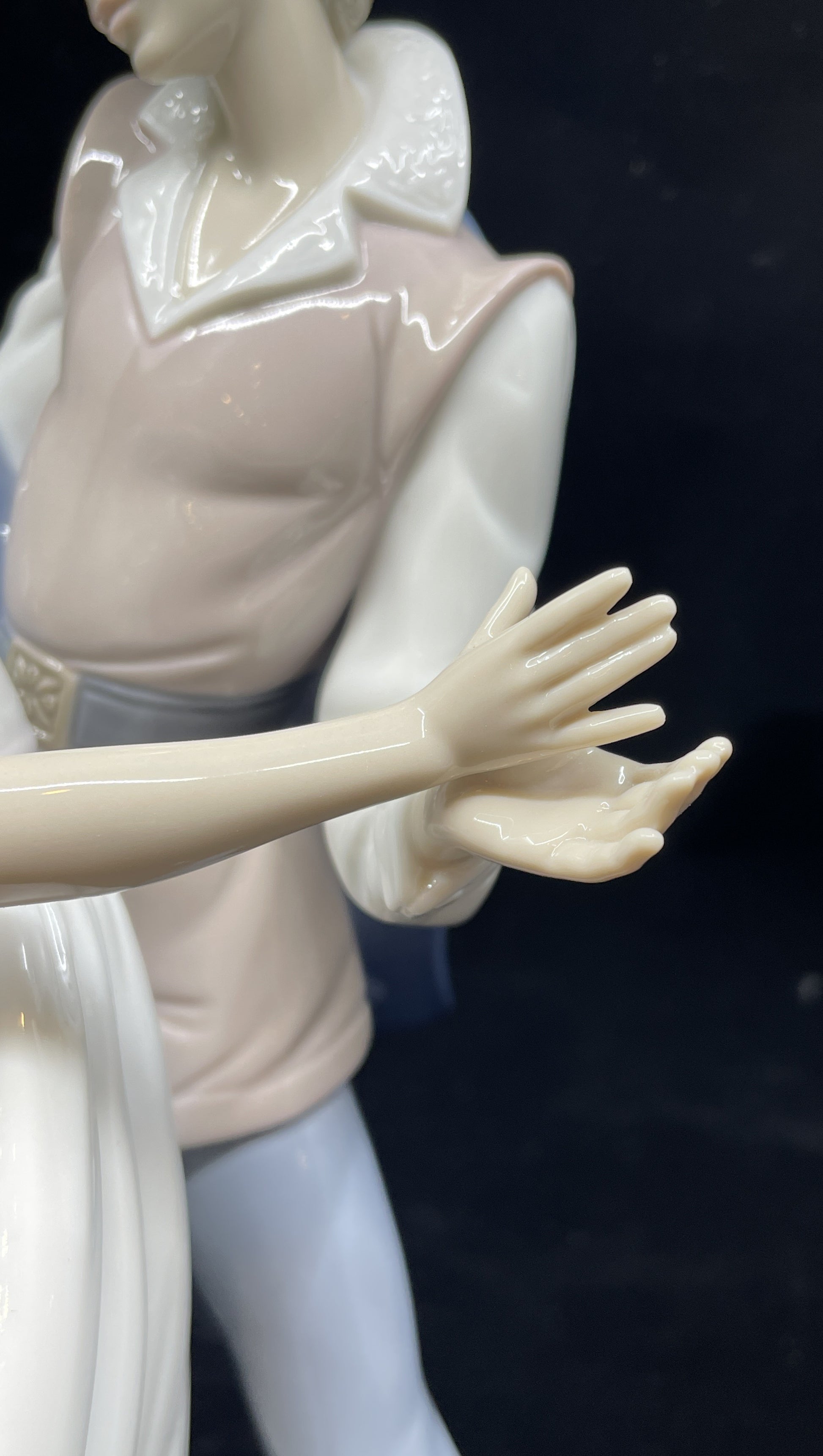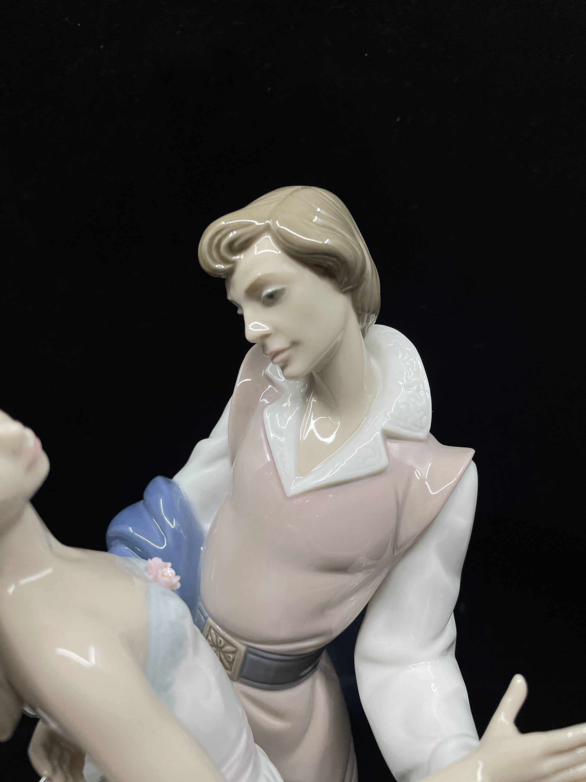 Lladro "A Dream Come True" figure with box. This beautiful figure depicts a prince and princess dancing. The girl wears a beautiful gown with subtle pastel flower accents along with a pink veil and a tiara. The boy wears a brown tunic, light blue pants, black boots, and a cornflower blue cape that is draped over his one arm. The two have peaceful expressions on their face, enjoying their "dream come true" moment. A beautiful piece that's sure to add a touch of fantasy to any collection.