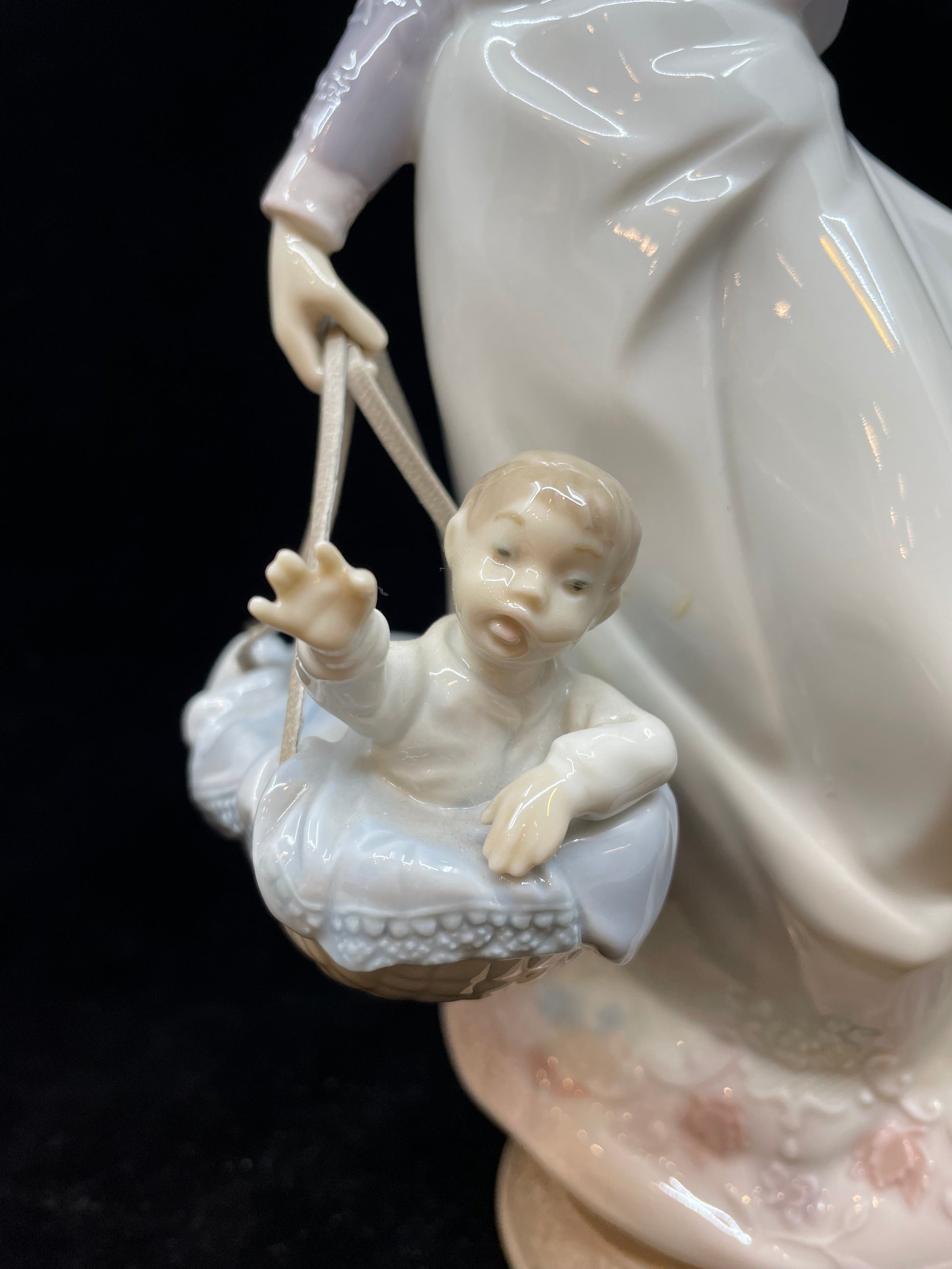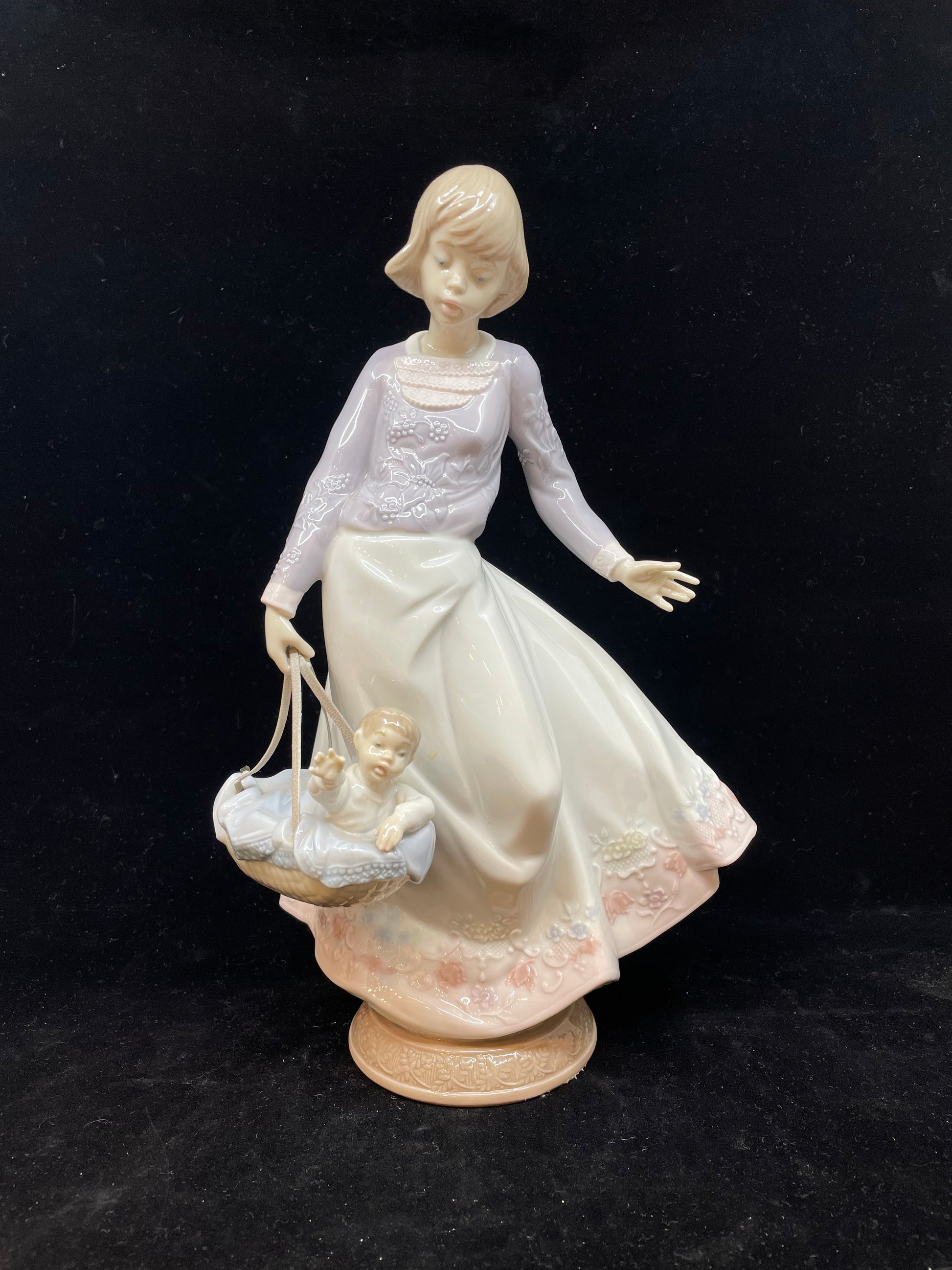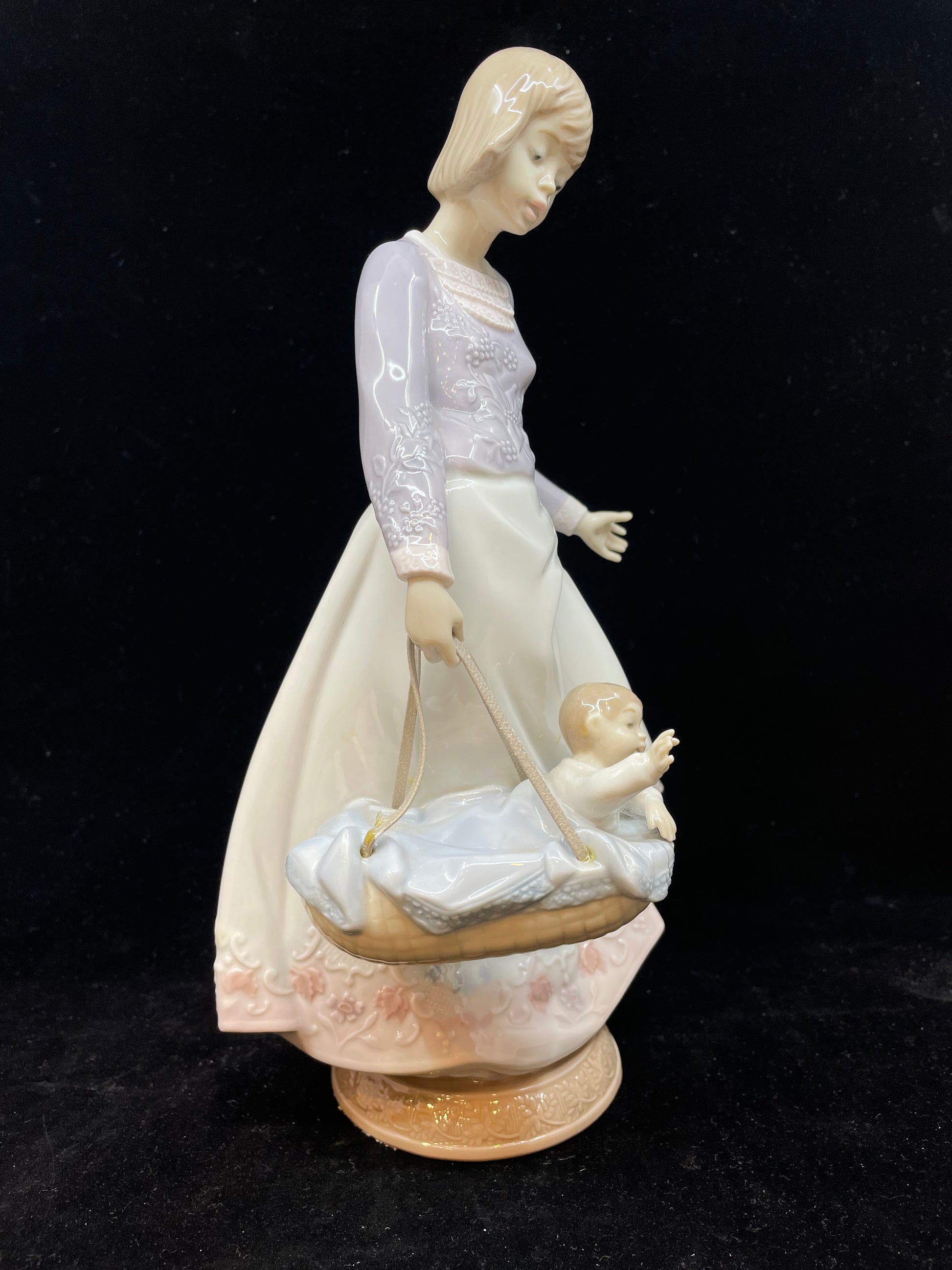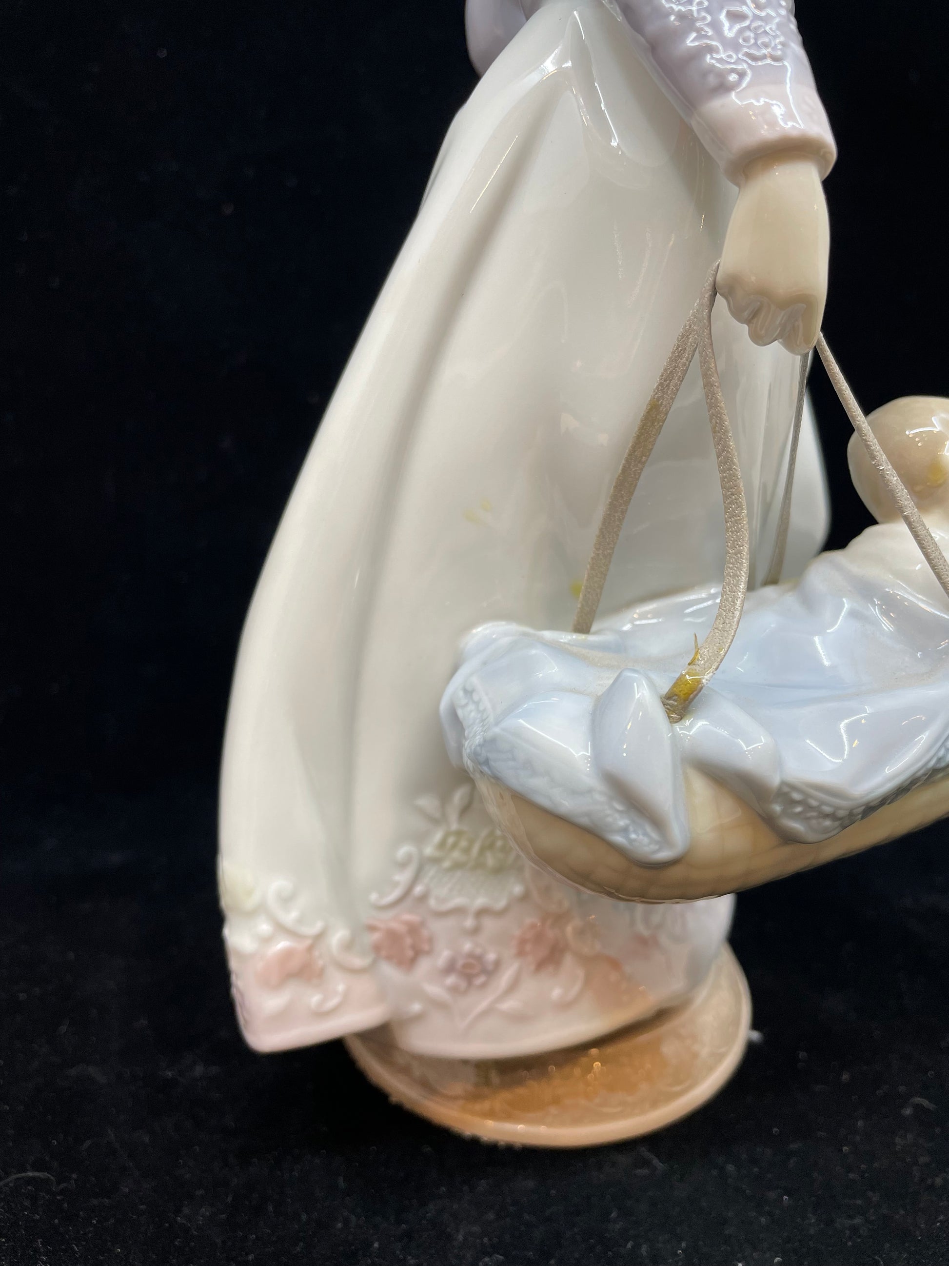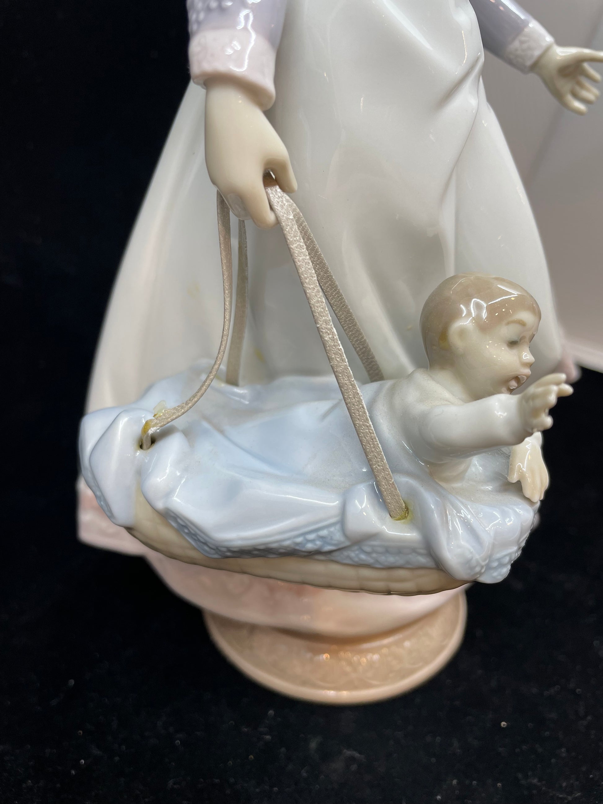 This rare porcelain figurine by Lladro, titled "Away We Go," was retired in 1994. It features a girl carrying a baby in a bassinet. The girl is wearing a purple sweater with a long, white, flowy skirt. It is branded Lladro and numbered on the base of the figurine. Includes the original box.