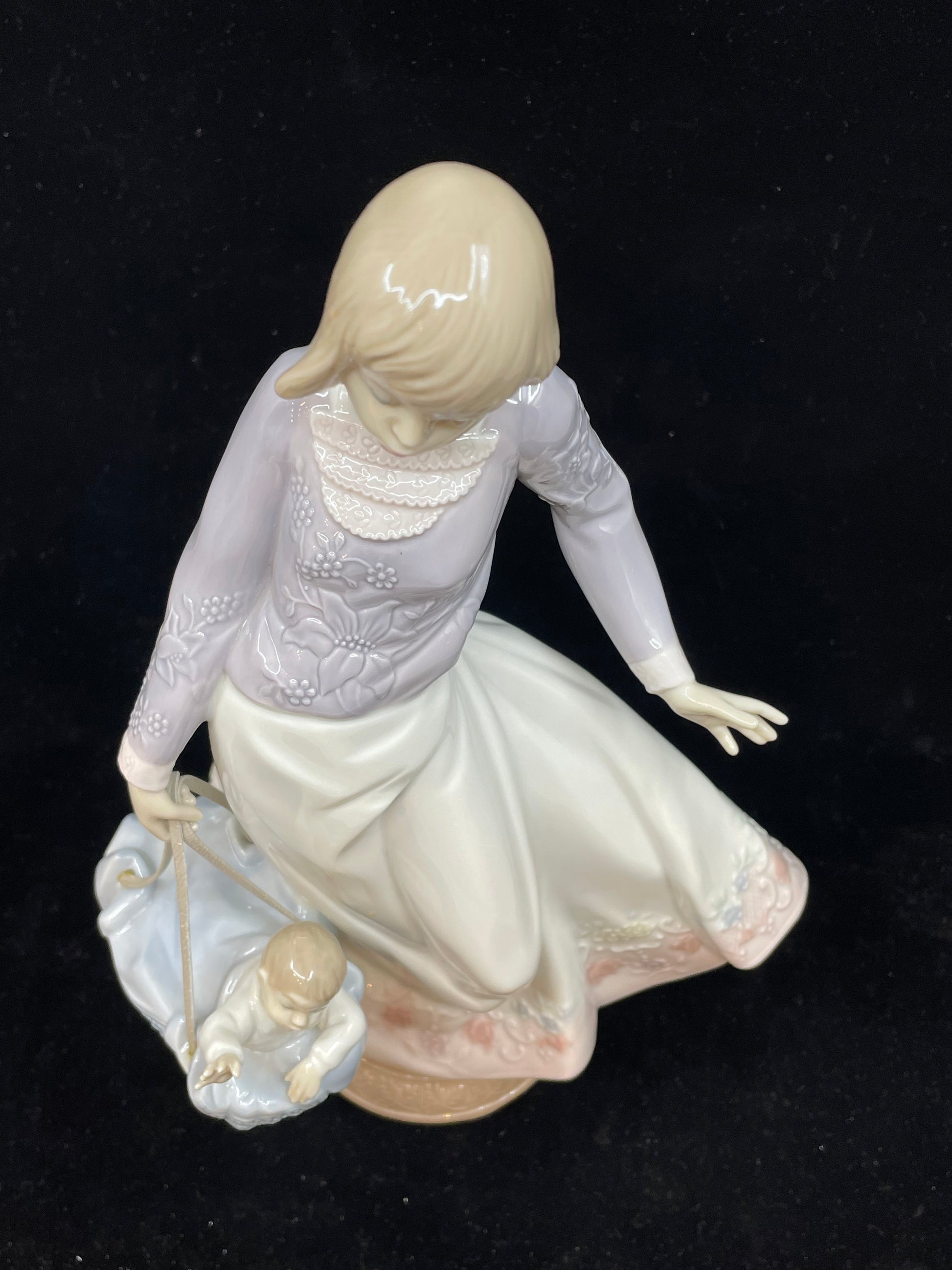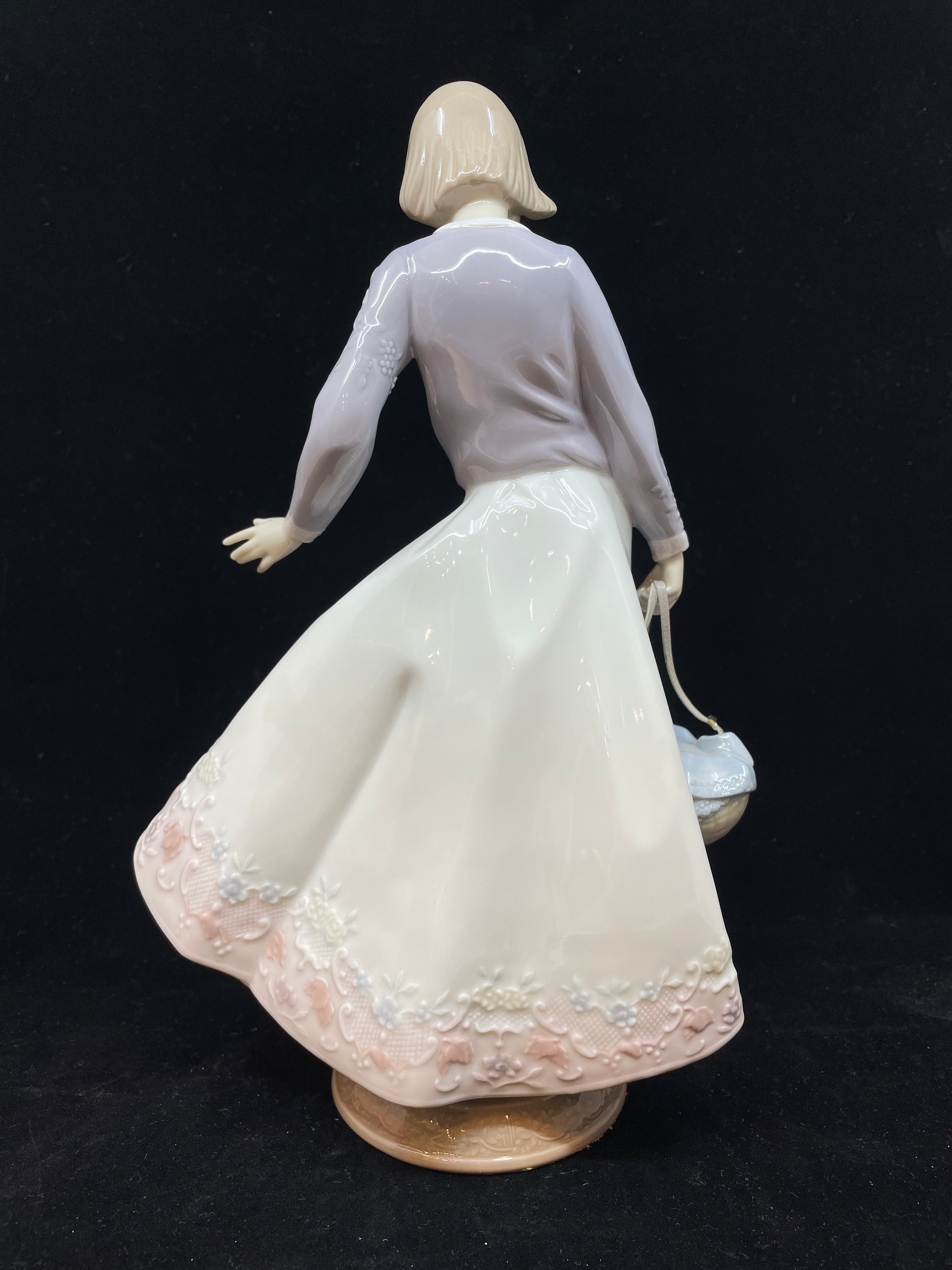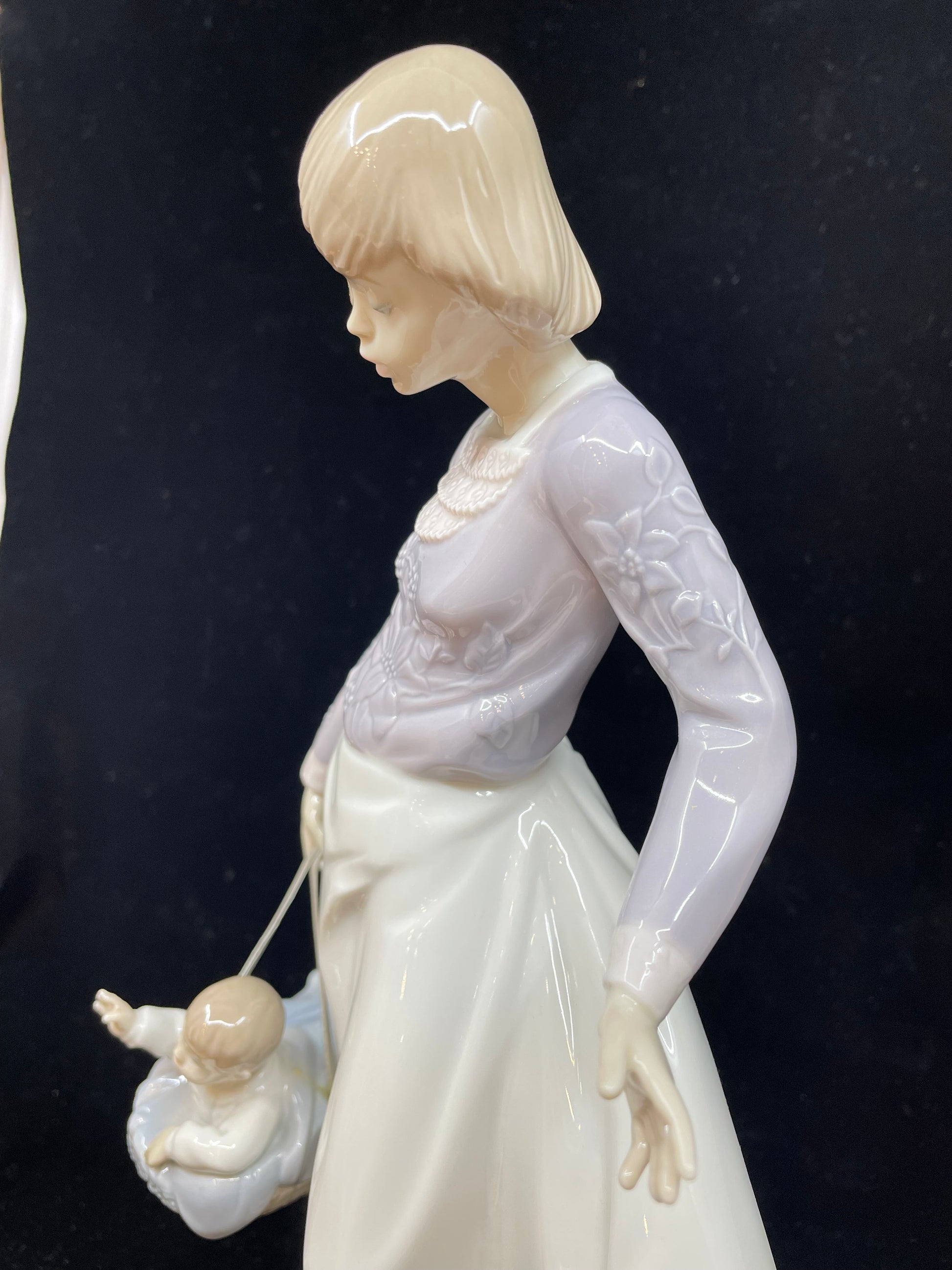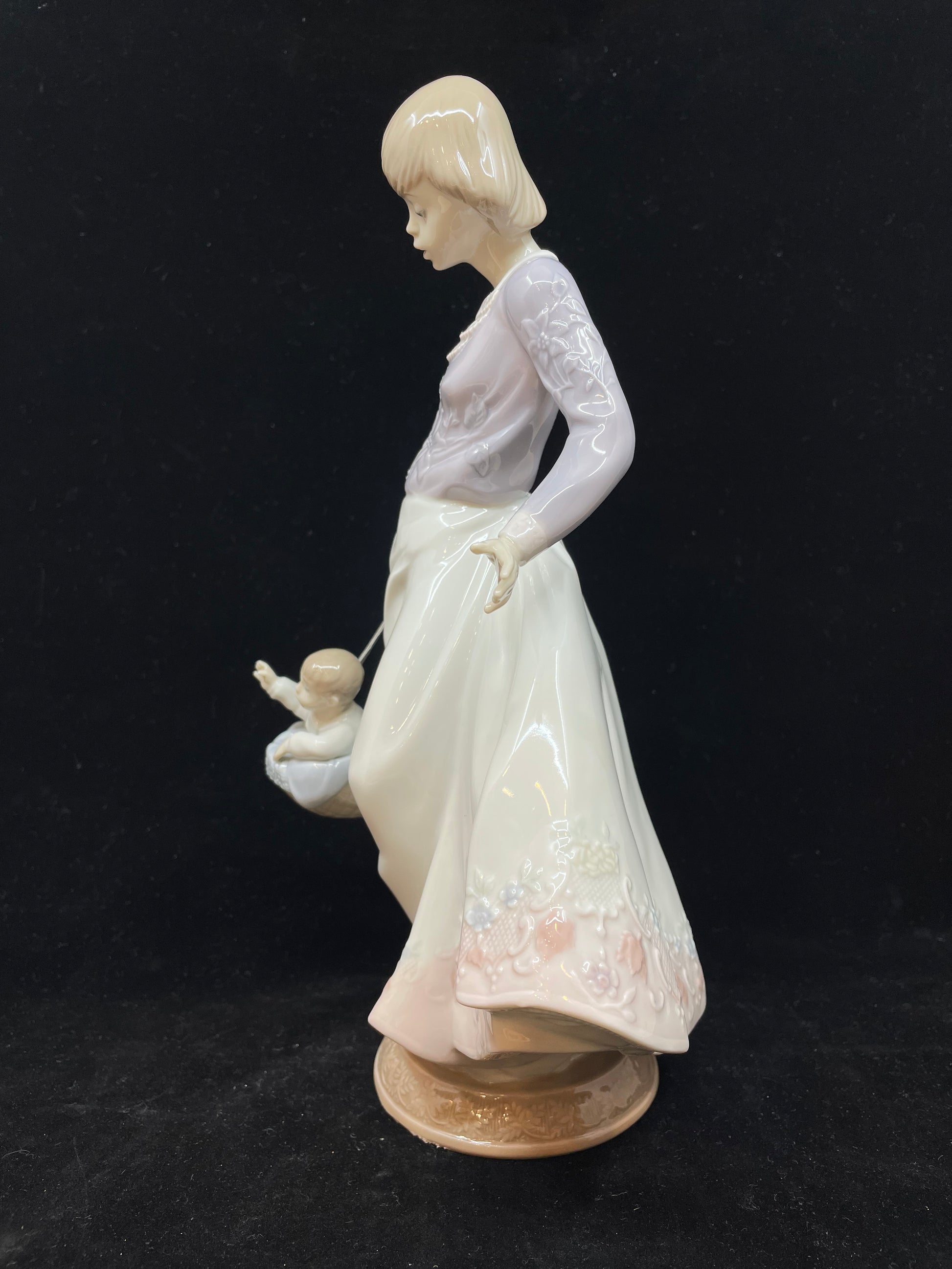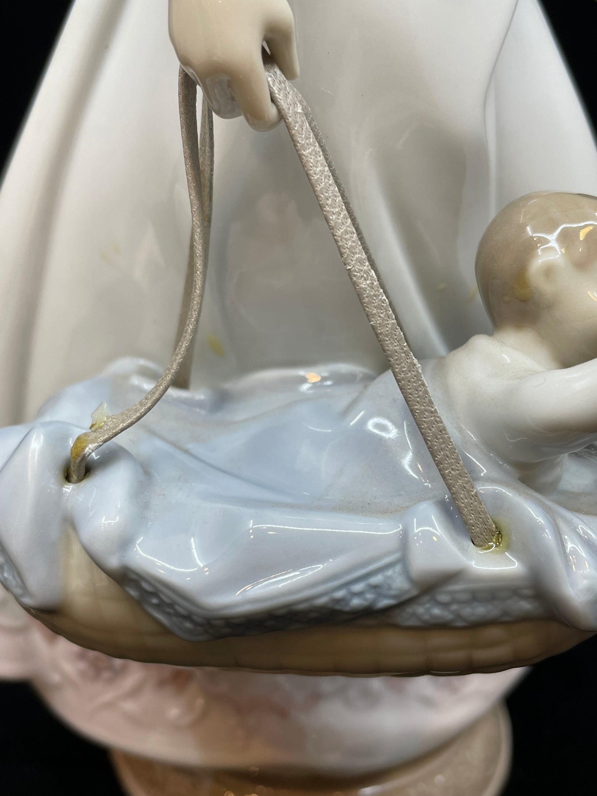 This rare porcelain figurine by Lladro, titled "Away We Go," was retired in 1994. It features a girl carrying a baby in a bassinet. The girl is wearing a purple sweater with a long, white, flowy skirt. It is branded Lladro and numbered on the base of the figurine. Includes the original box.