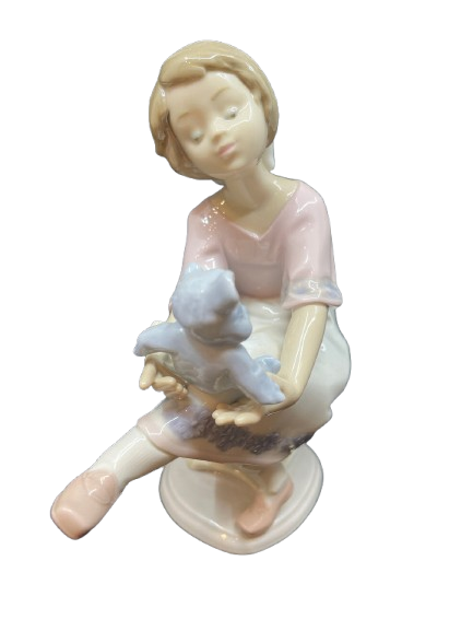 Lladro porcelain "Best Friend" figurine, numbered 7620. Features a young girl gazing happily at a teddy bear. Milky beautiful colors and delicate hand painted details are present throughout. Lladro branding is present on the base of the figurine. Includes the original box.