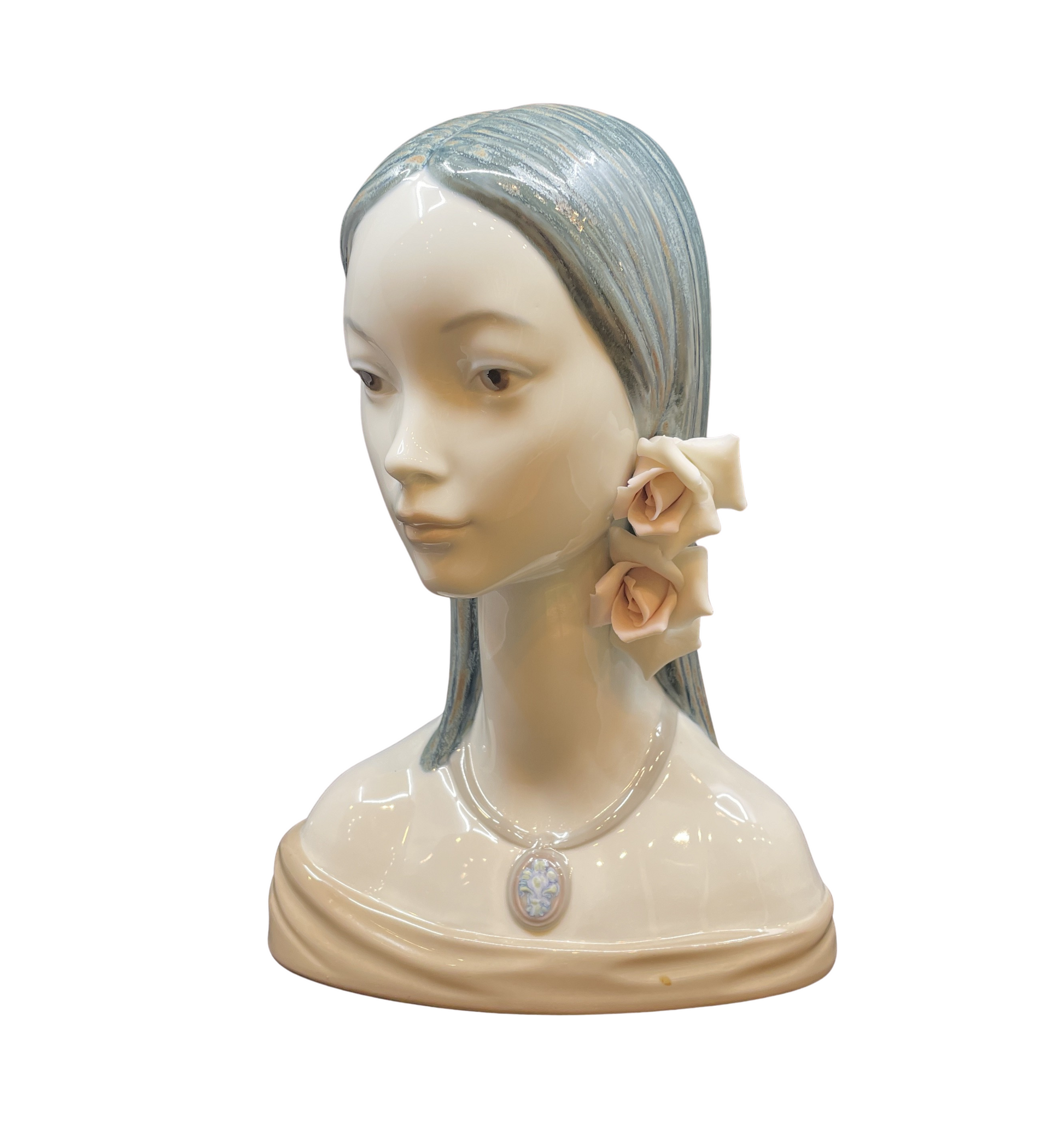 Lladro porcelain “La Maja” bust. This elegant piece features a beautiful long-haired woman adorned with two delicate roses. The milky, light color scheme further accentuates the refined and soft aesthetic of this piece. The bust has a glossy finish and is marked with the Lladro logo on the bottom. This figure is the perfect addition to any collection showcasing delicate craftsmanship.