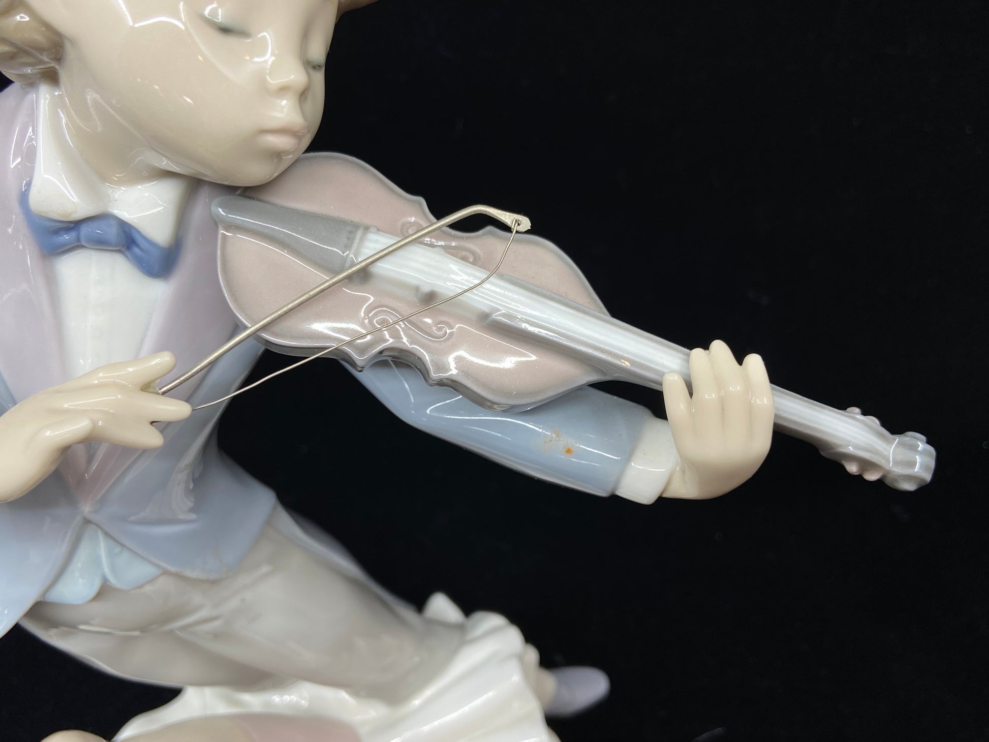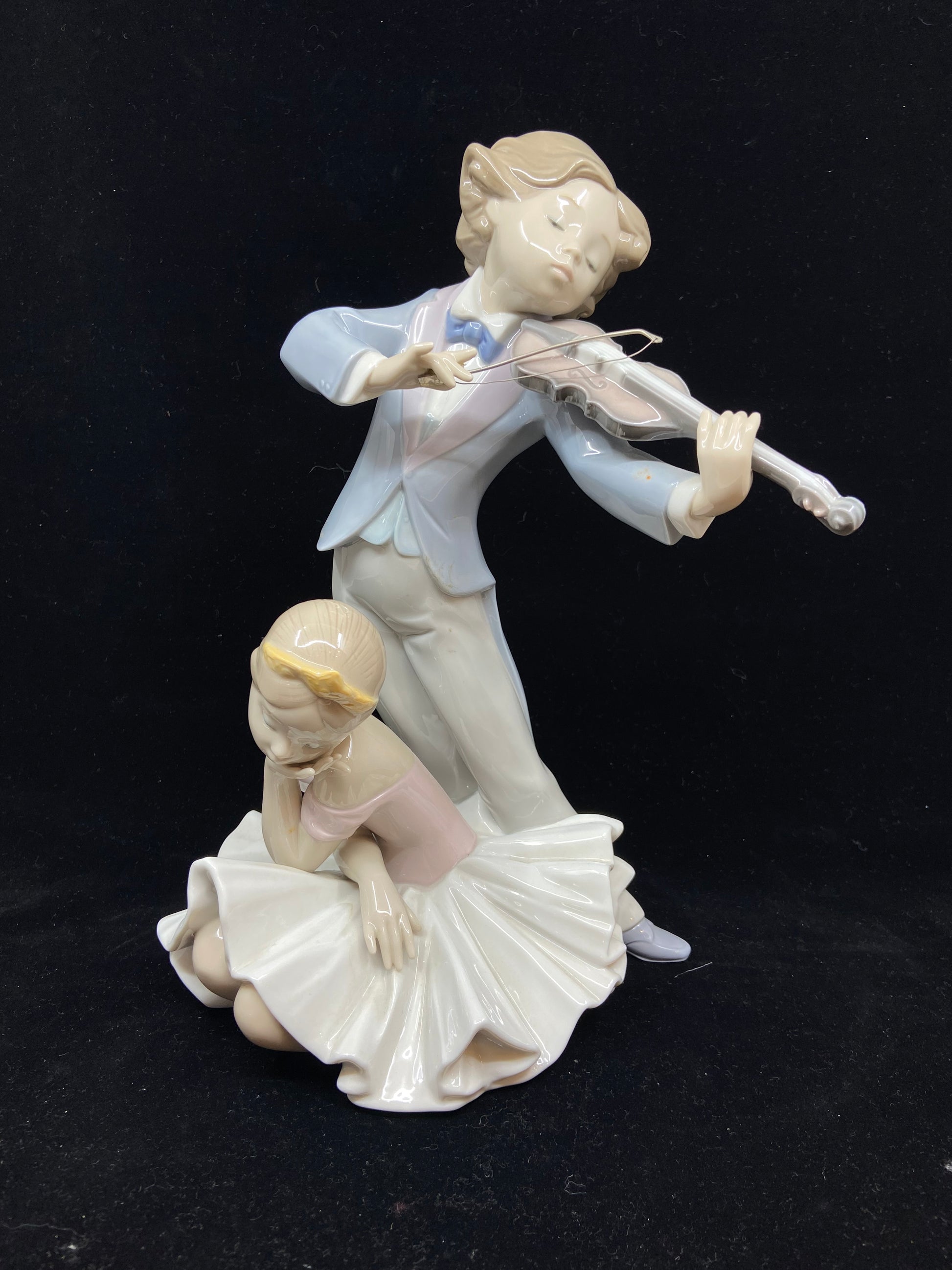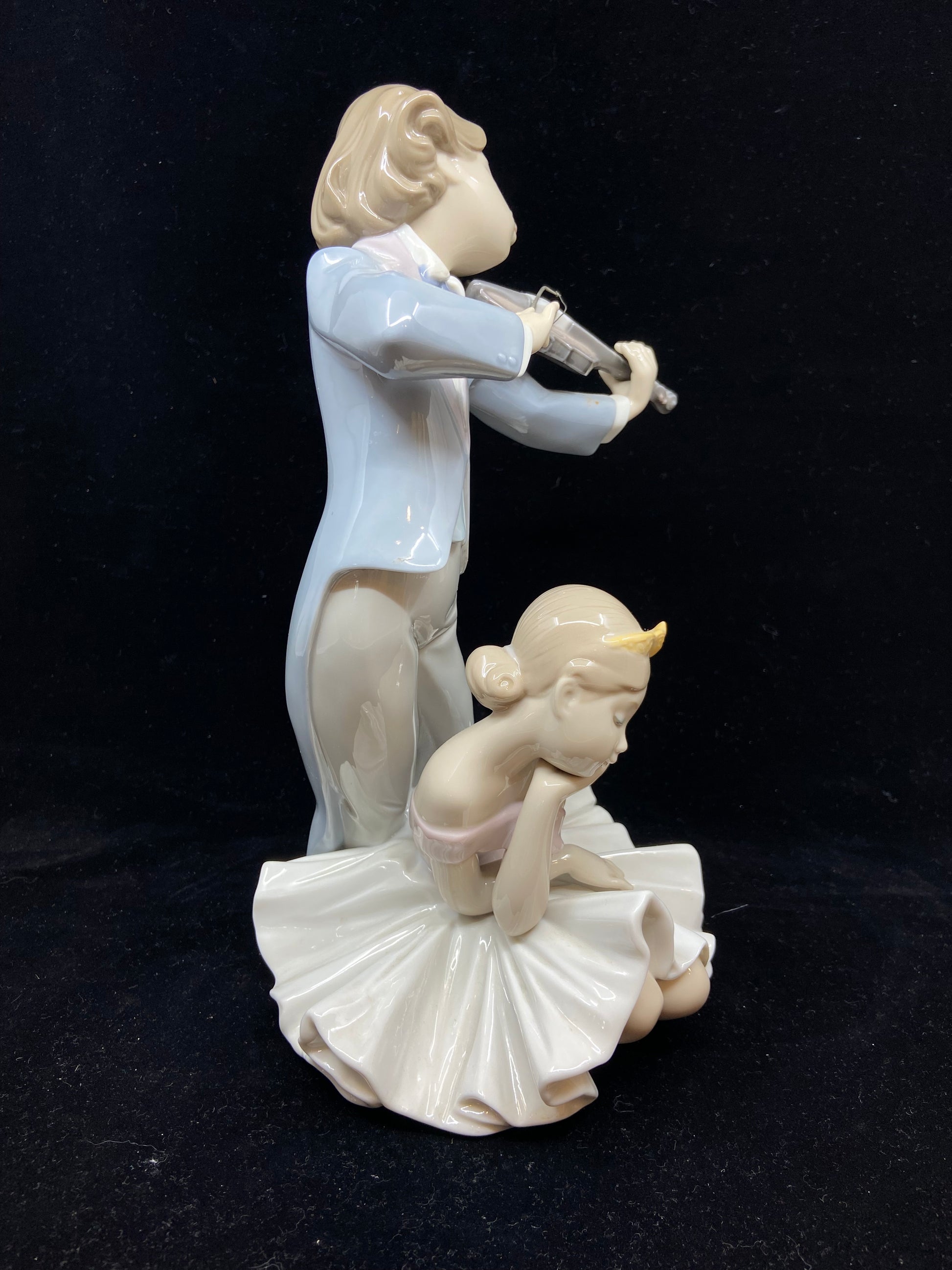 Porcelain "Captivating Melody" figurine by Lladro #9688. Depicts a young violinist passionately playing as a young ballerina crouches at his feet. Greatly captures the passion of the children. Features a glossy finish and milky coloration with pink, blue, brown, gold, and cream tones. Lladro branding is present on the base of the figurine. Does not include the original box.