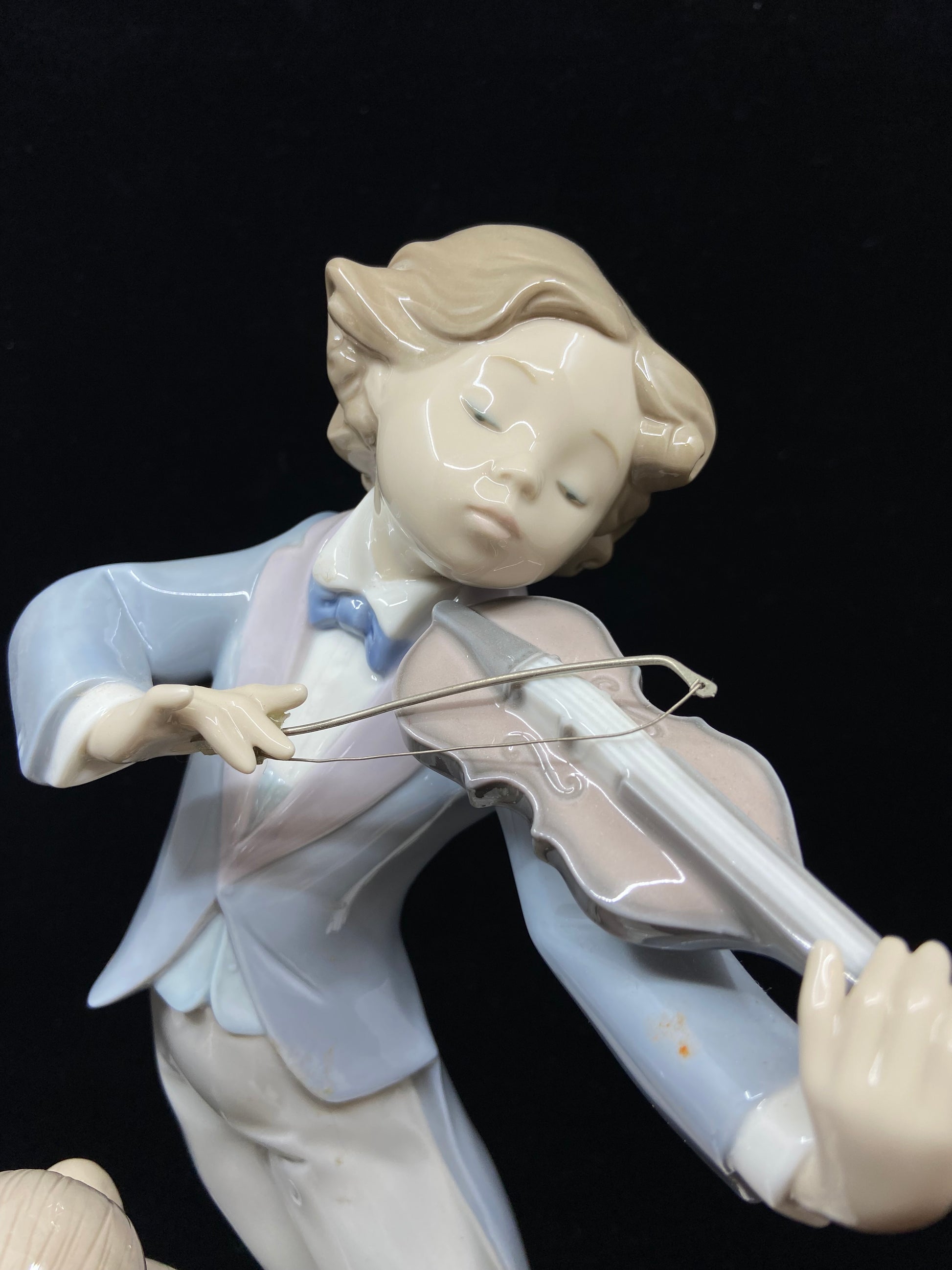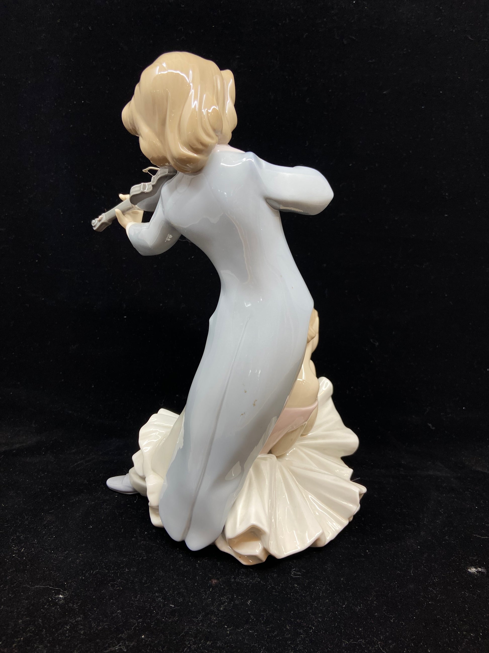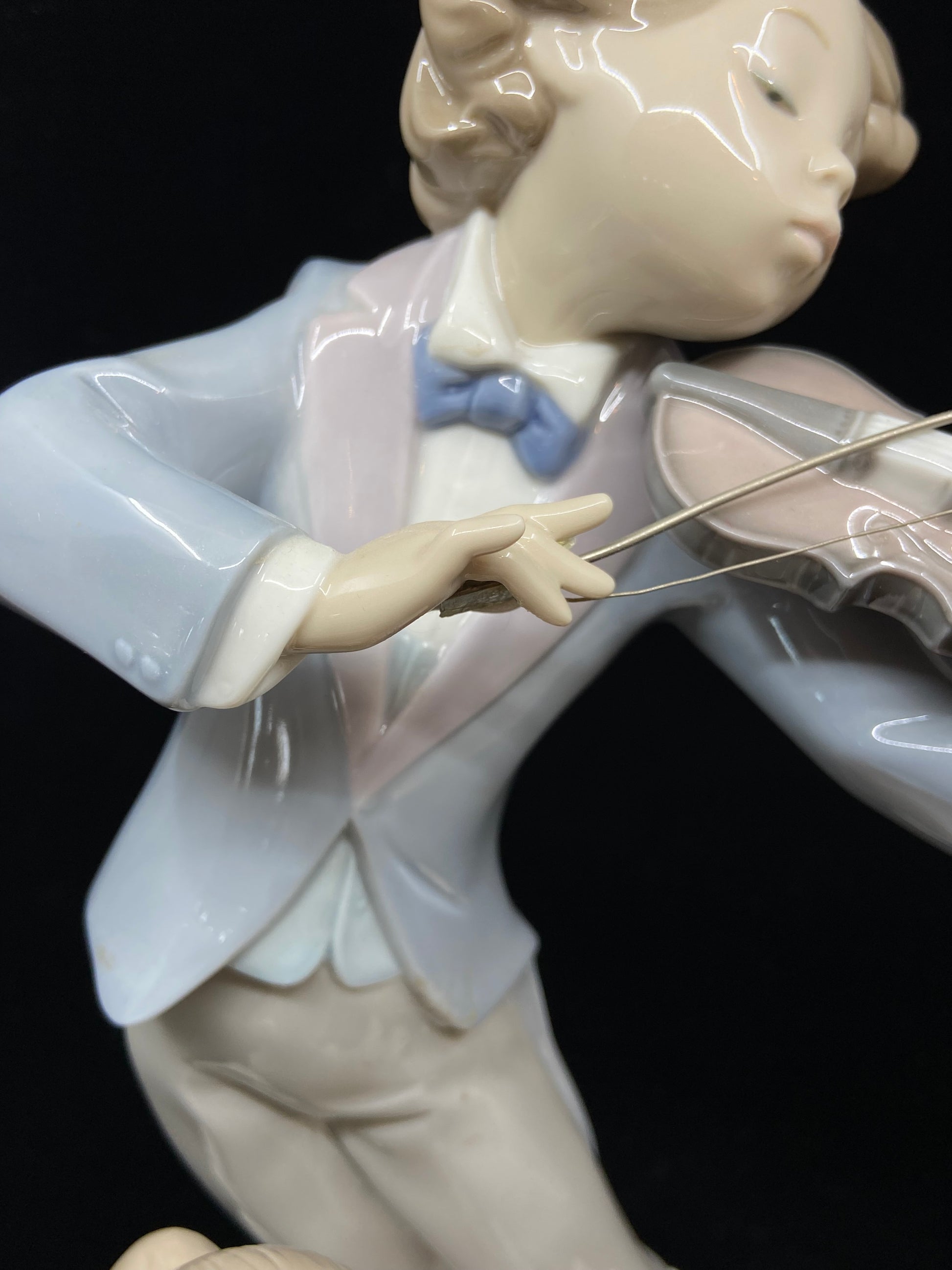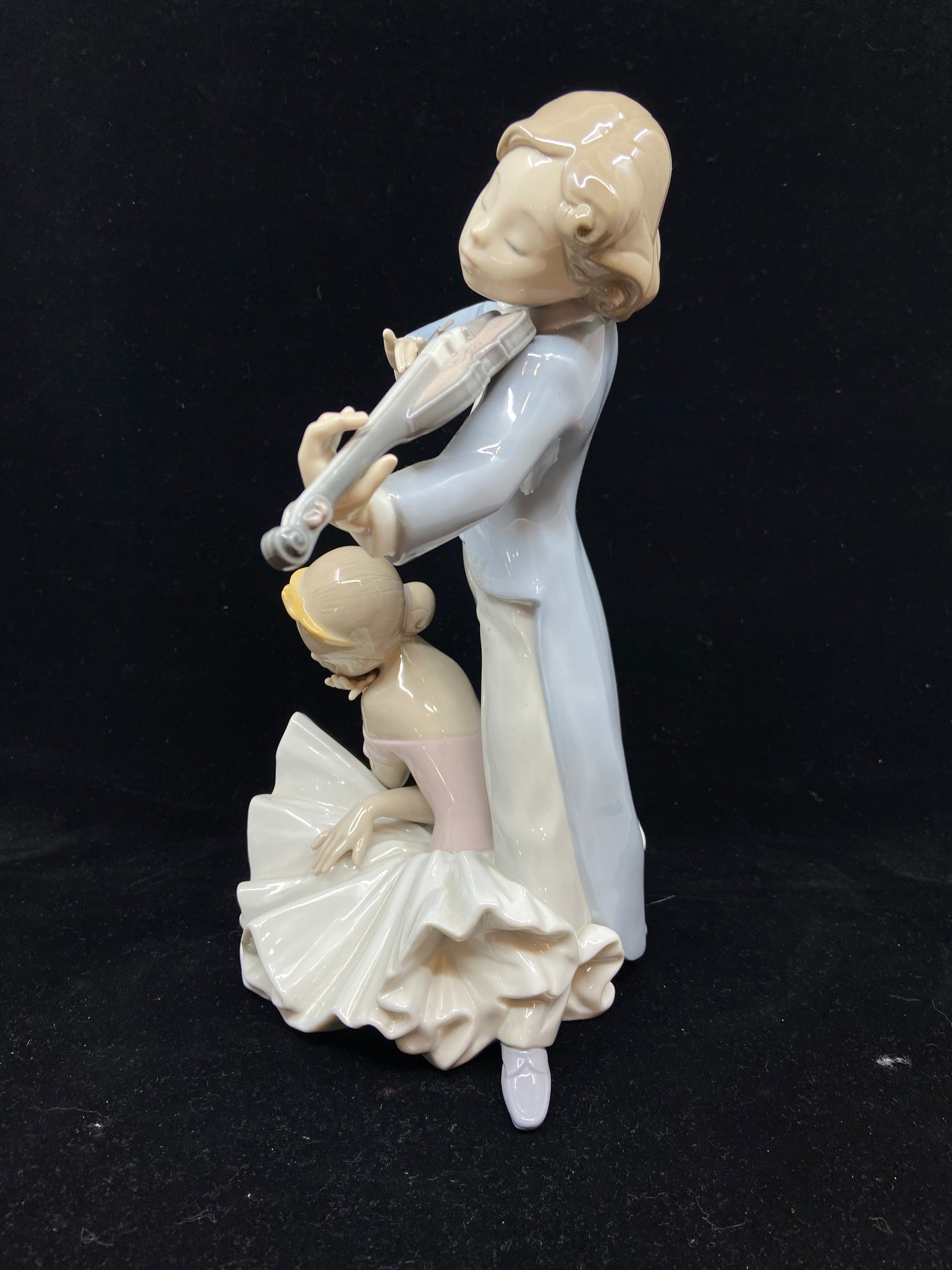 Porcelain "Captivating Melody" figurine by Lladro #9688. Depicts a young violinist passionately playing as a young ballerina crouches at his feet. Greatly captures the passion of the children. Features a glossy finish and milky coloration with pink, blue, brown, gold, and cream tones. Lladro branding is present on the base of the figurine. Does not include the original box.