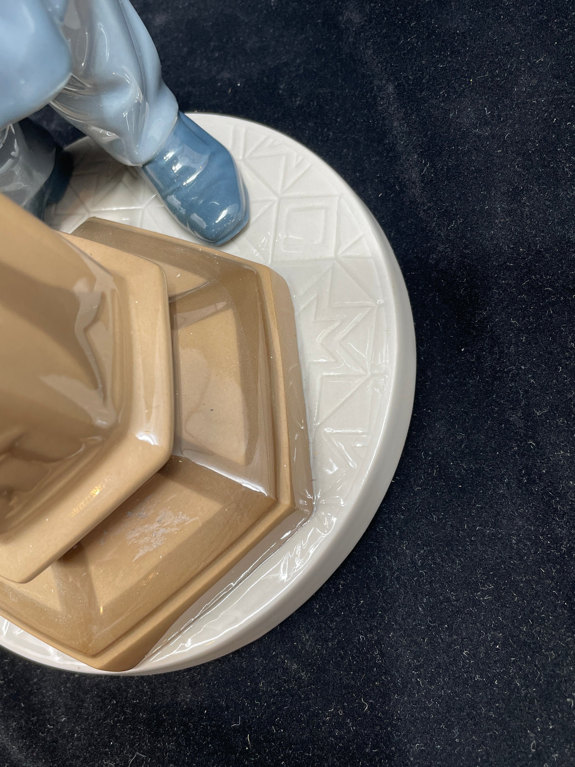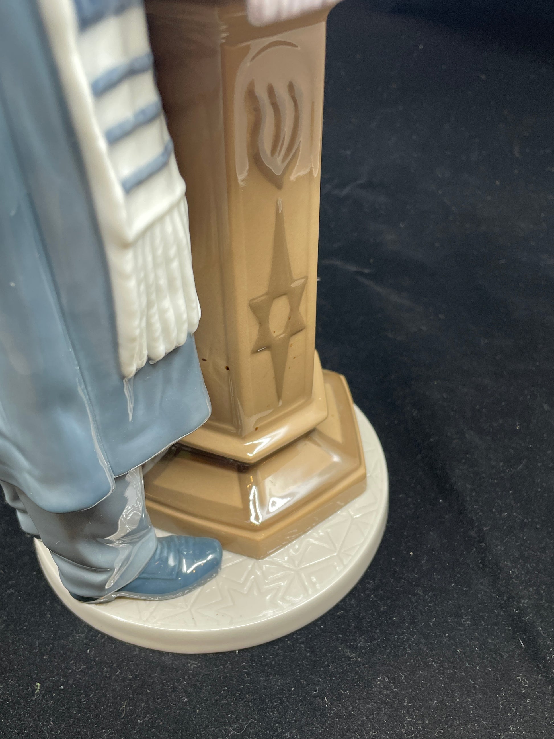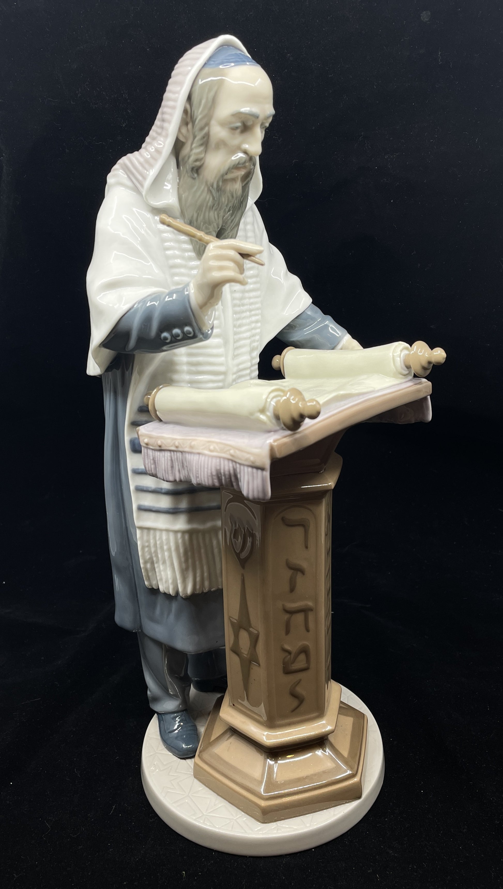 Lladro Rabbi with box. This beautiful porcelain piece depicts a Rabbi reading the Torah. The man stands in blue and white clothes behind a pedestal with Hebrew markings on its sides. He is holding a pen in his raised hand. The piece sits on a white circular base with a subtle tile-like texture. A beautiful religious piece that's sure to elevate a space.