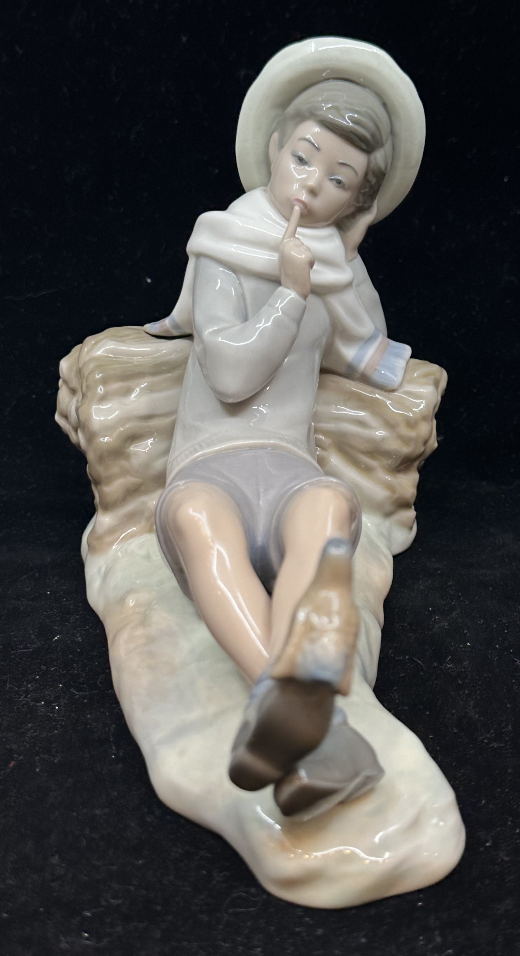 Porcelain "Shepard with Bird" figurine by Lladro, numbered 4730. Depicts a young boy resting on a pile of wood and shushing to a bird perched on his foot. Features muted colors of grey, purple, cream, and beige with a glossy finish. Branded Lladro on the base of the figurine. Does not include original box.