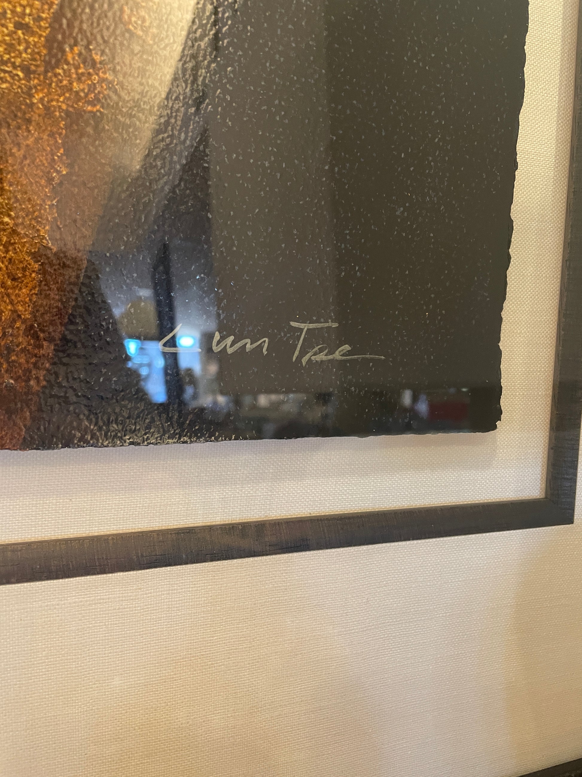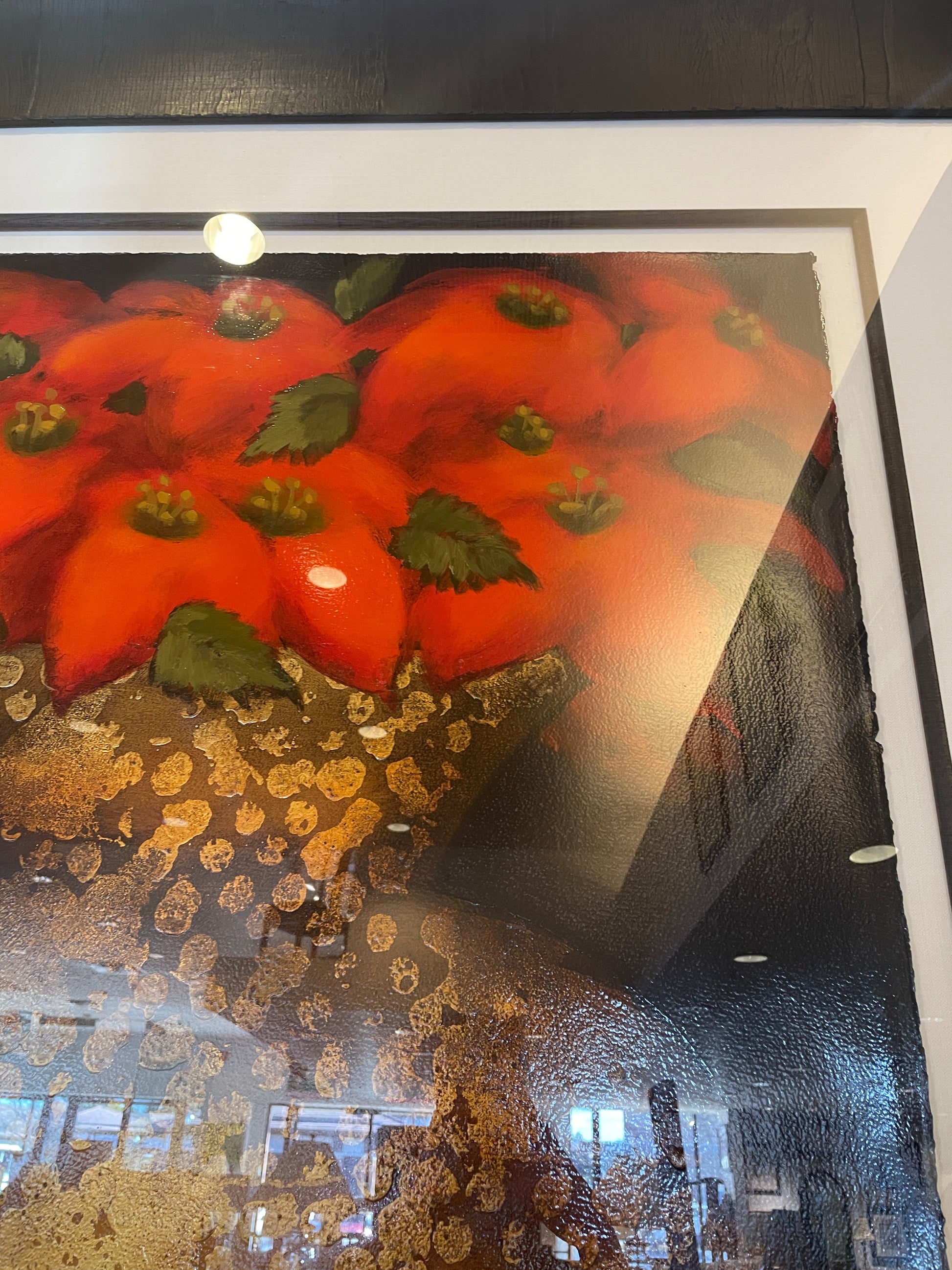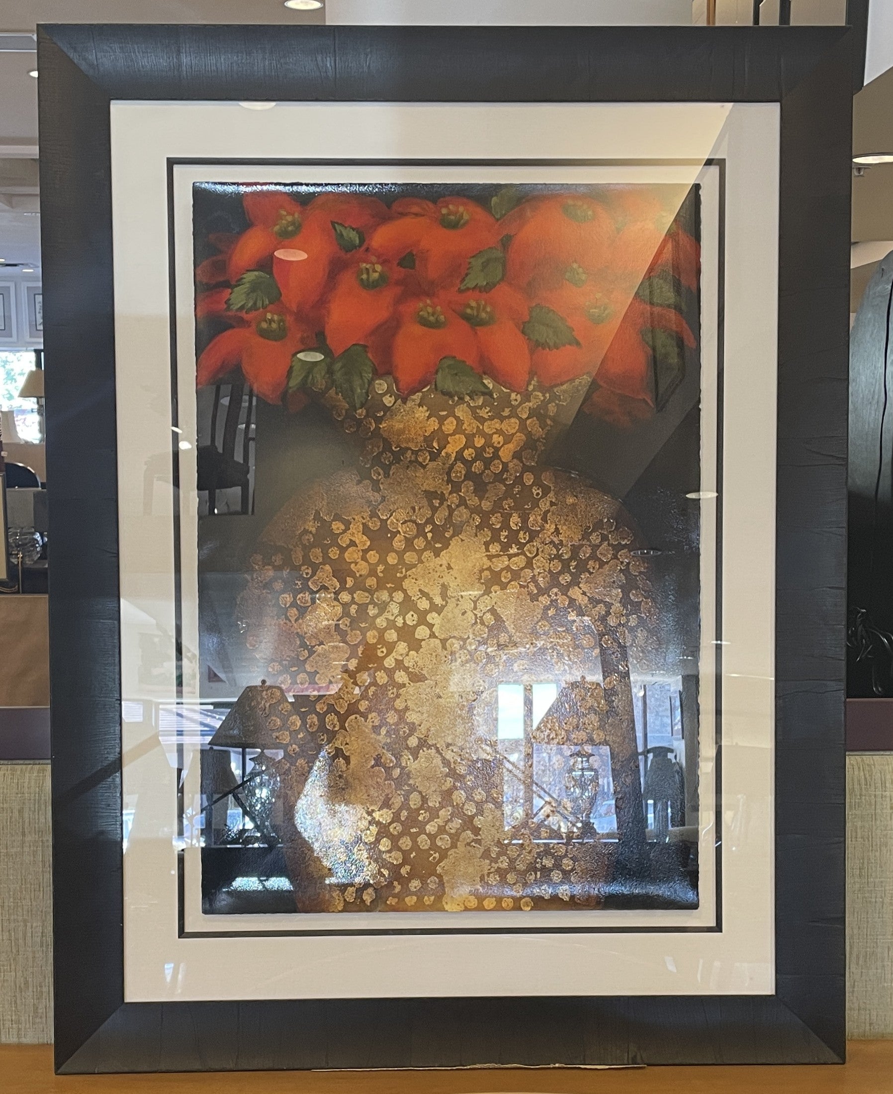 Lun Tse original on paper, floral vase. Signed lower right. This vibrant piece depicts a vase of poinsettias. The gold colored vase has a circular pattern to it, and the bright red flowers are dappled with yellowish green centers and leaves. The vase of flowers sits on a dark background. The piece is set on a white colored mat with a dark inner border, and held in a thick, dark wooden frame. A large, eye catching piece that is sure to elevate a room.