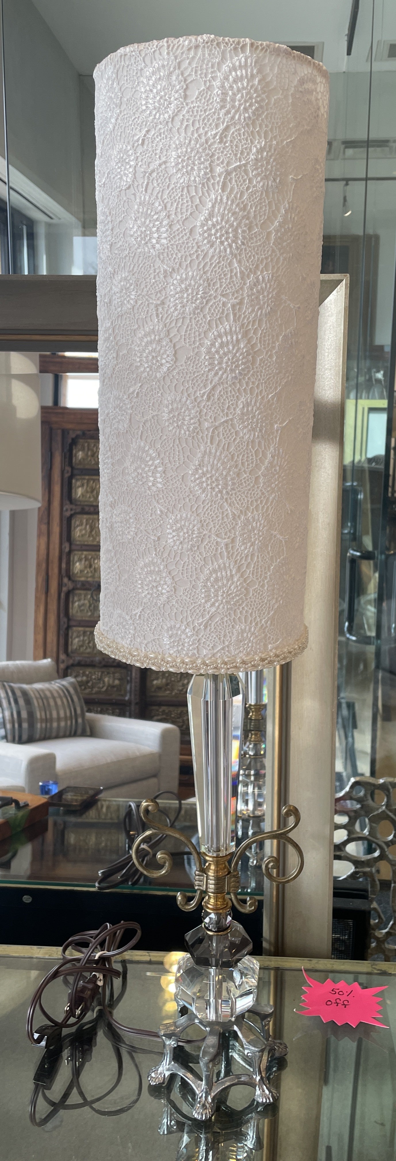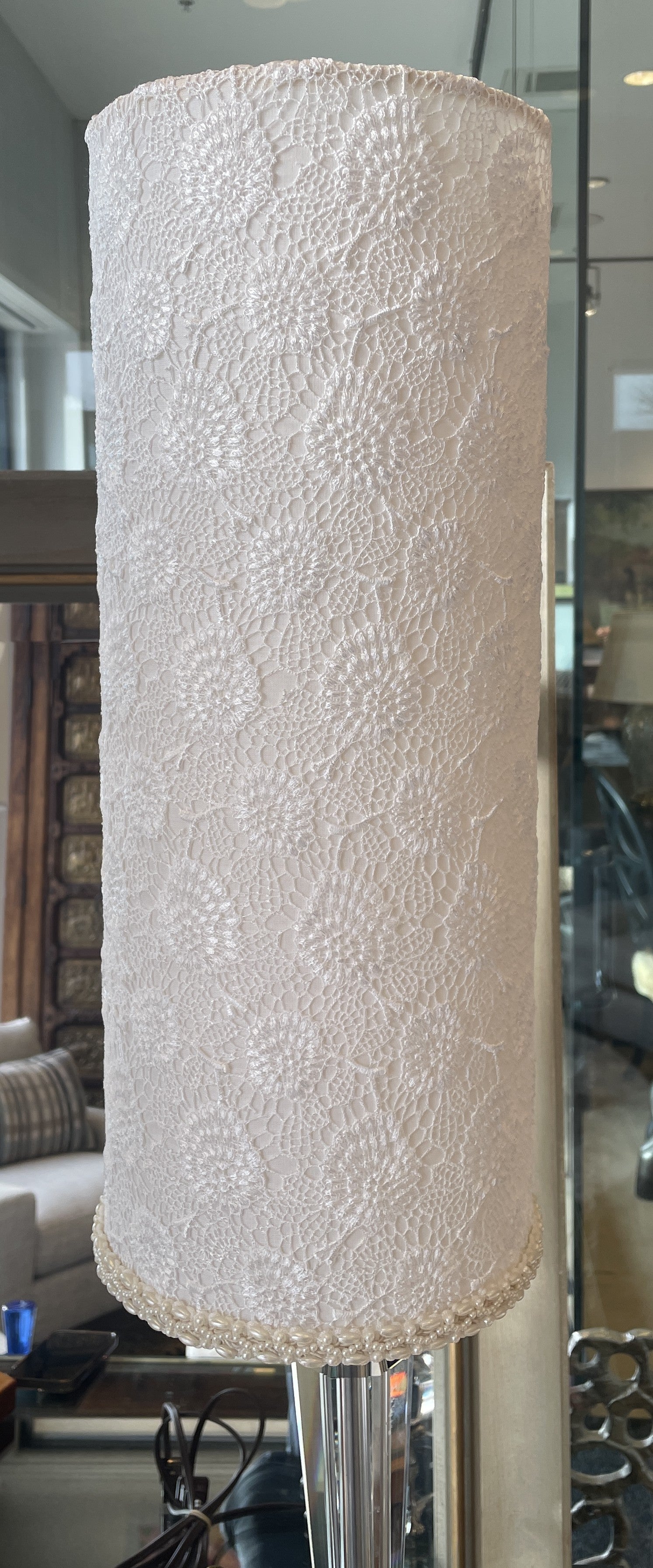 Luna Bella floral shade crystal lamp. This gorgeous lamp features an intricate base with crystal and metal elements. The base sits on a six-footed base with a silver finish, which supports a clear and black crystal body, which is capped with scrolled brass accents. Another section of clear crystal stems up into the singular lightbulb socket, which is obscured by a tall and slender cylindrical shade. The shade is covered in beautiful lacey floral patterns, and the top and bottom edge of the shade are beaded, which adds an additional layer of intricacy to the lamp. This gorgeous lamp is a perfect piece to add a whimsical brightness to any space.