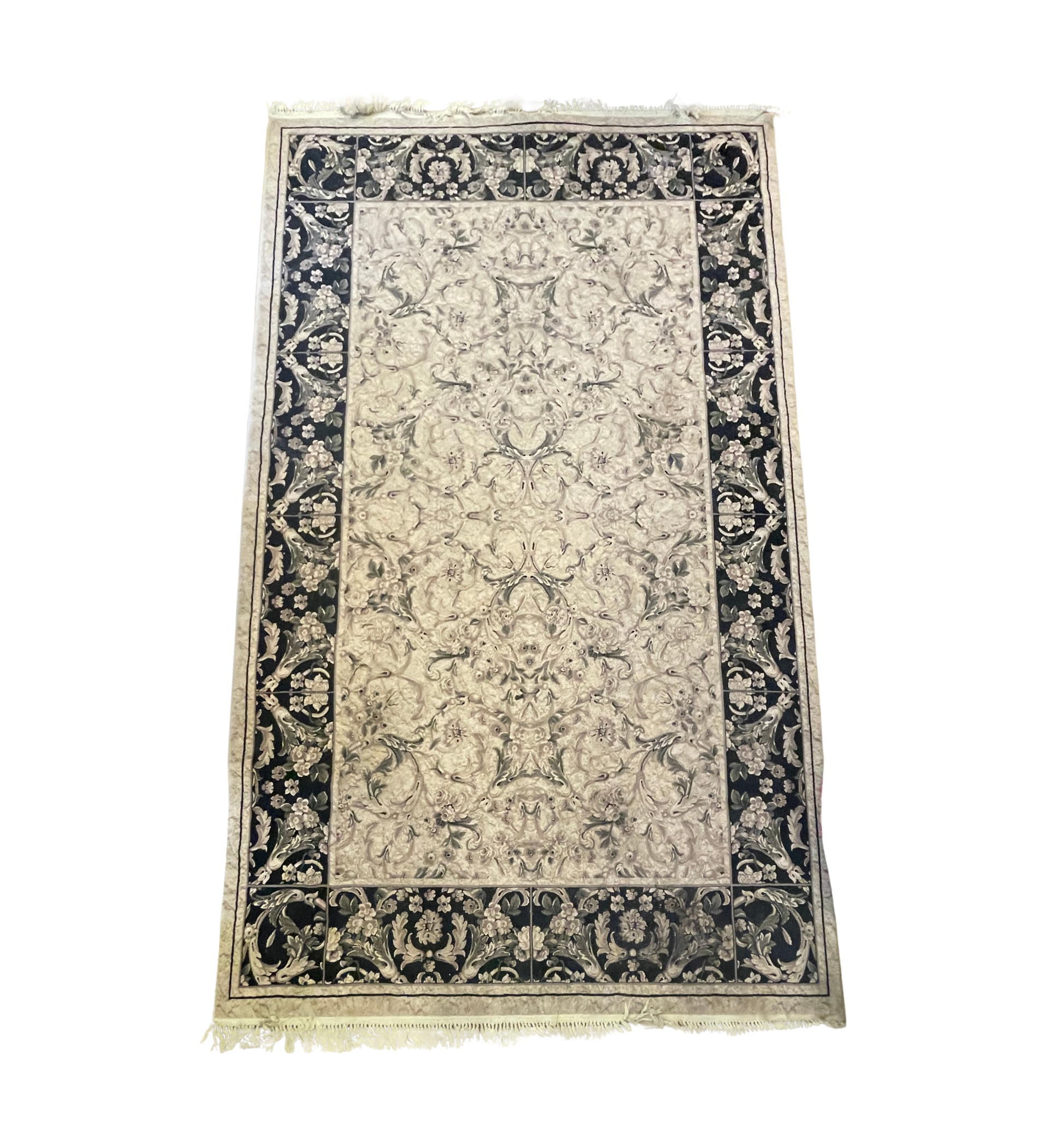 Machine made rug in grays. This gorgeous rug features a neutral color palette that primarily consists of gray and beige. The center of the rug has a beige backsplash behind a gray kaleidoscope-like design. The edge has a black edge with various scrolled leaf-like details. The short ends of the rug are capped with a cream colored fringe. A gorgeous rug perfect for a space that needs an extra patterned flare without a pop of color.