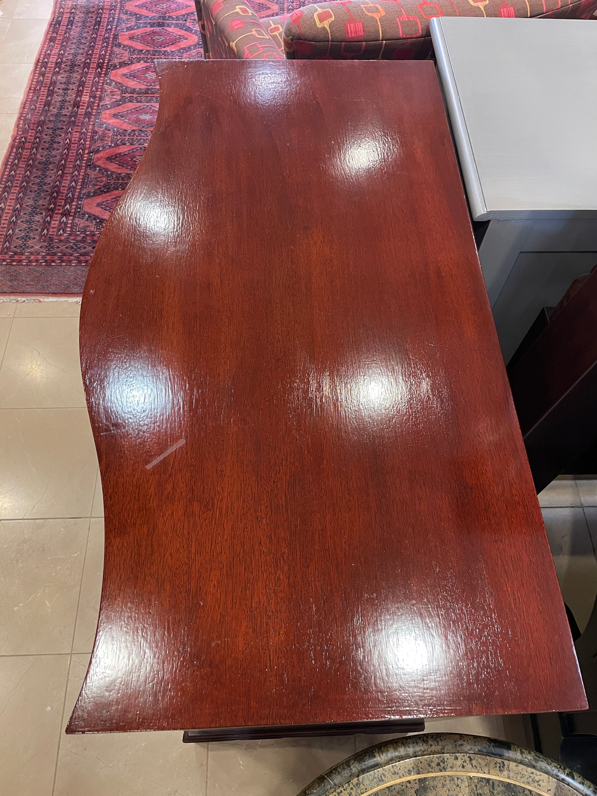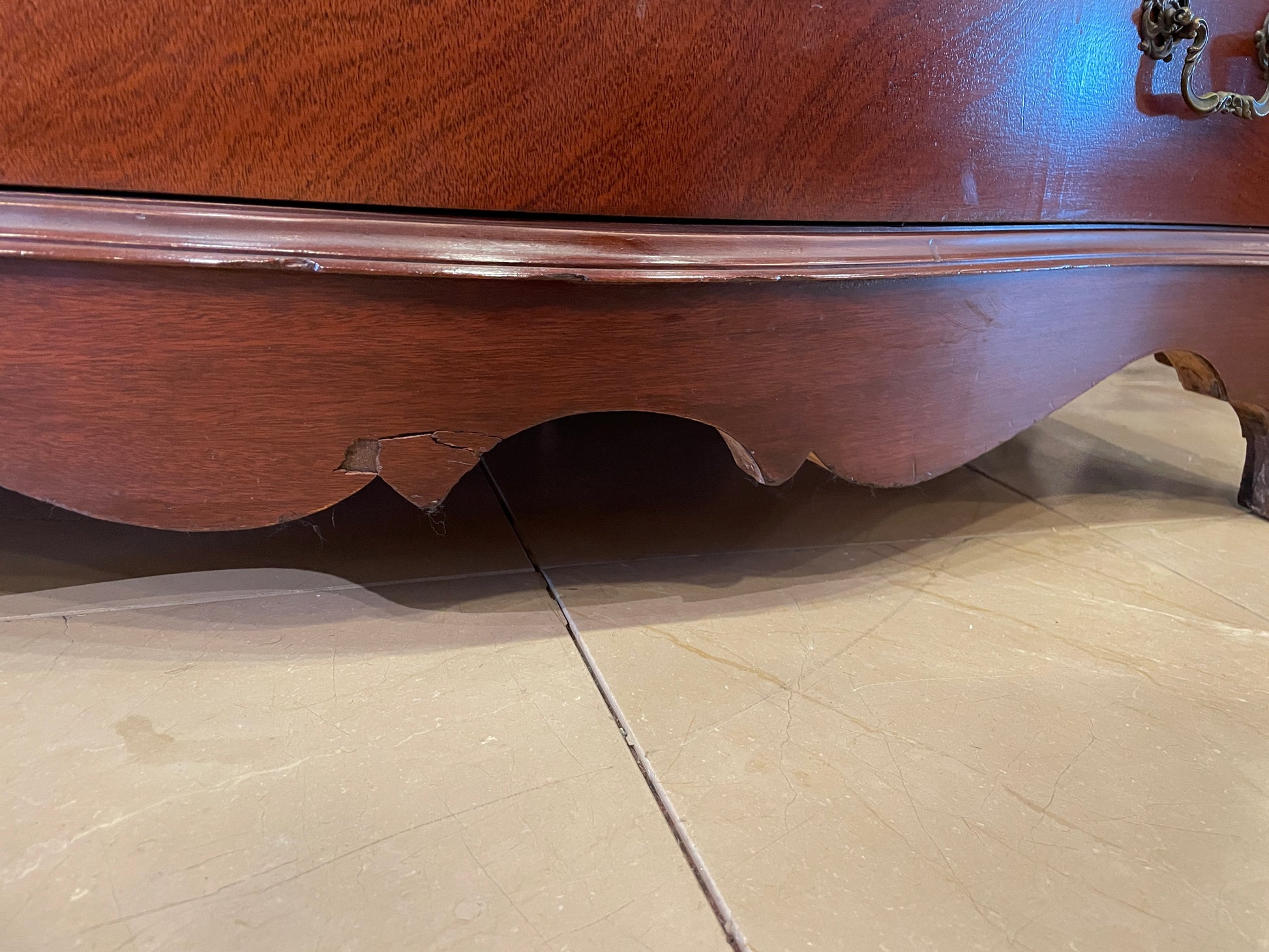 Beautiful mahogany bachelor's chest. This stunning mahogany wood chest features four drawers that are accented with brass hardware. The uppermost drawer has the appearance of three smaller drawers with little pull handles, but opens to reveal one large drawer. The other three drawers all have two larger pull handles. The base has a simple curved design with square feet. The corners have a small carved spiral design. Elegant and charming, this piece is sure to elevate a space.