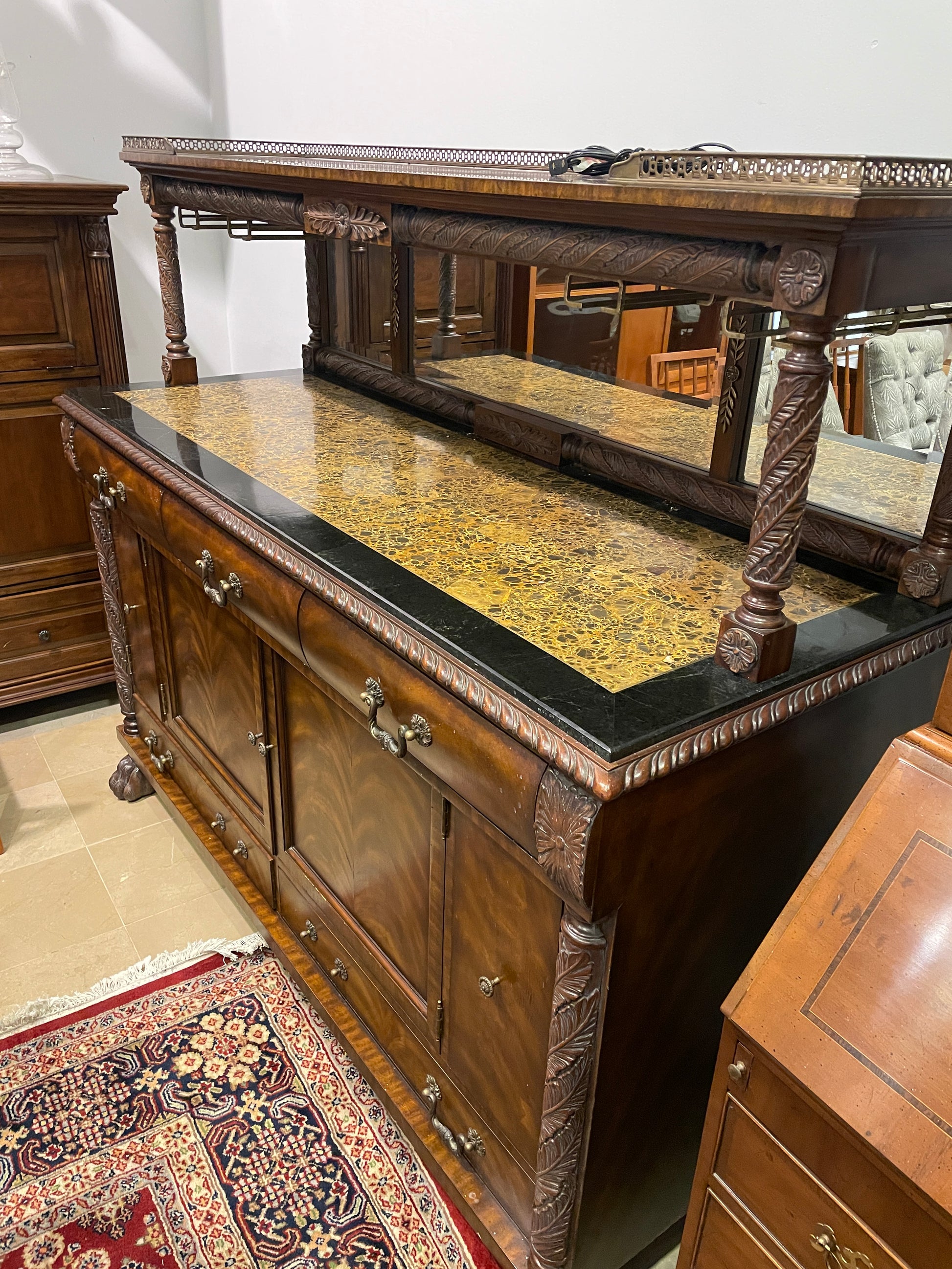 Maitland Smith buffet with inlay. This gorgeous piece includes many different functional features. To start, the piece has five drawers that open with brass pull handles along with one ice drawer that is opened with a knob. In the center of the drawers, two cabinet doors with small knobs open to reveal a wine rack. On the left side of the wine rack is one convenient storage cabinet that can be opened with a knob. The tabletop of the buffet features a gorgeous inlay of marble and granite. Extending out from the tabletop are four supports that hold up an upper gallery. The bottom of the gallery holds a light and wine glass storage racks. The piece sits on claw feet and is further accented by beautiful carved details. A stunning piece that is full of both functionality and design.