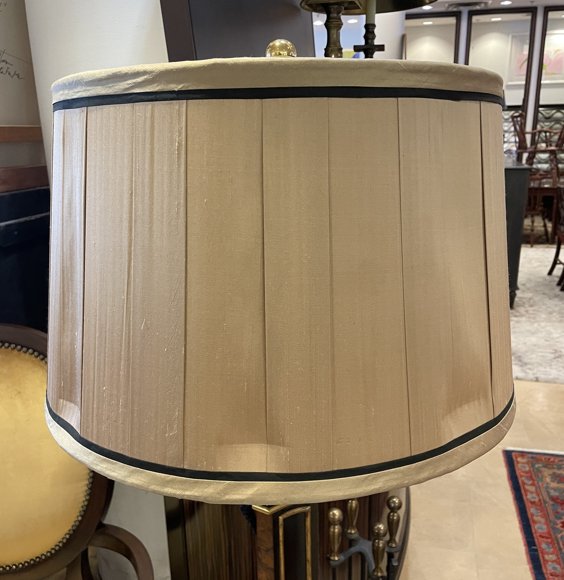 Maitland Smith burled wood regency-style floor lamp. This charming piece sits atop a flat, near triangular base with three feet. The stand has a stunning burled wood finish that is accented by black and gold details. The shape of the stand is similar to the base with flat portions where the burled wood sits and concave portions with the black and gold detailing. The socket of the lamp has a flower-like design to it. Atop the stand sits a beige pleated shade with black and gold edges and indented details. A beautiful regency style piece that's sure to elevate a space asking for a little more light.