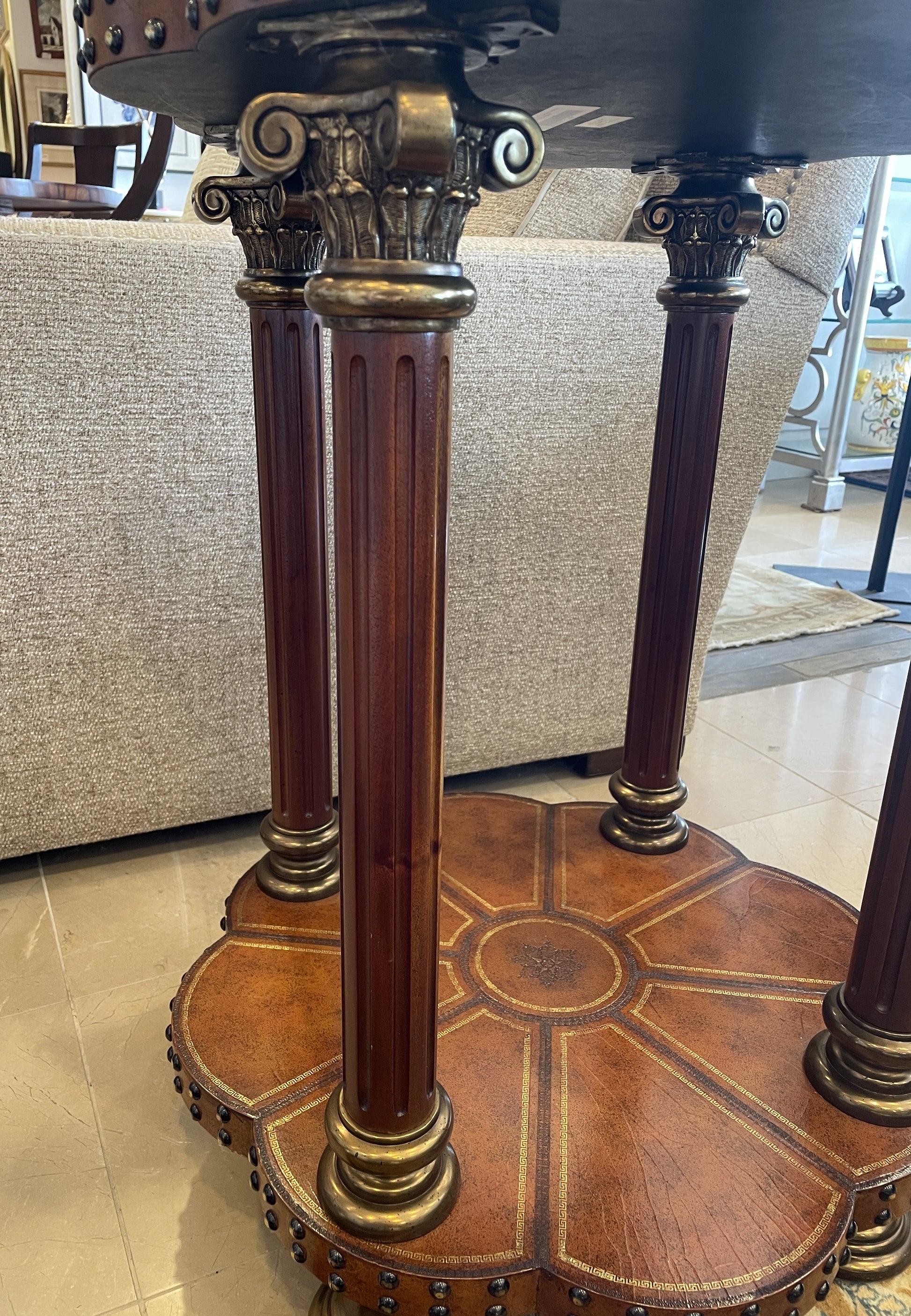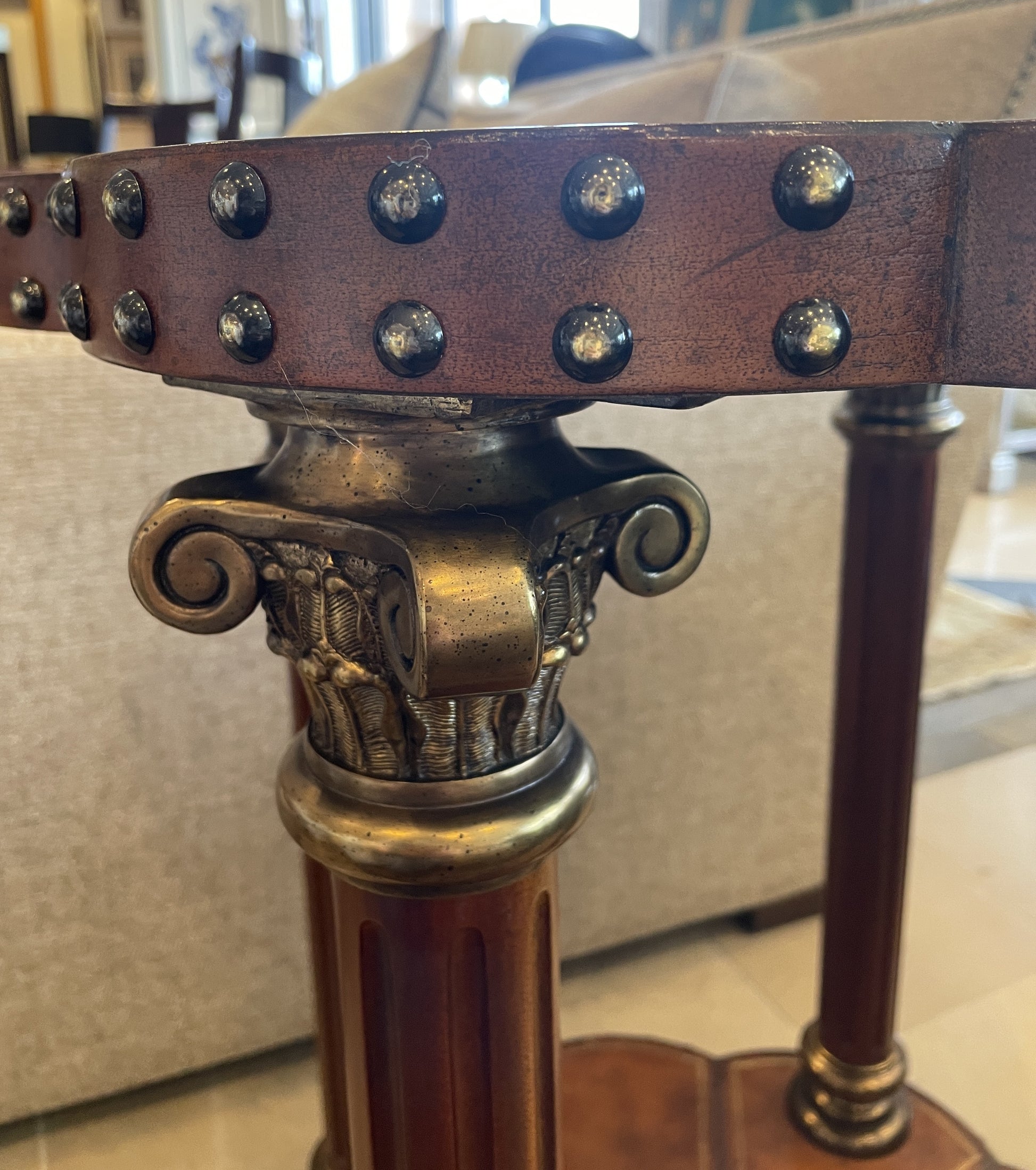 Maitland Smith two tiered leather clover end table. This showstopping table features two clover-shaped tiers studded with brass grommets on their sides. The two tiers are connected with round ionic column legs that are also accented with brass features. The center of each tier on this table has a star design stamped into it. This neoclassical side table is a great way to elevate a room.