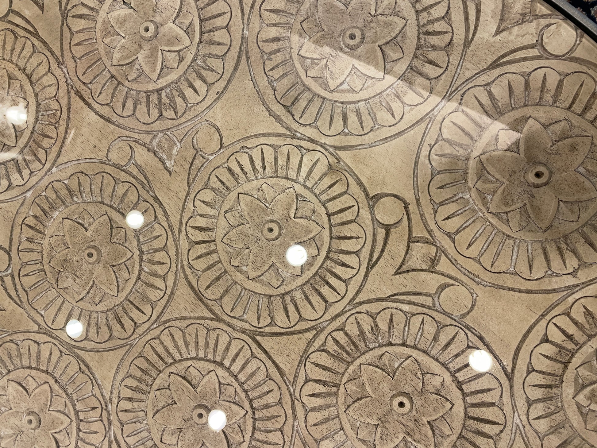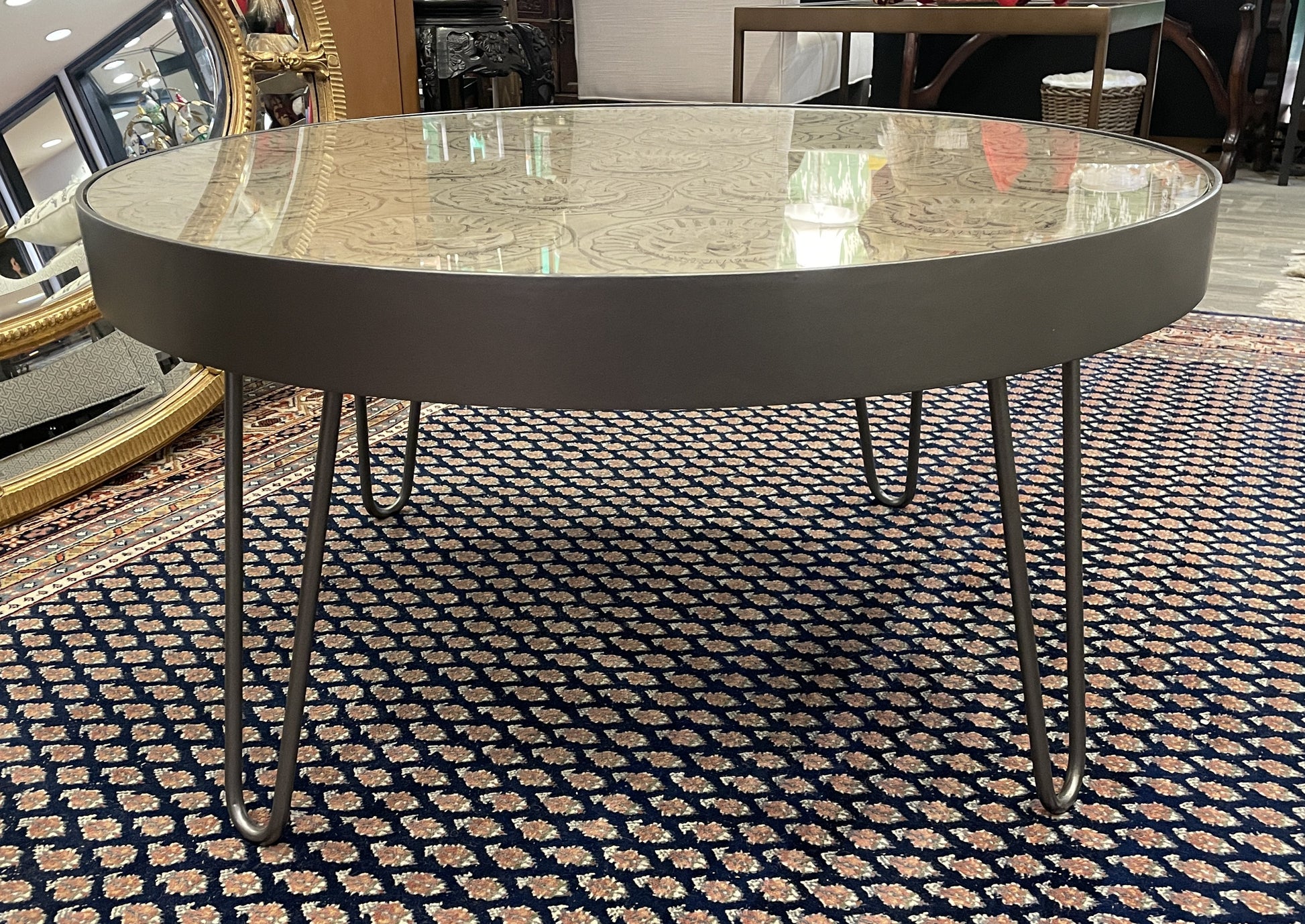 Mandala design round coffee table in metal frame. This unique little table is full of charming features. The piece sits on four metal hairpin legs. They support a frame of the same gunmetal gray material. Inside the frame sits a carved wooden center. The carved designs create a mandala full of flowers and scrolled details. A glass tabletop protects the wooden portion of the table. A beautiful little table that is sure to elevate a space with its intricate details and versatile, neutral color palette.
