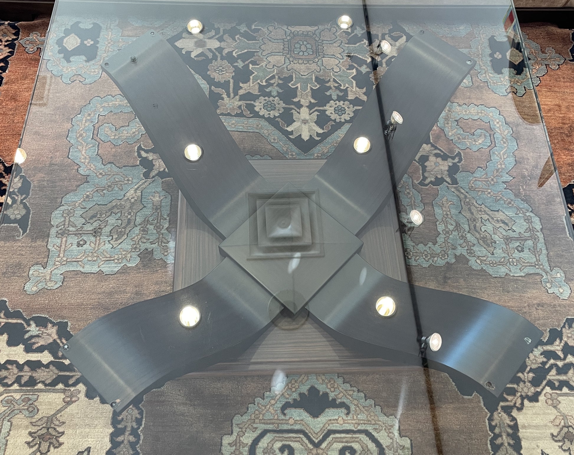 This beautiful coffee table features a glass top and uniquely shaped base. The base - made of macassar ebony - stems from a small square stand that tapers up into four legs. These legs create an x-shape that supports the corners of this piece. Elegant and modern, this custom coffee table is the perfect way to class up a room.