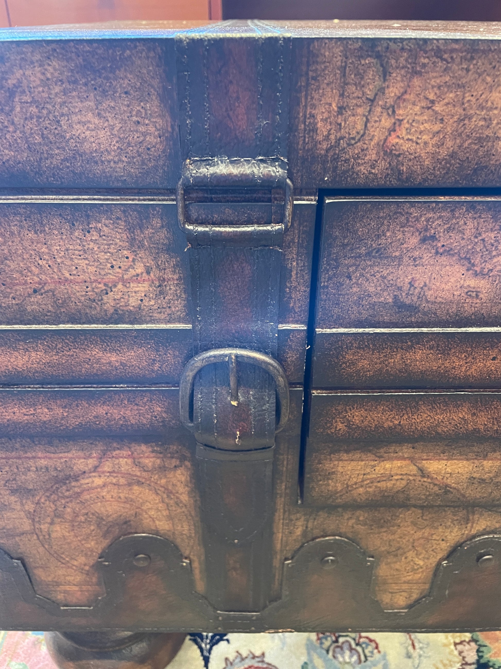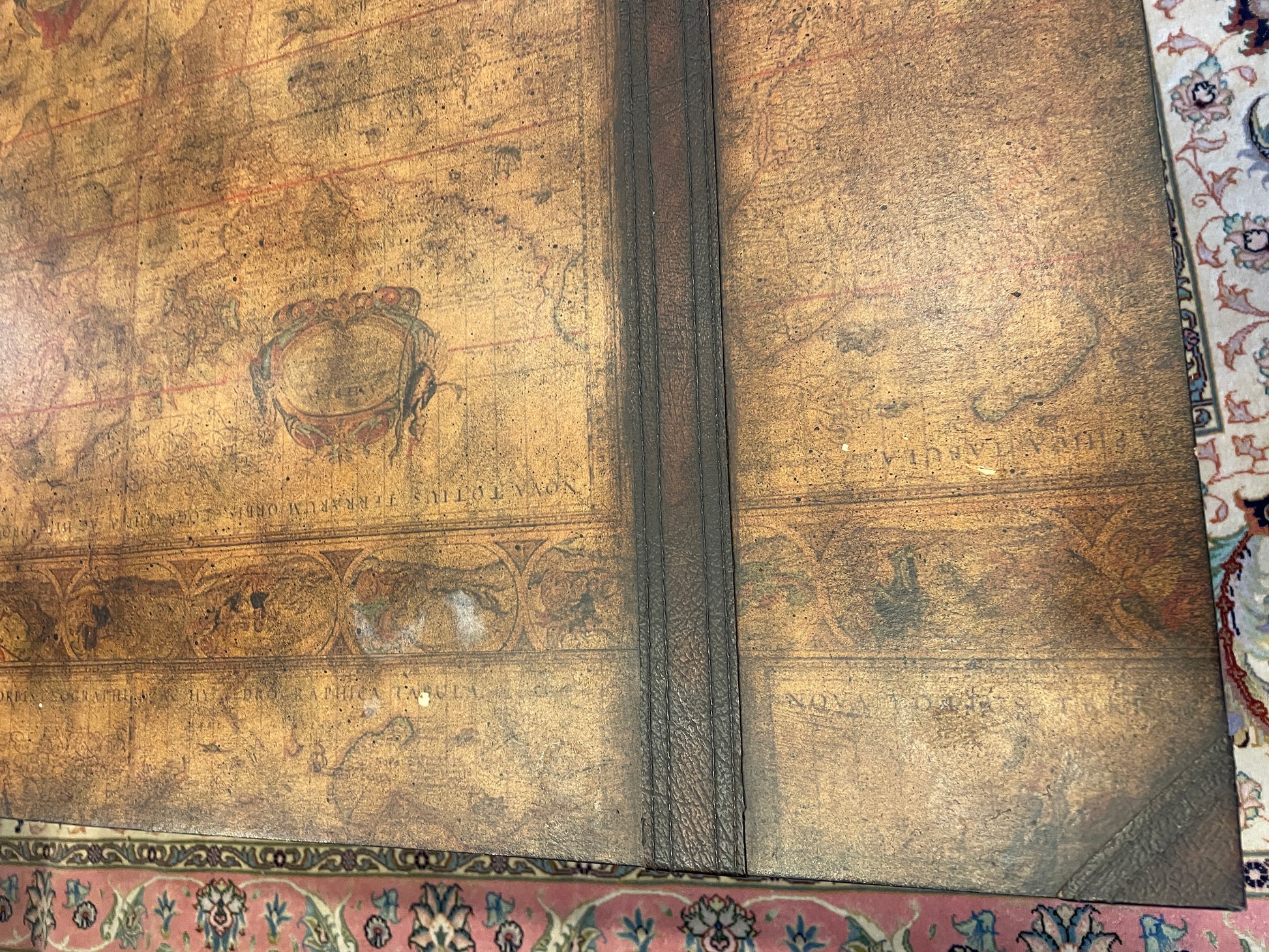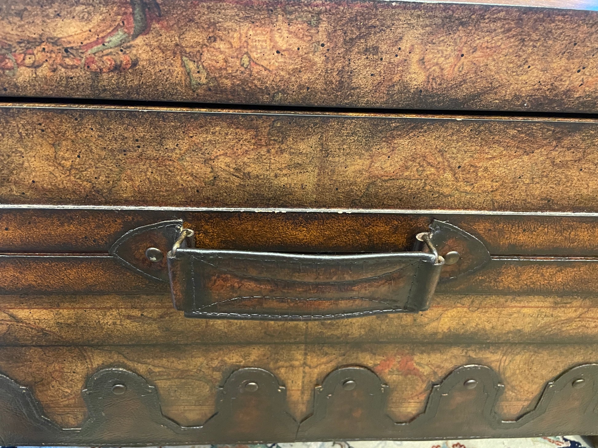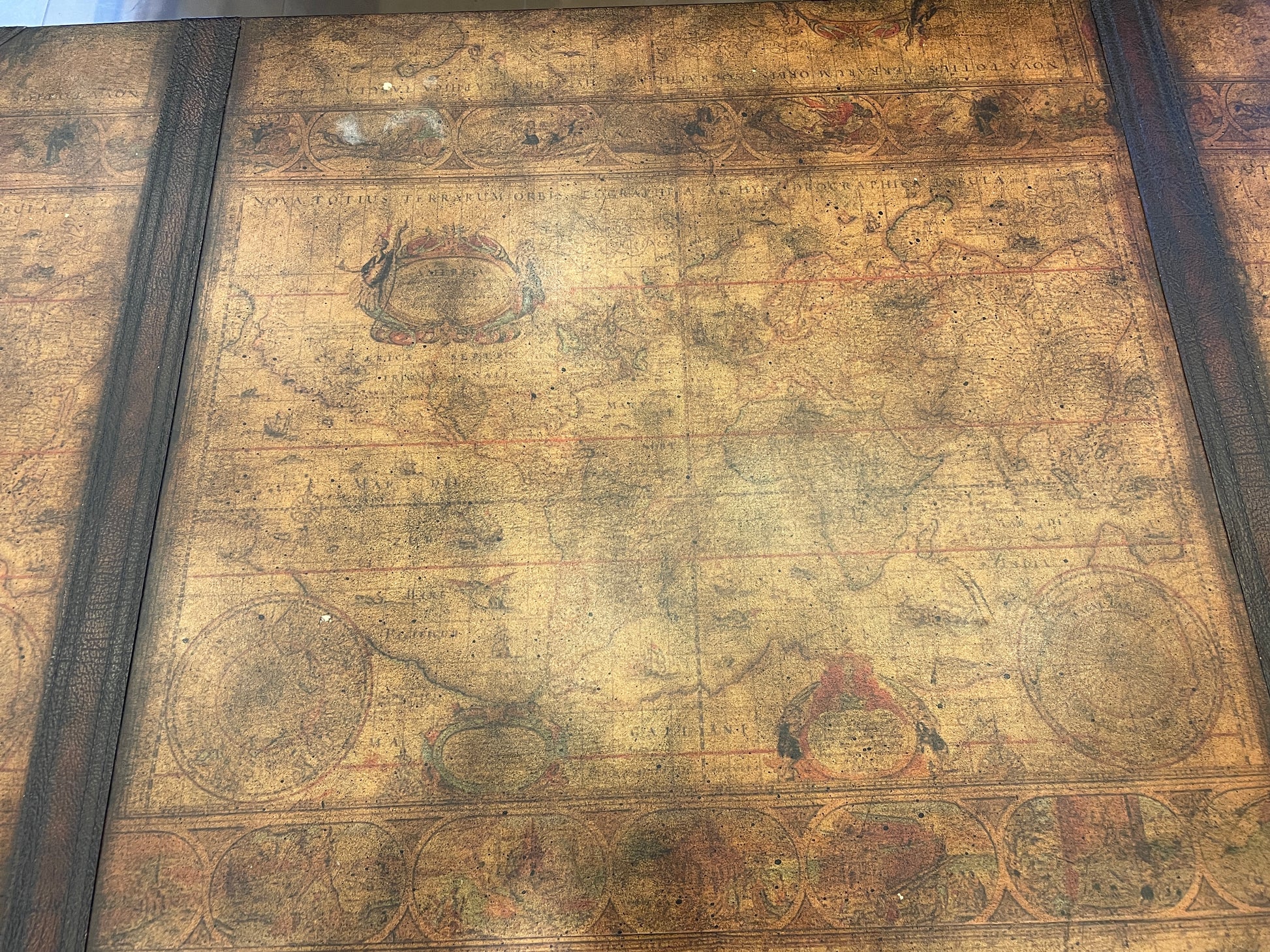 Unique trunk style coffee table with map design. This coffee table is designed to look like a large trunk. It has a soft suitcase-like handle that is used to pull out the one drawer. The piece has two non functional straps with buckles to further make it look like a trunk. The table has a repeating map design across the wood that includes multiple different styles of maps of the world. The bottom of the table has a scalloped design, and sits atop bun shaped feet. A unique conversation piece that adds personality to a space.