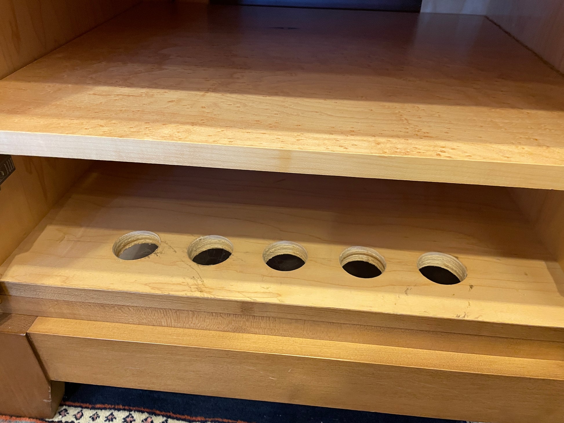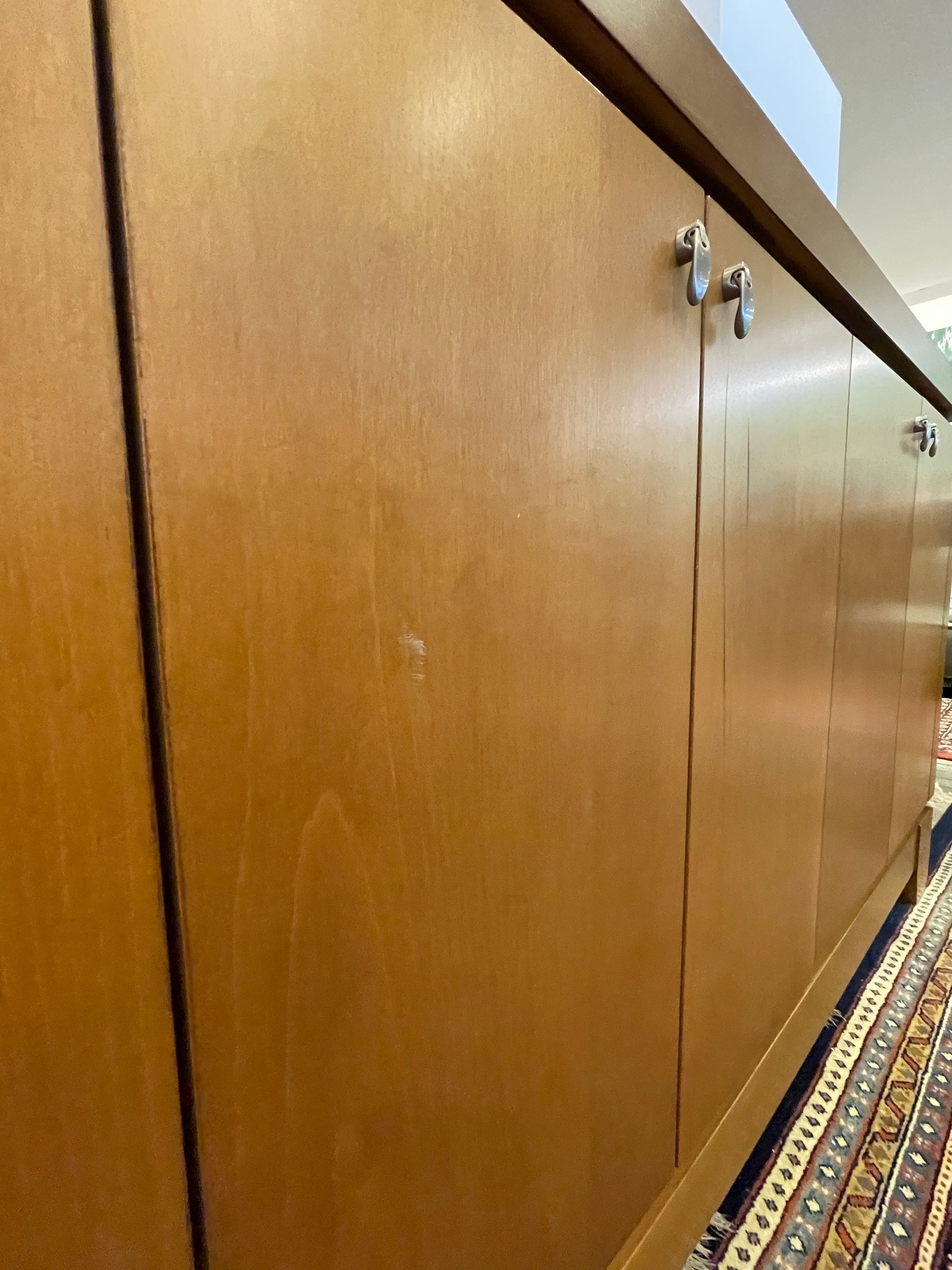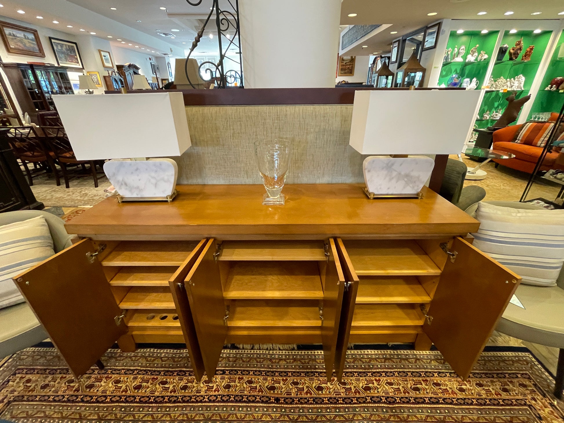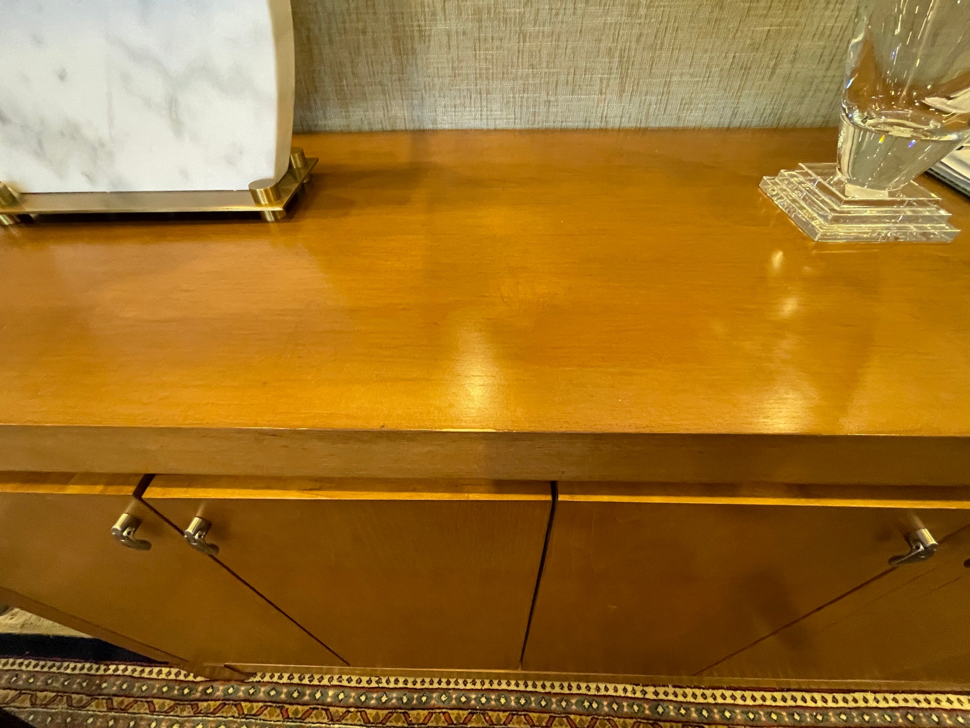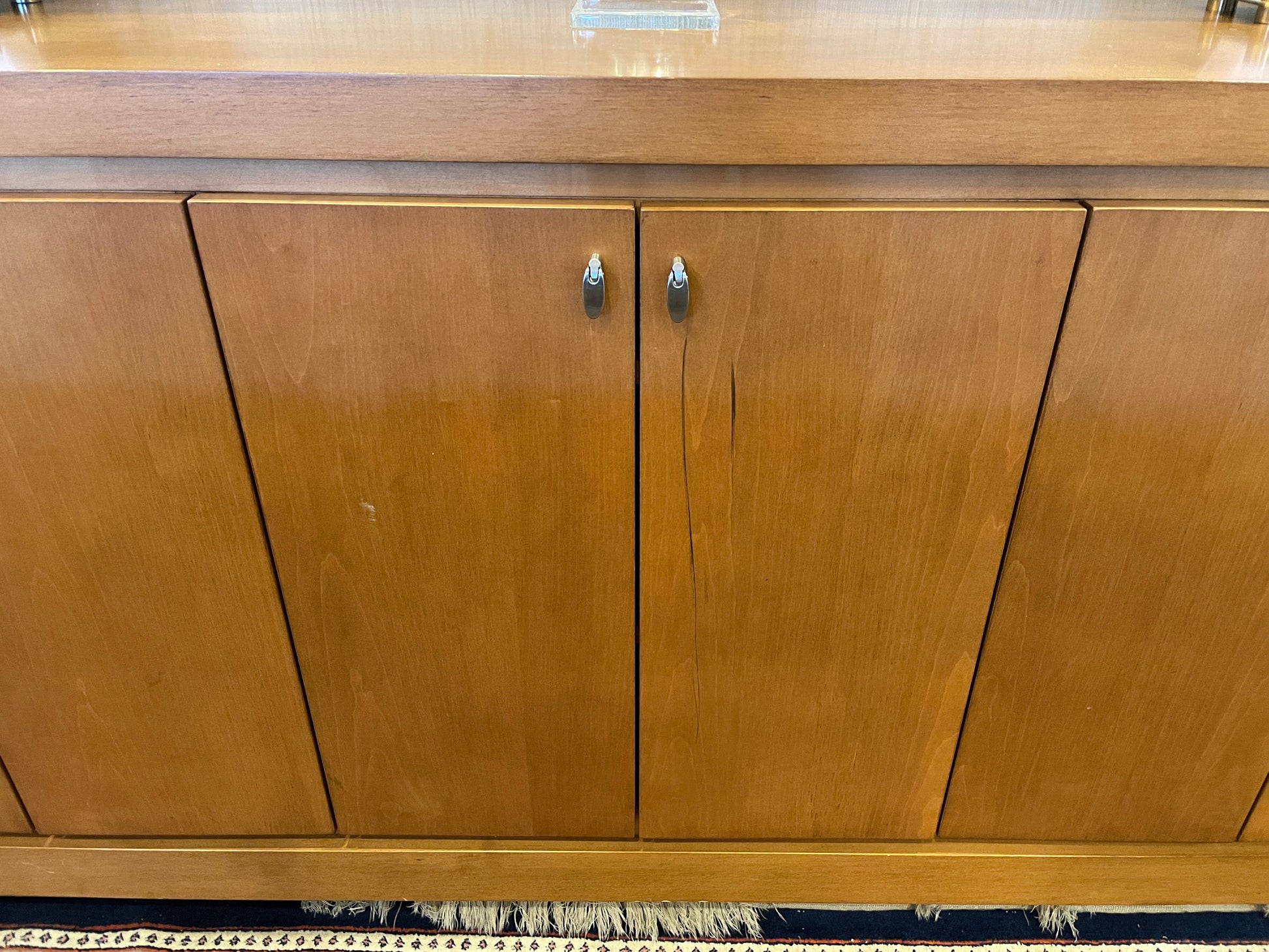 Maple wood television/dining console. This sleek console table features three cabinets all with adjustable shelves. The lower left shelf features holes for easy cable storage. The metallic handles are a unique teardrop-like shape that is attached to a hinge. The console sits on short block feet. With its squared appearance and beautiful maple wood color, this mid-century modern piece is the perfect table to fill up a space.