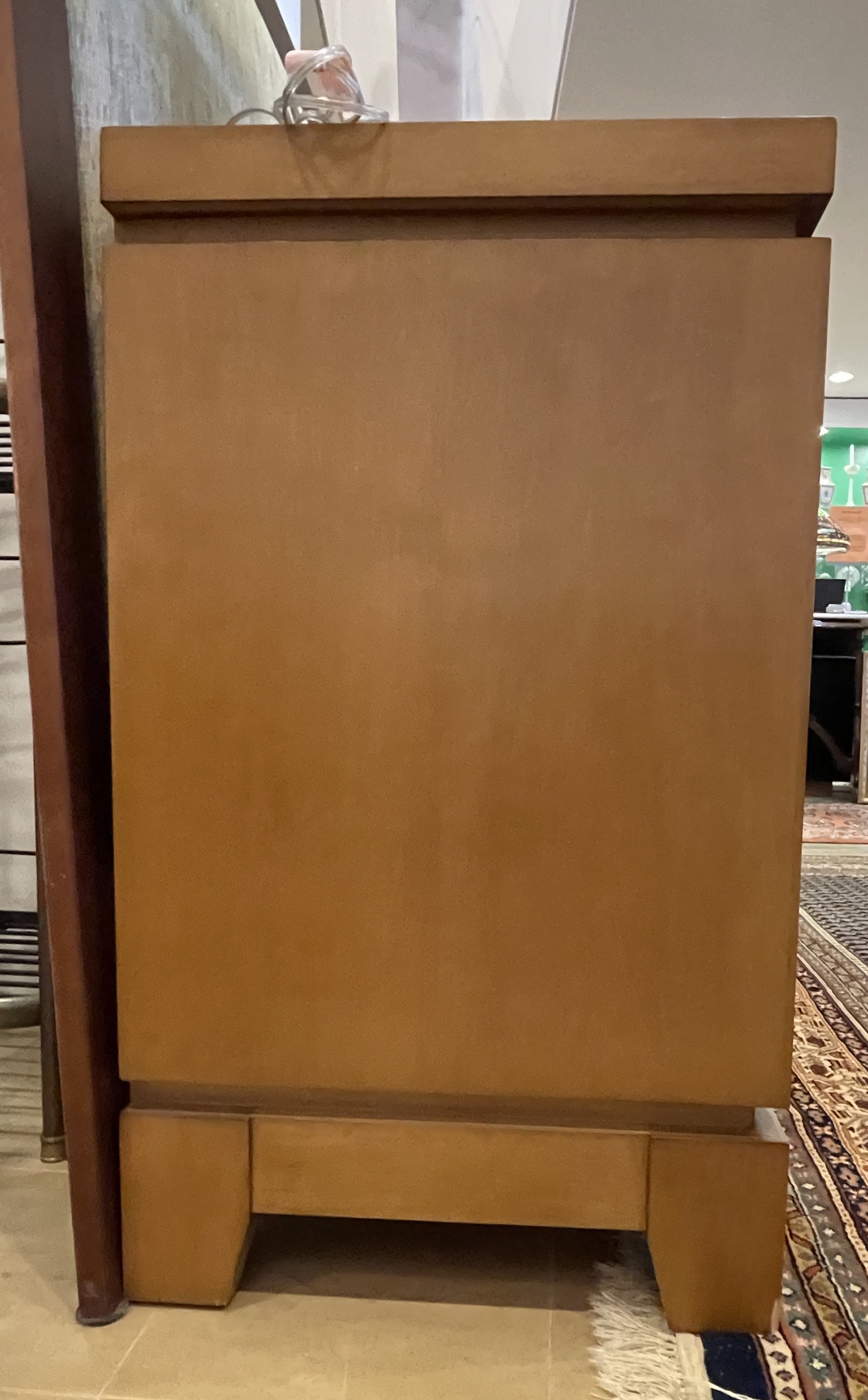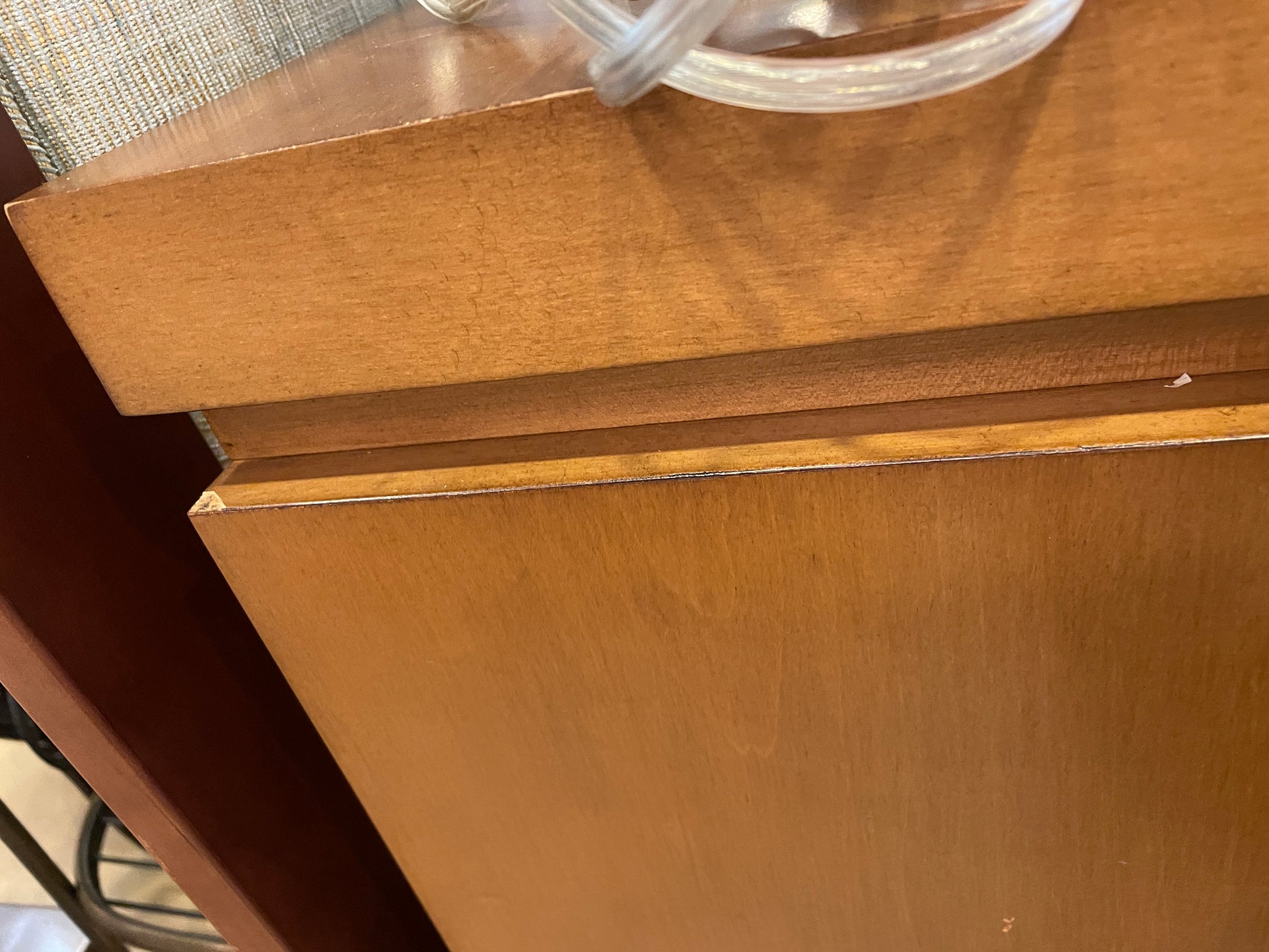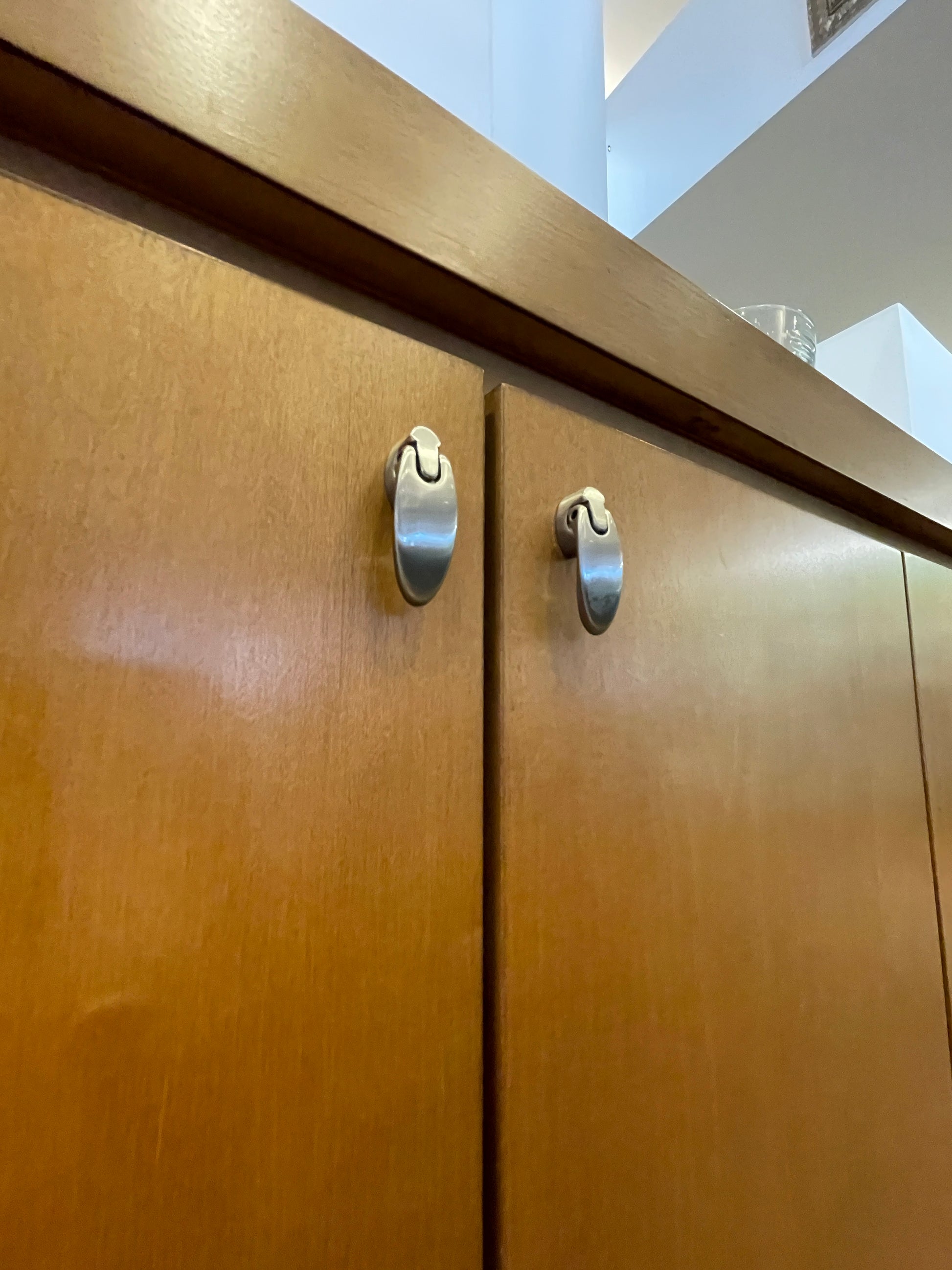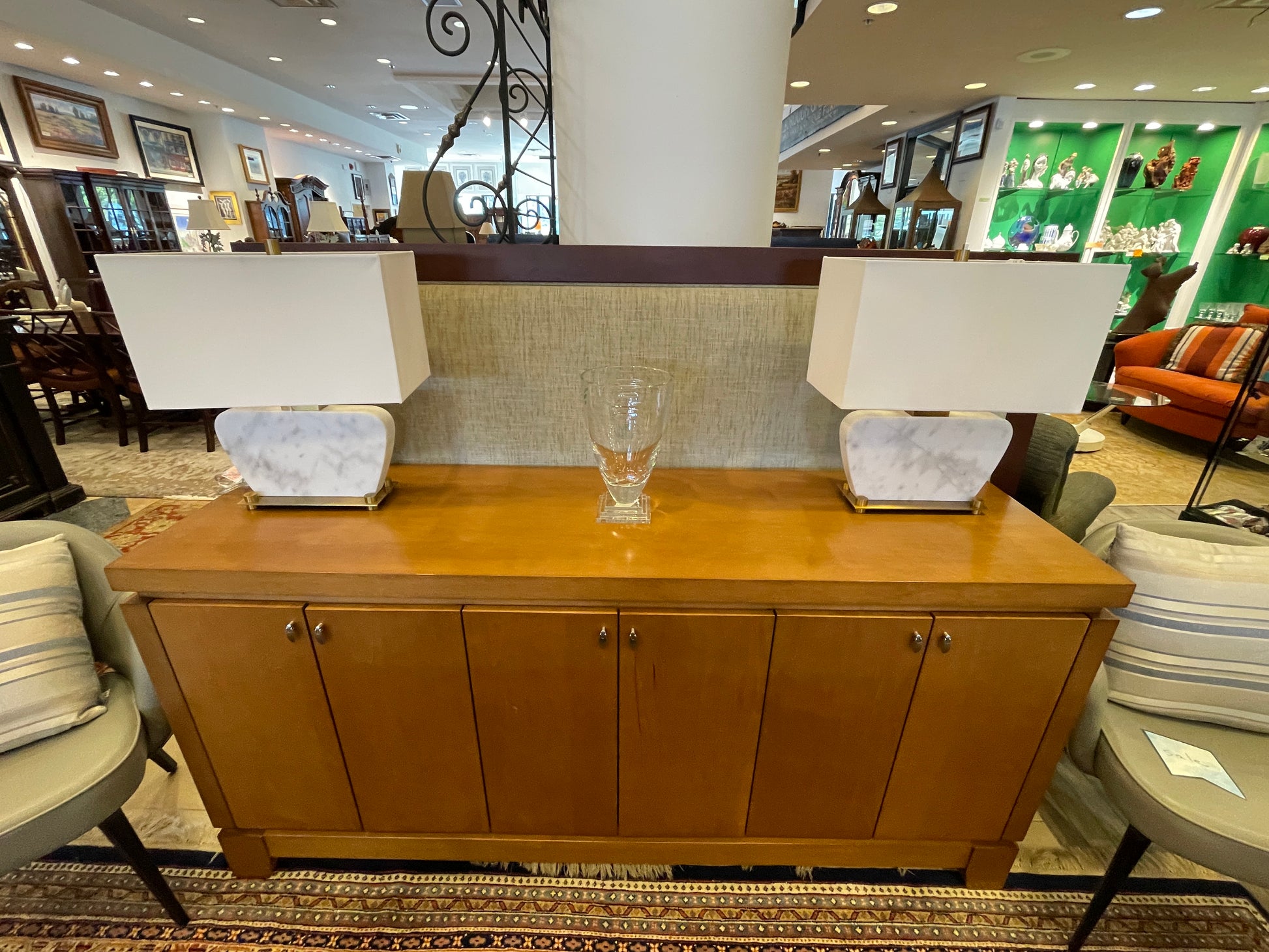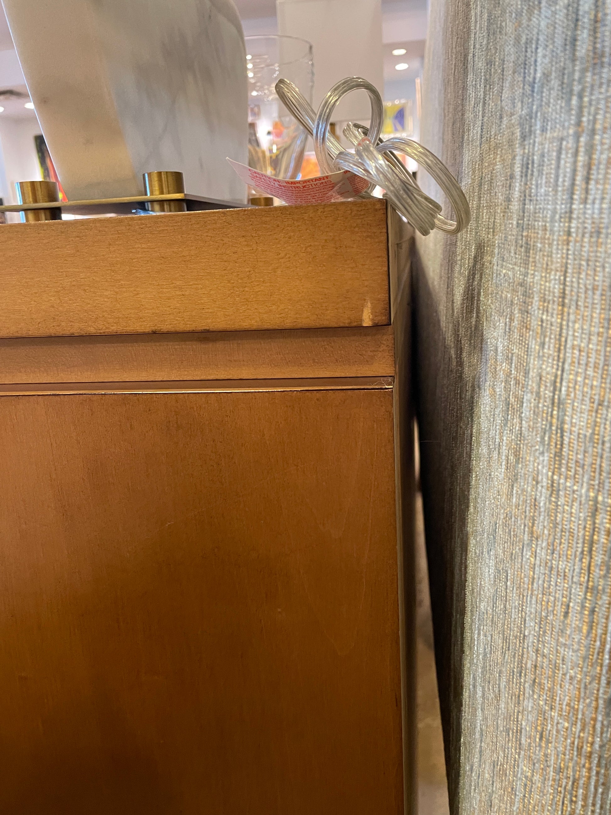 Maple wood television/dining console. This sleek console table features three cabinets all with adjustable shelves. The lower left shelf features holes for easy cable storage. The metallic handles are a unique teardrop-like shape that is attached to a hinge. The console sits on short block feet. With its squared appearance and beautiful maple wood color, this mid-century modern piece is the perfect table to fill up a space.