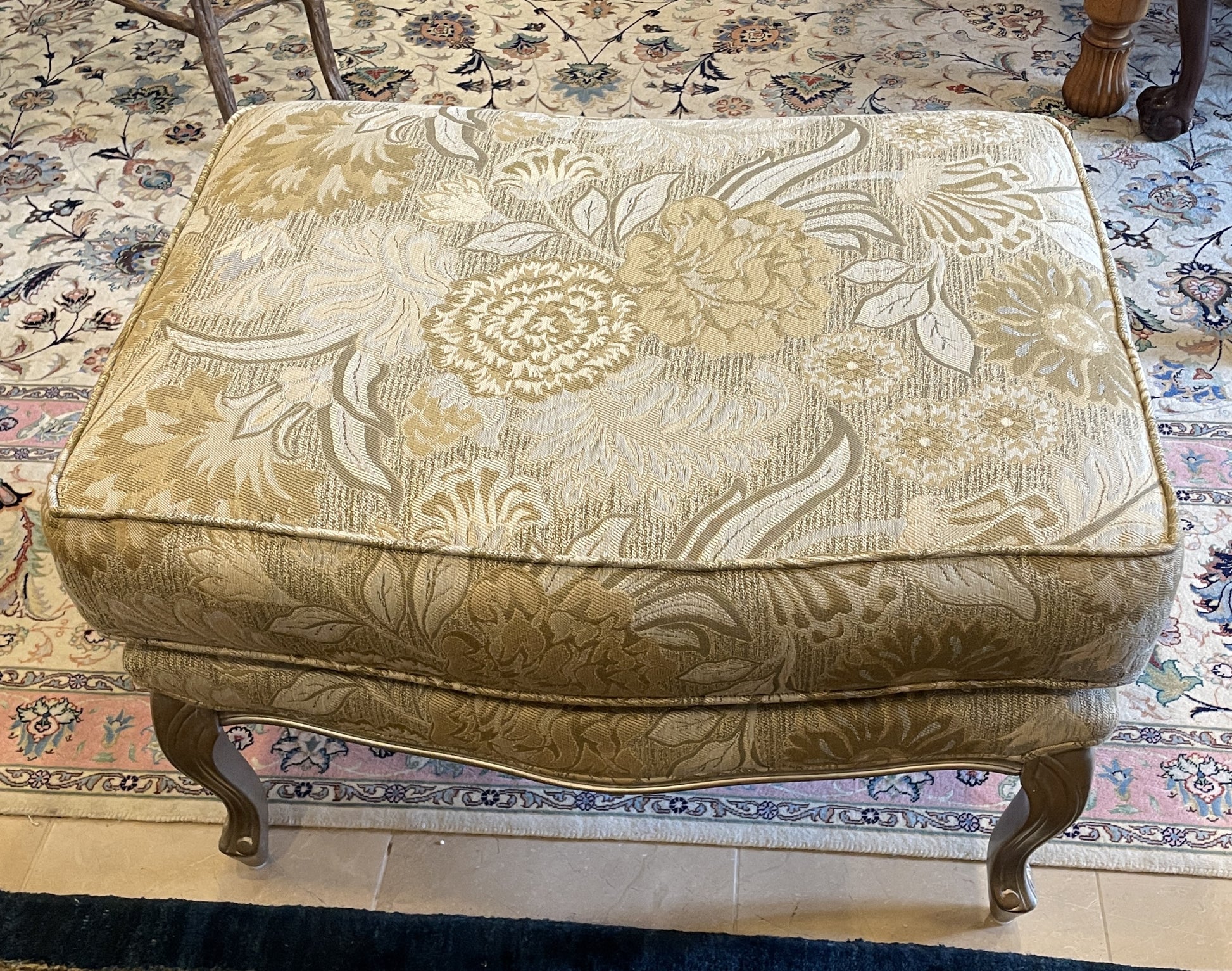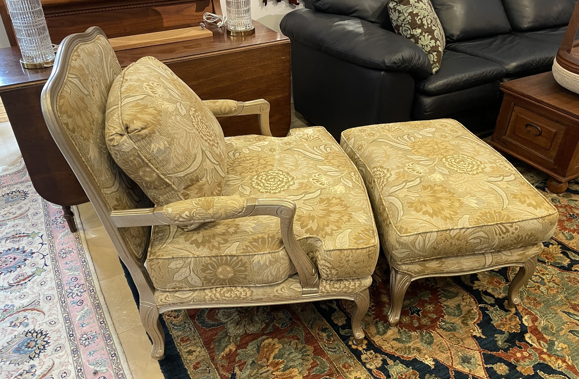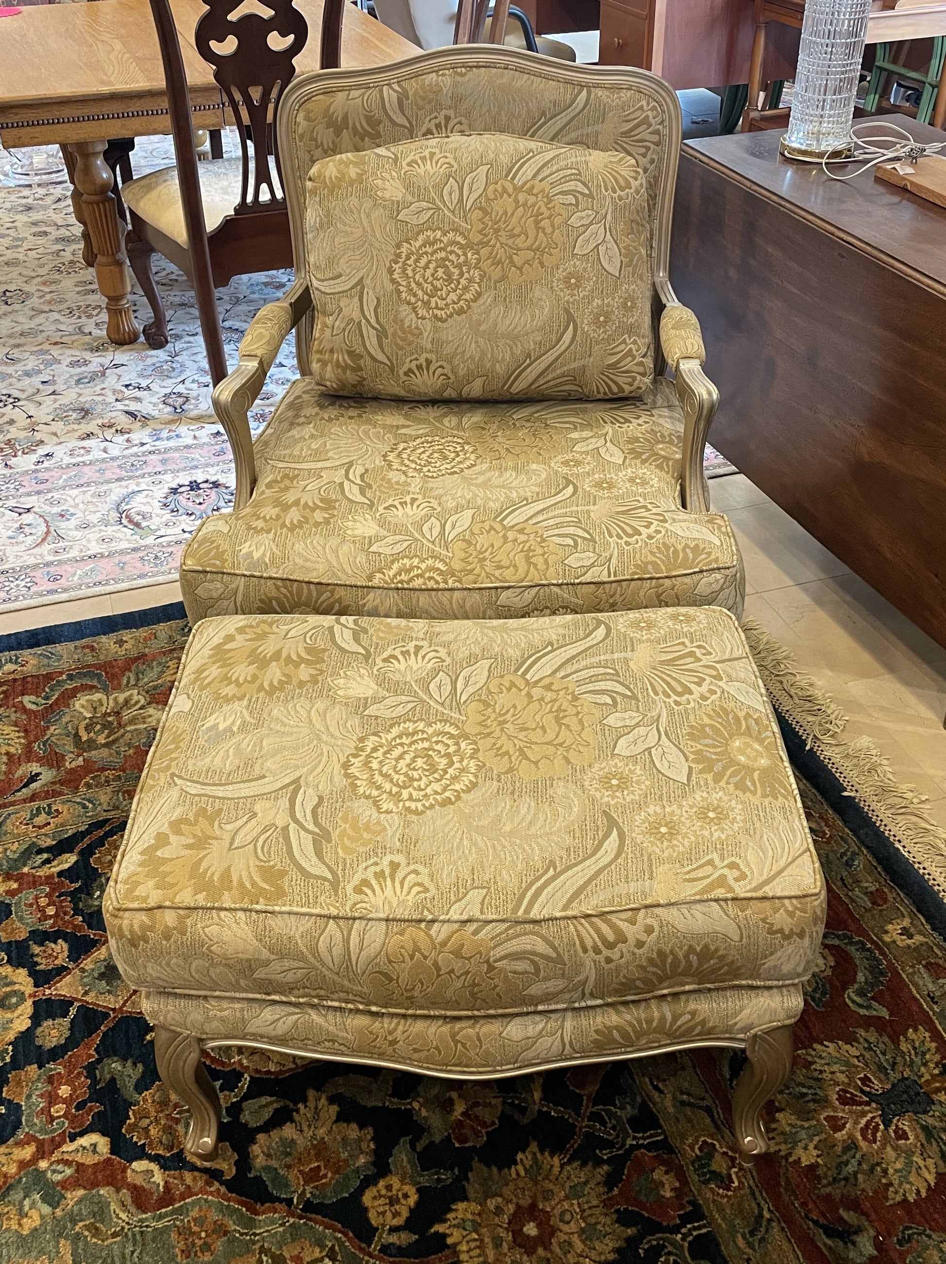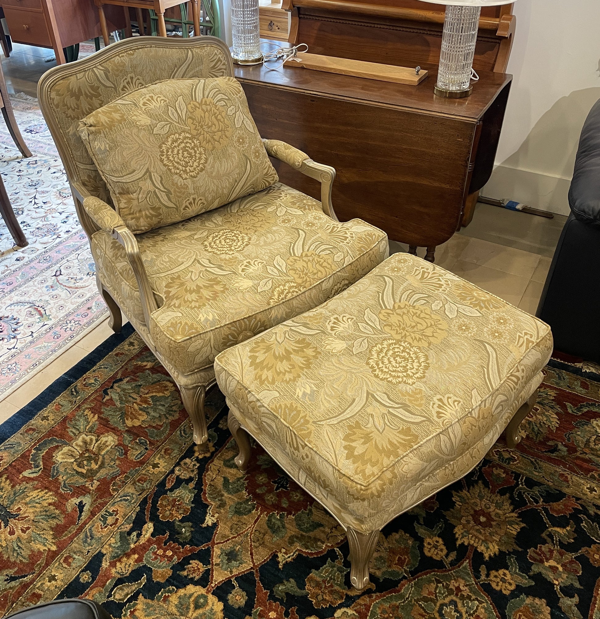 Marge Carson chair and ottoman set. This set features a Louis XV style chair upholstered in beige and gold floral fabric, and a matching ottoman. Each piece sits atop four cabriole legs with tapered feet. The wood frames have a light finish. This beautiful set is a comfortable and classy addition to any space.