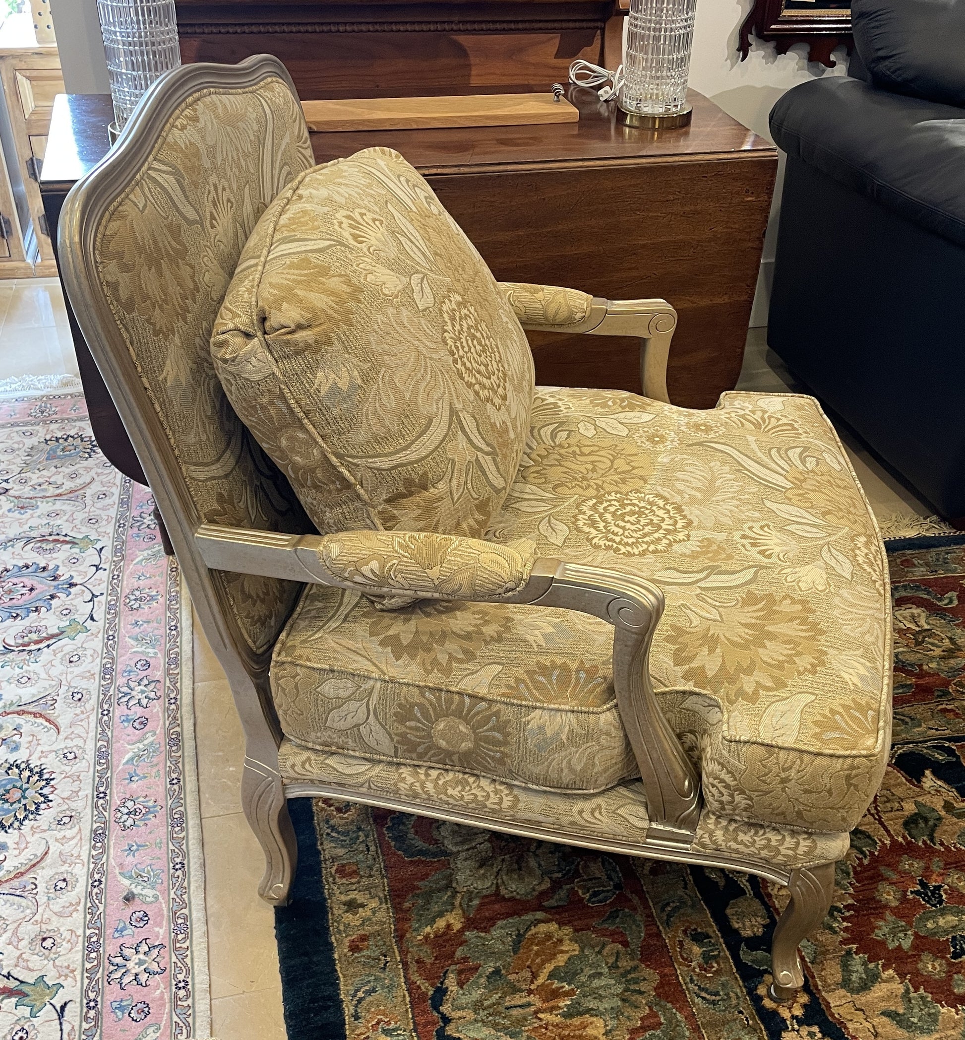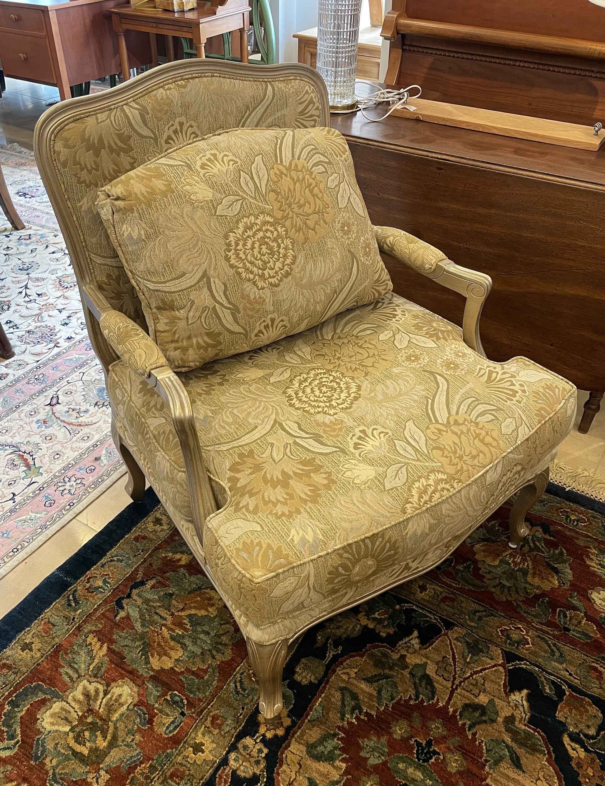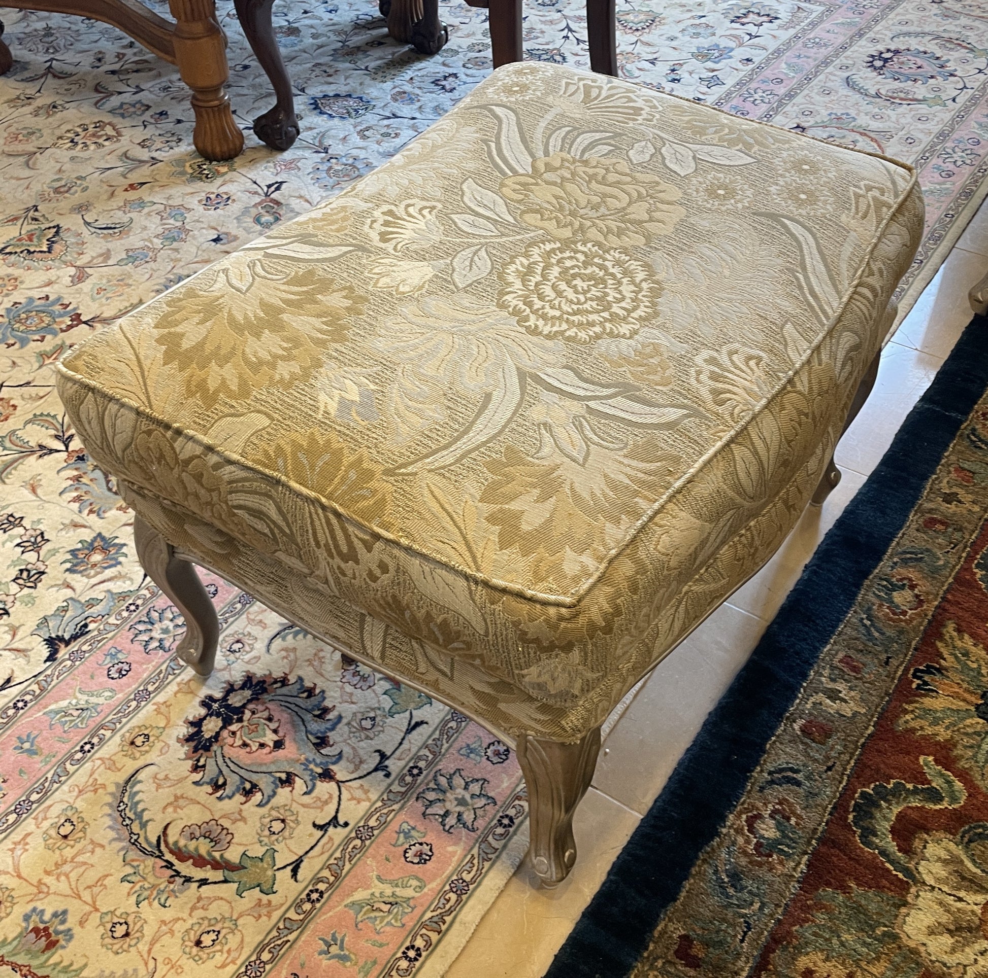 Marge Carson chair and ottoman set. This set features a Louis XV style chair upholstered in beige and gold floral fabric, and a matching ottoman. Each piece sits atop four cabriole legs with tapered feet. The wood frames have a light finish. This beautiful set is a comfortable and classy addition to any space.