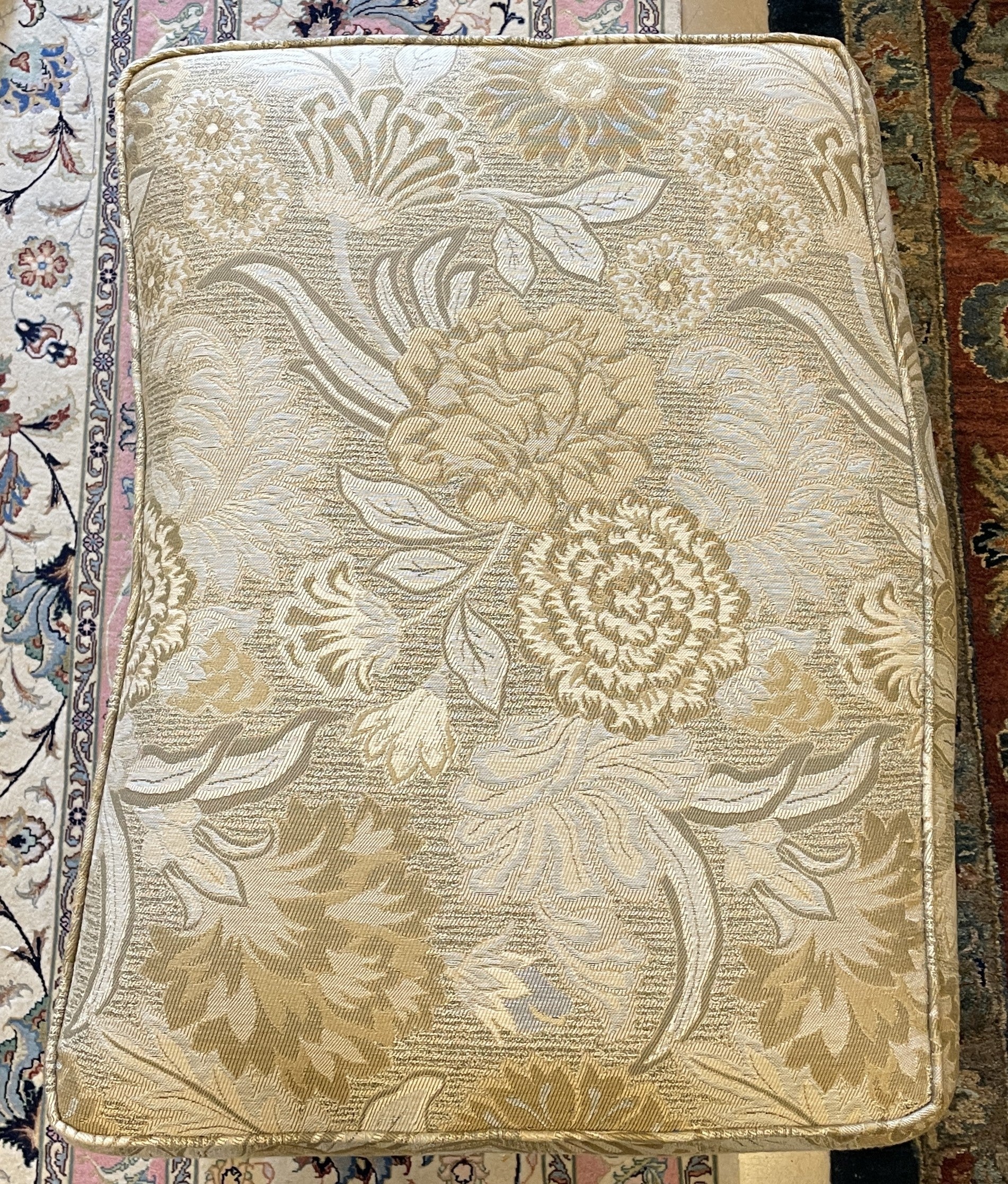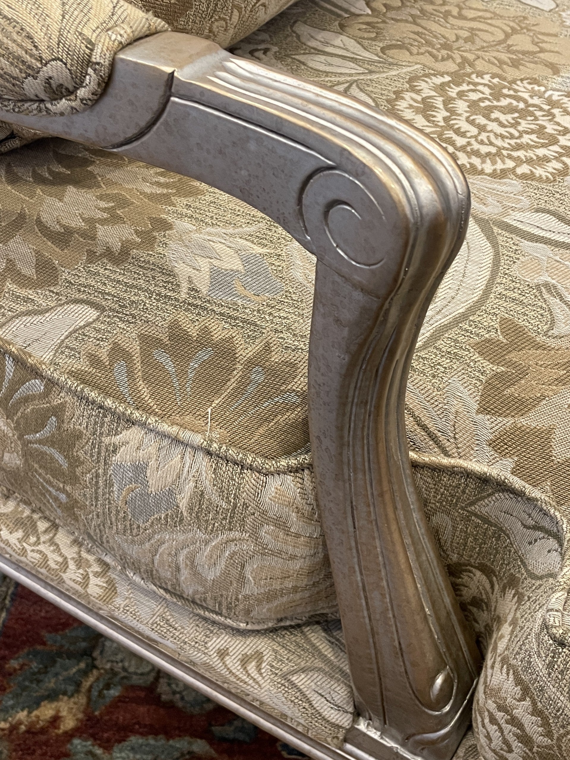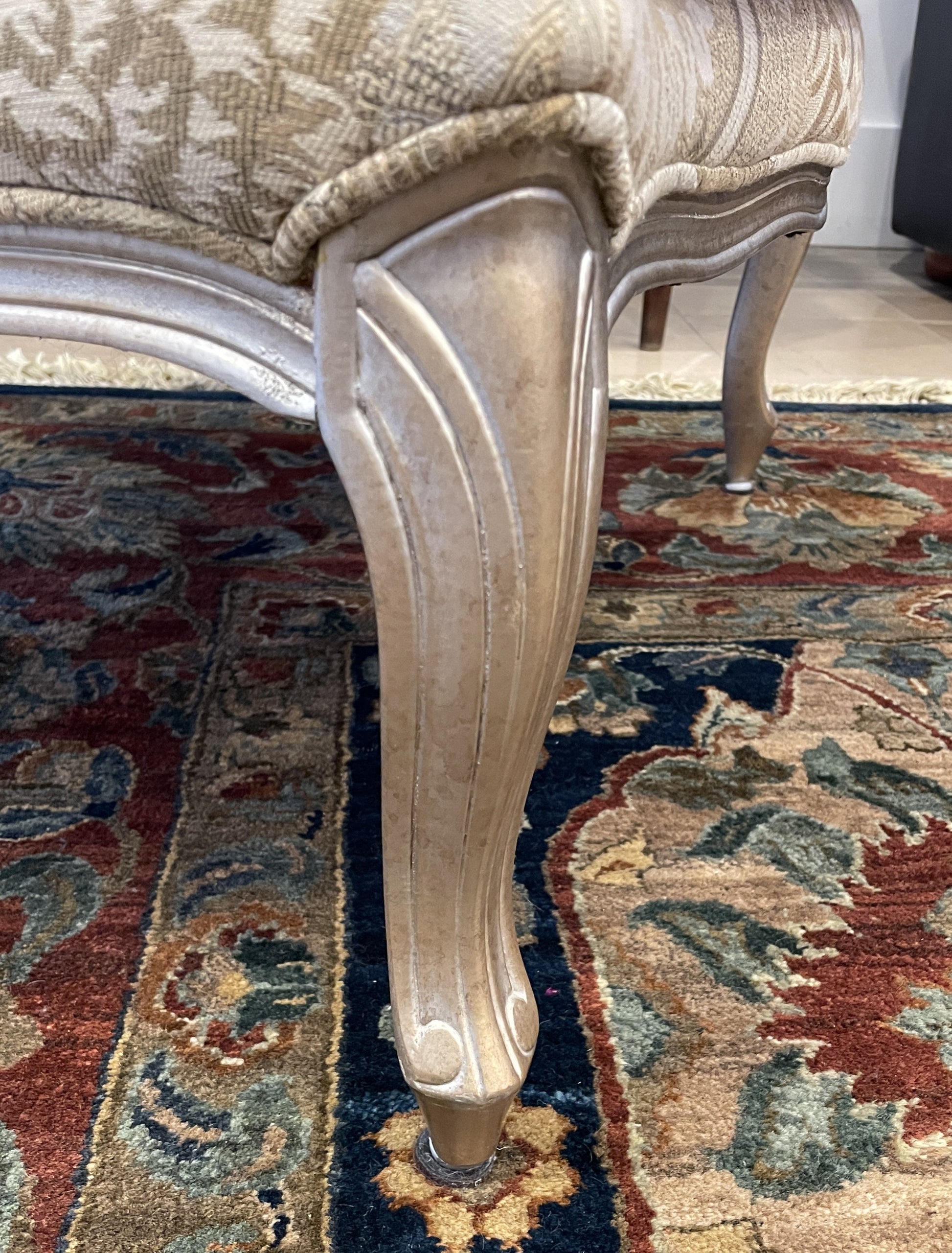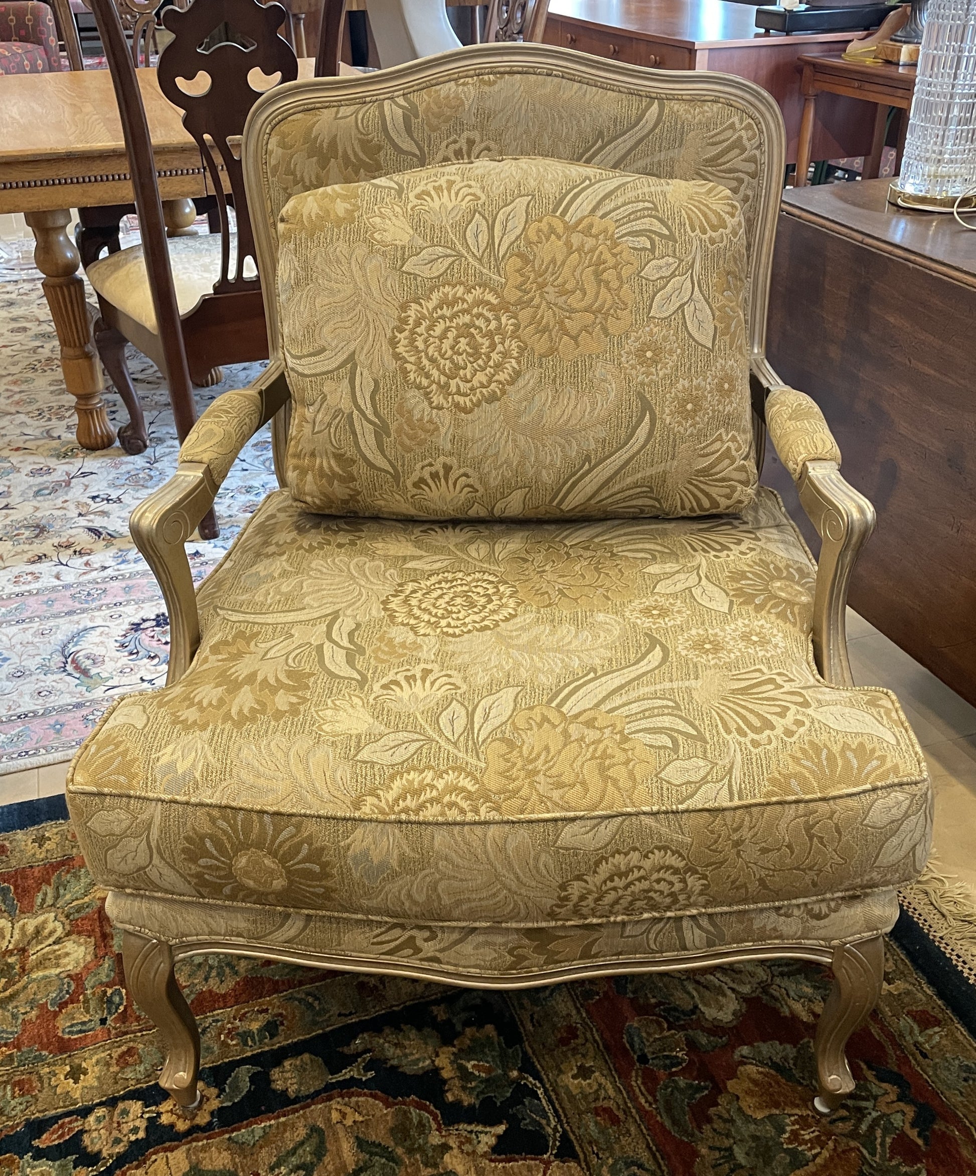 Marge Carson chair and ottoman set. This set features a Louis XV style chair upholstered in beige and gold floral fabric, and a matching ottoman. Each piece sits atop four cabriole legs with tapered feet. The wood frames have a light finish. This beautiful set is a comfortable and classy addition to any space.
