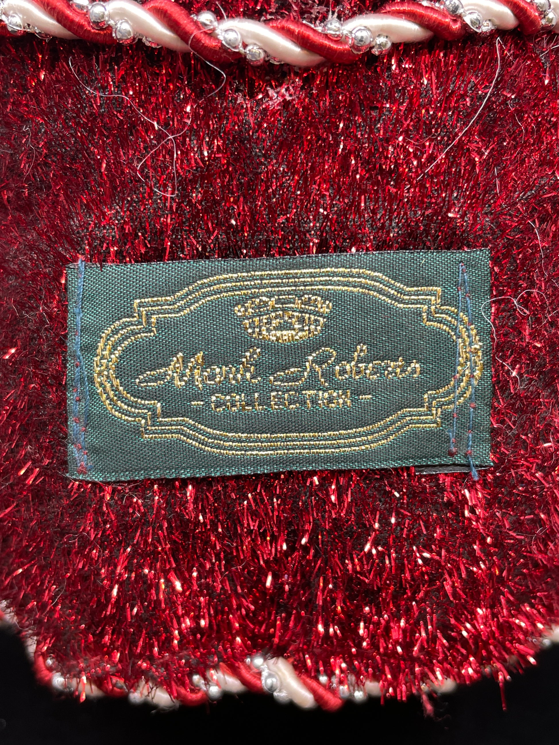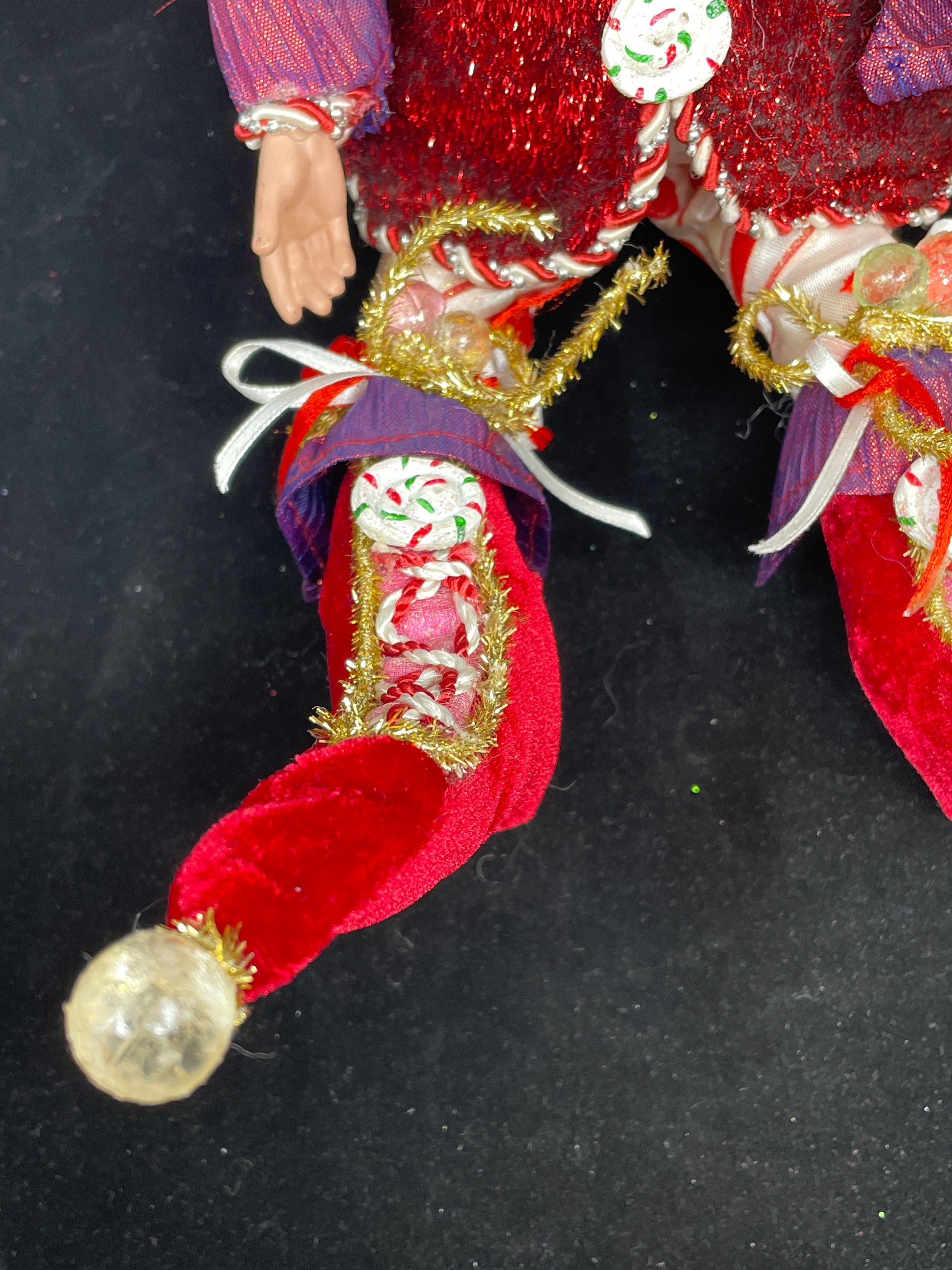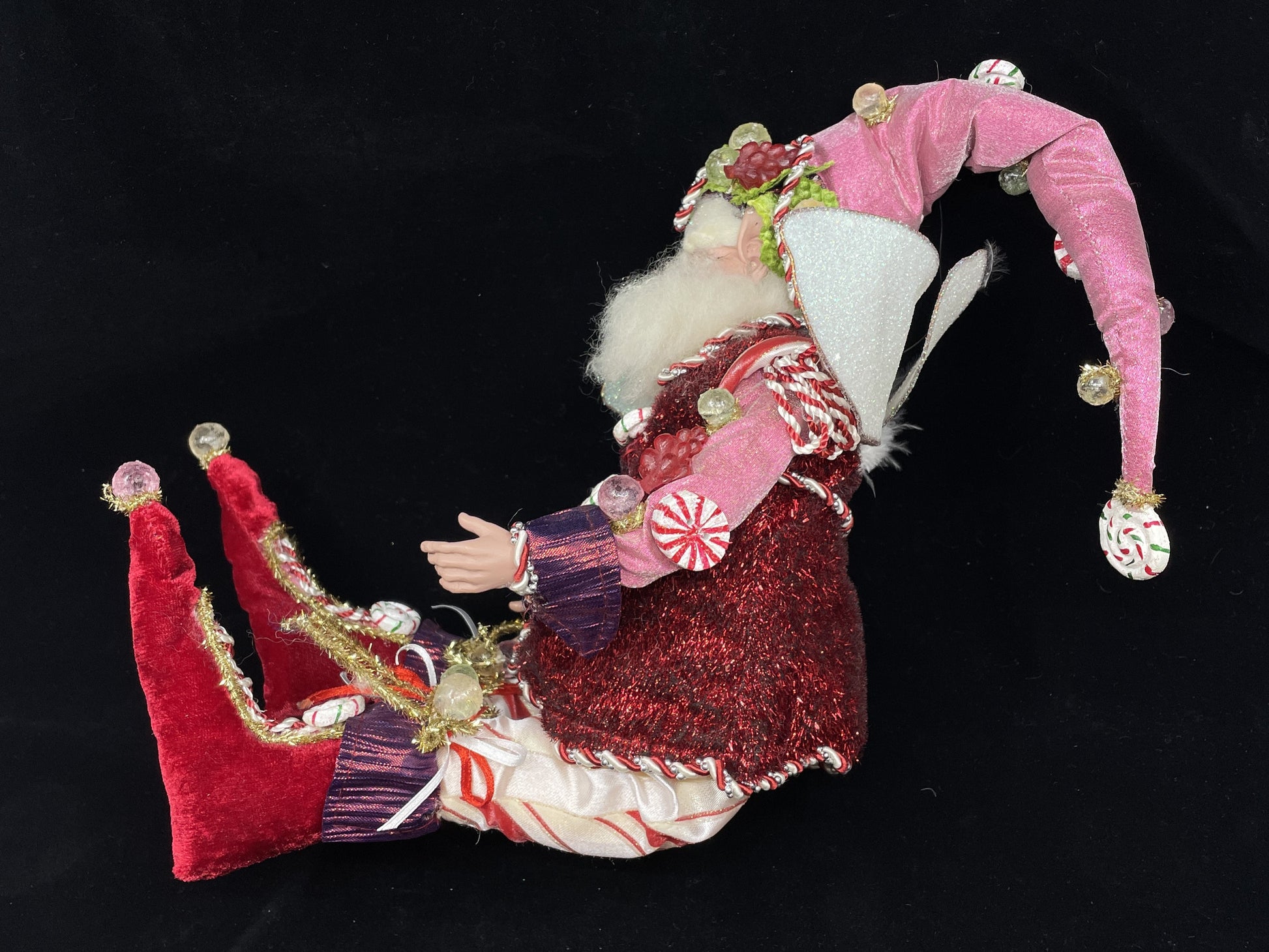 Mark Roberts peppermint fairy. This charming figure of a Santa fairy has a peppermint theme. His clothes are shades of pink, red, and white with sparkling details throughout. He wears a best with a candy cane trim and peppermint buttons. His shoulders are covered with peppermint pads, and his hat is covered in a variety of candies. His shoes have pompom toes and peppermint accents as well. The figure has glittering fairy wings that can be posed thanks to their wire supports. An adorable festive piece that's sure to brighten up any setting.
