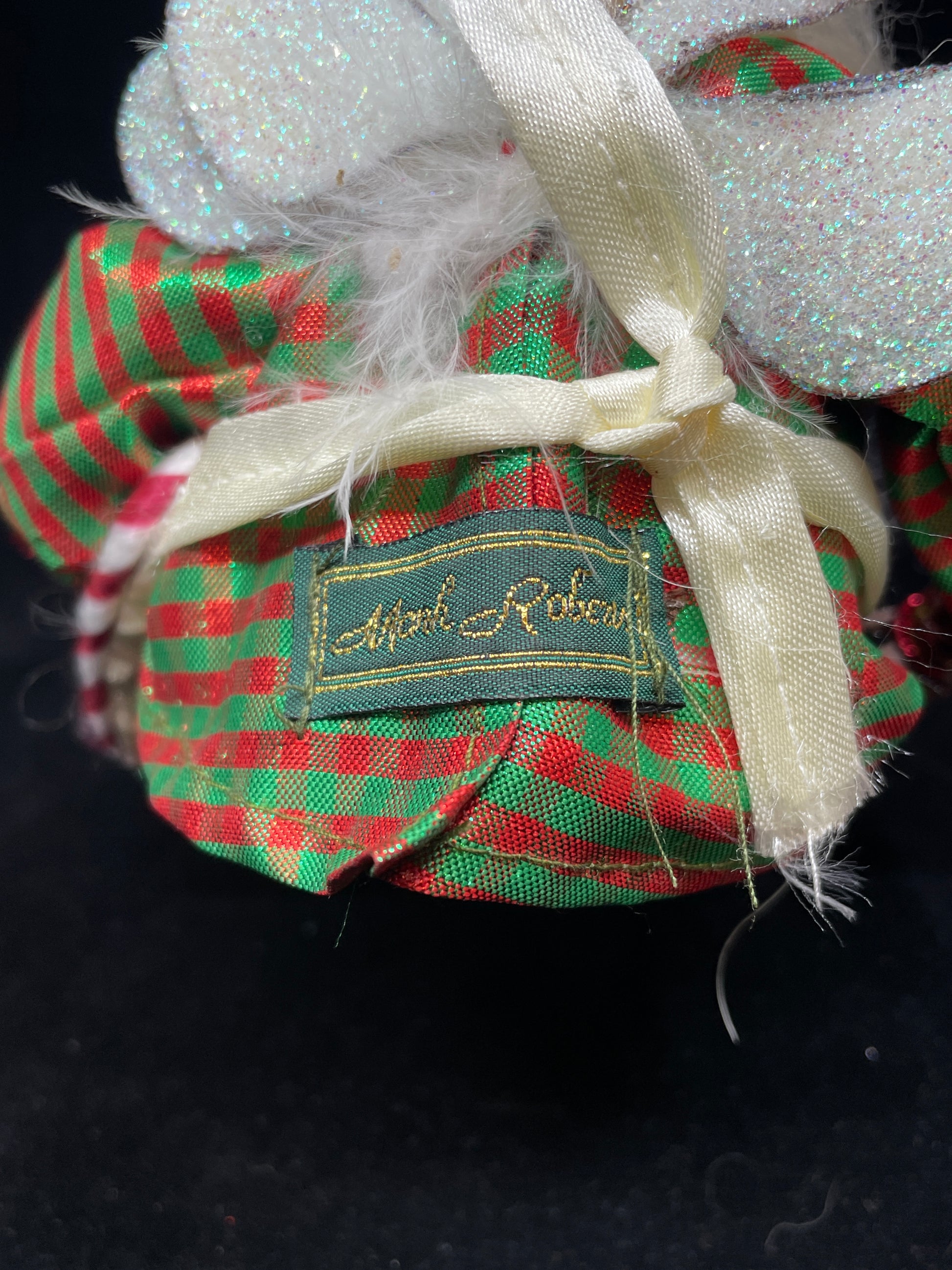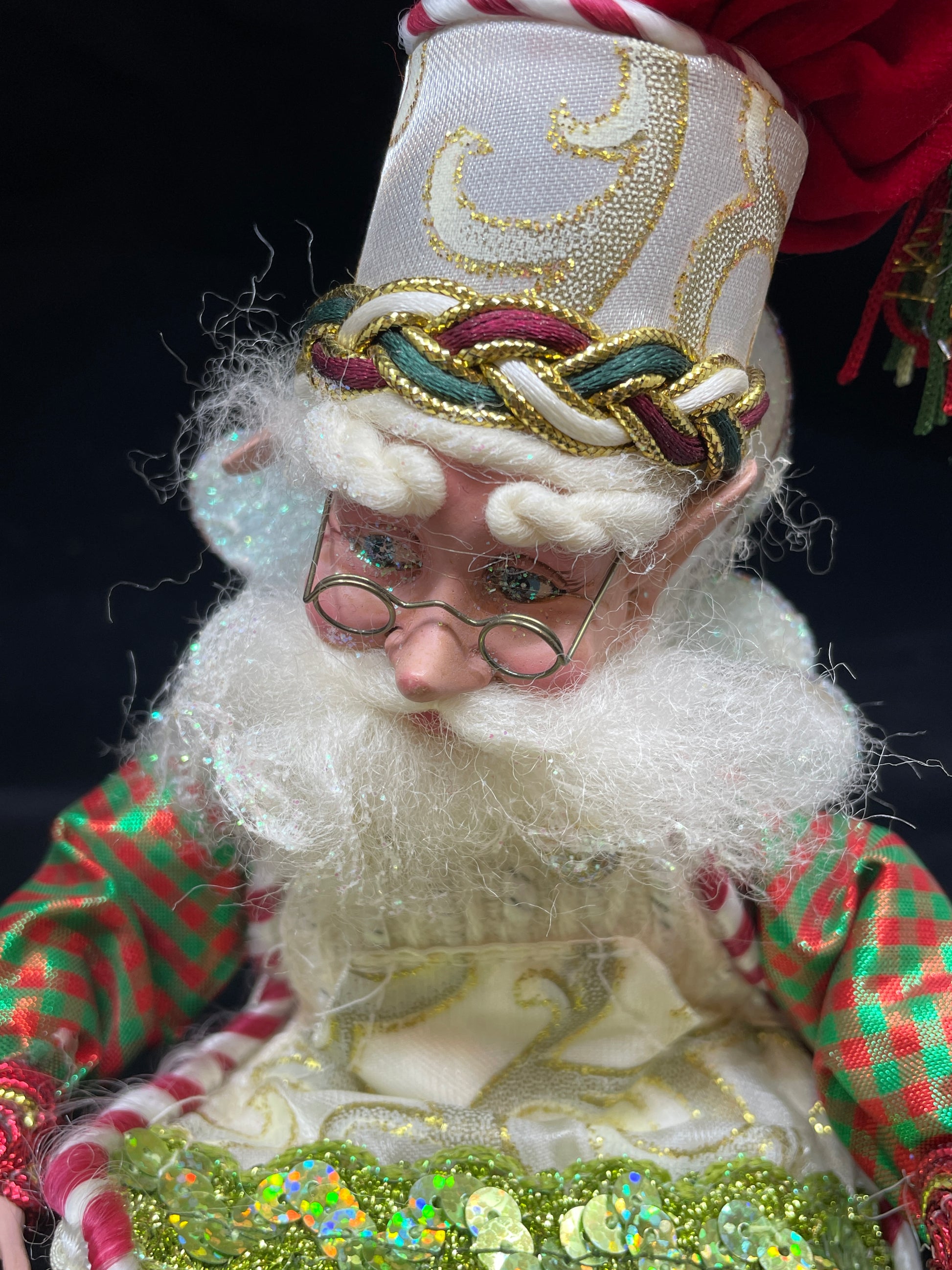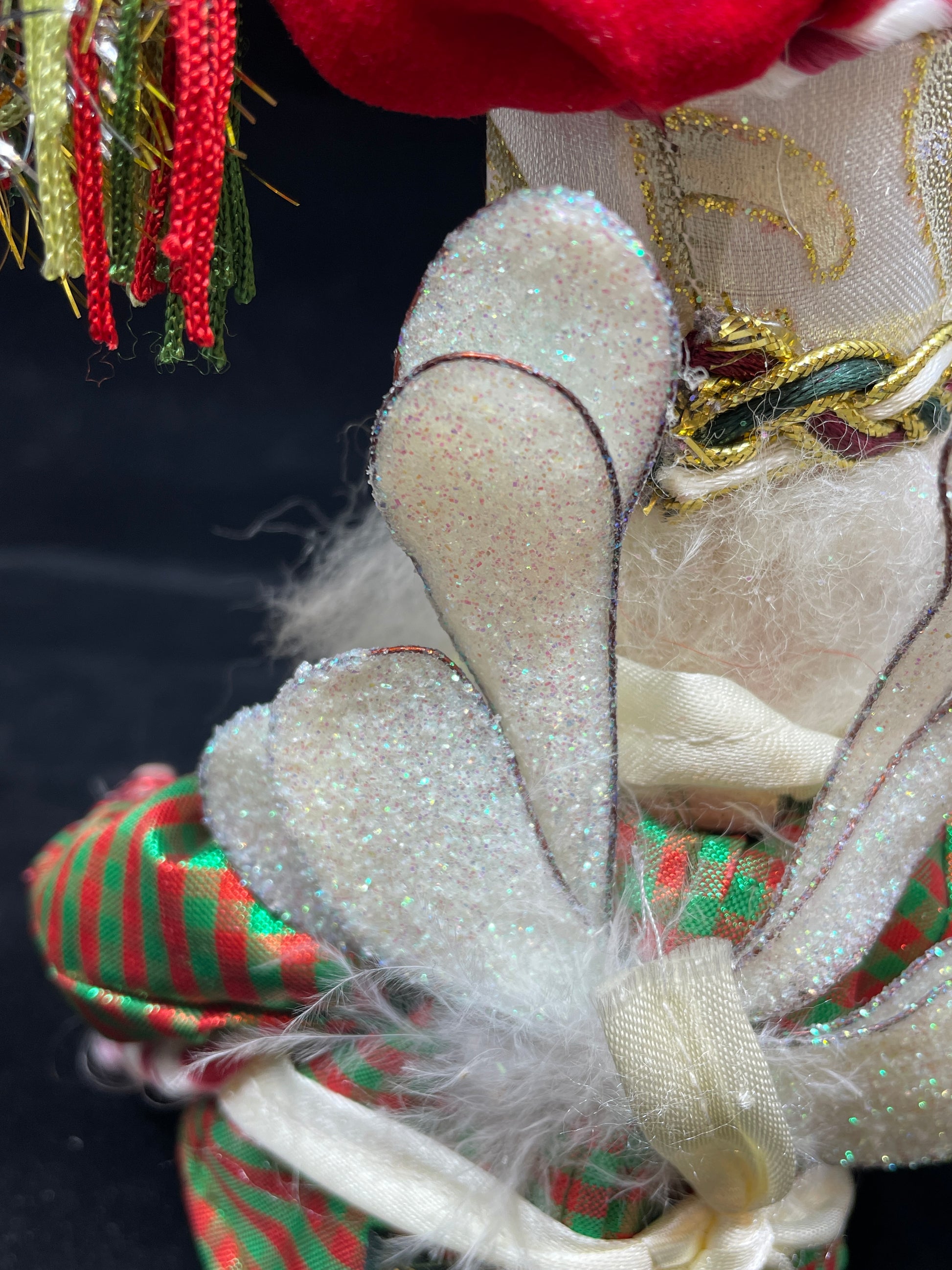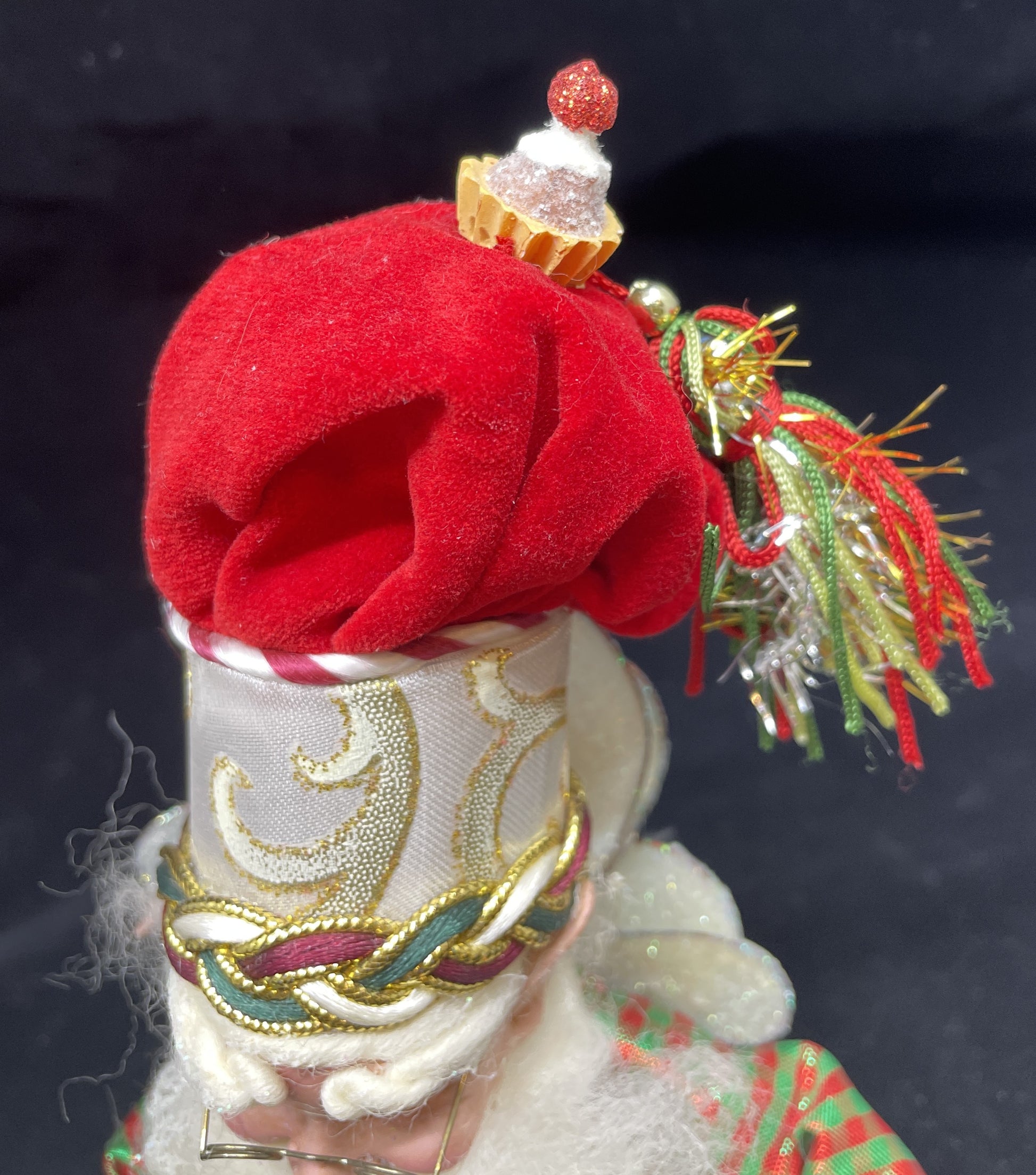 Mark Roberts small fairy. This charming little figure features a Santa fairy wearing festive baking attire. He wears an off white apron with a green ribbon trim. Under the apron is a shirt checkered with red and green. The fairy also wears a hat similar to a chef's hat with a white trim with gold swirls, and a red cap. The very top of the hat has a colorful tassel in red and green, and a little cupcake charm. His boots are similarly decorated with ribbons and pie charms along with some leafy details. To top off the design, the fairy has his little glittery wings that can be posed with their wire exteriors. A charming festive piece that's full of Christmas cheer.