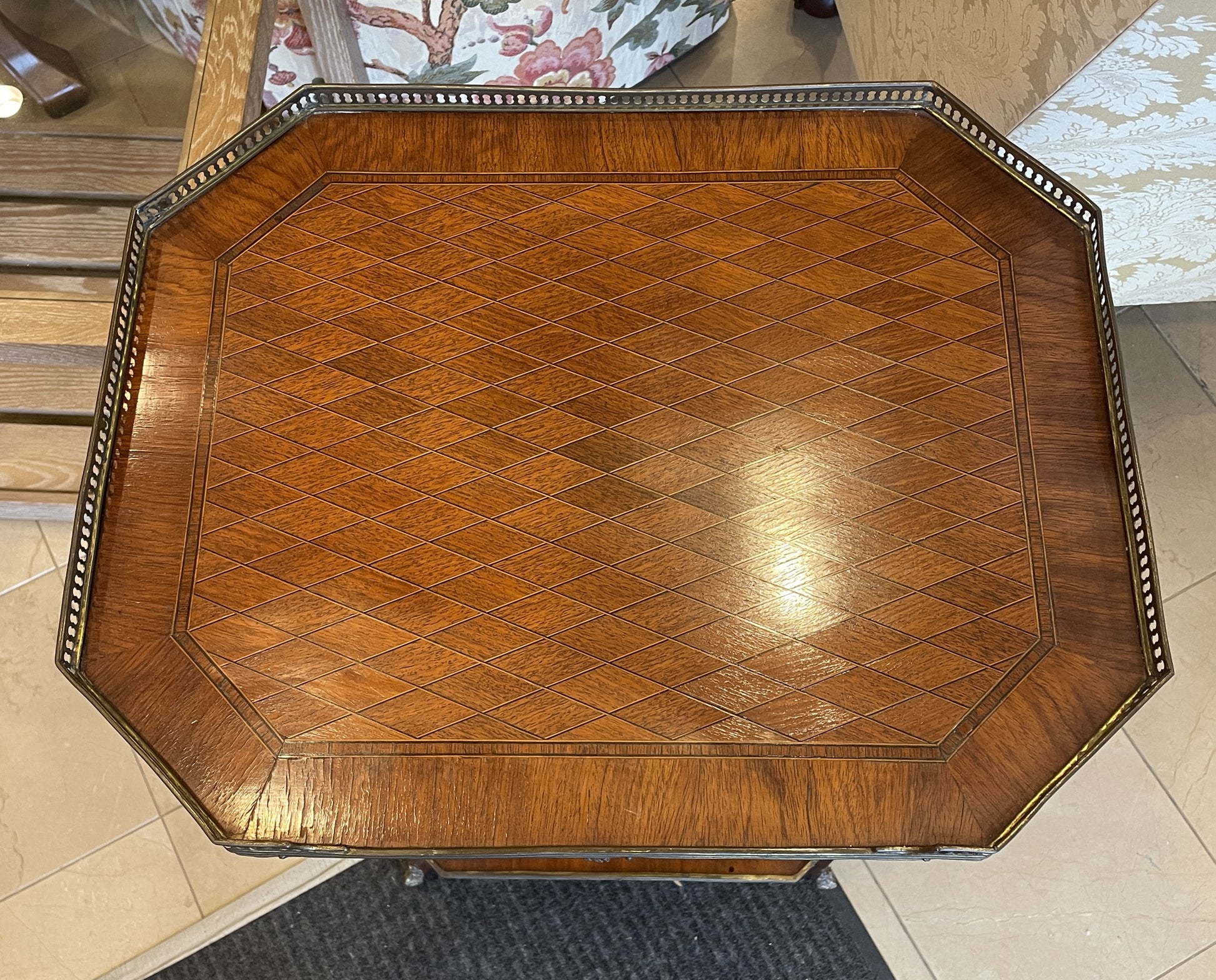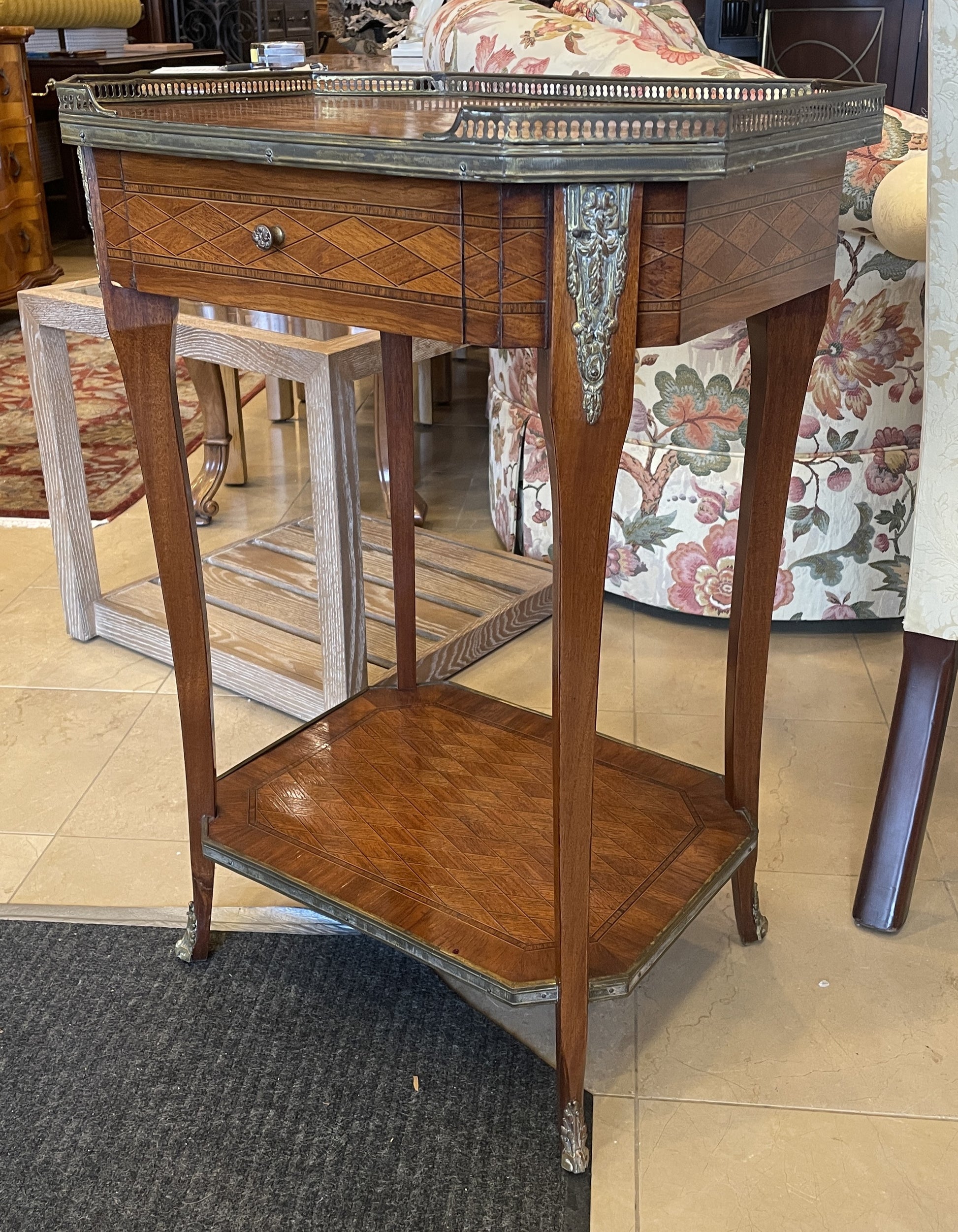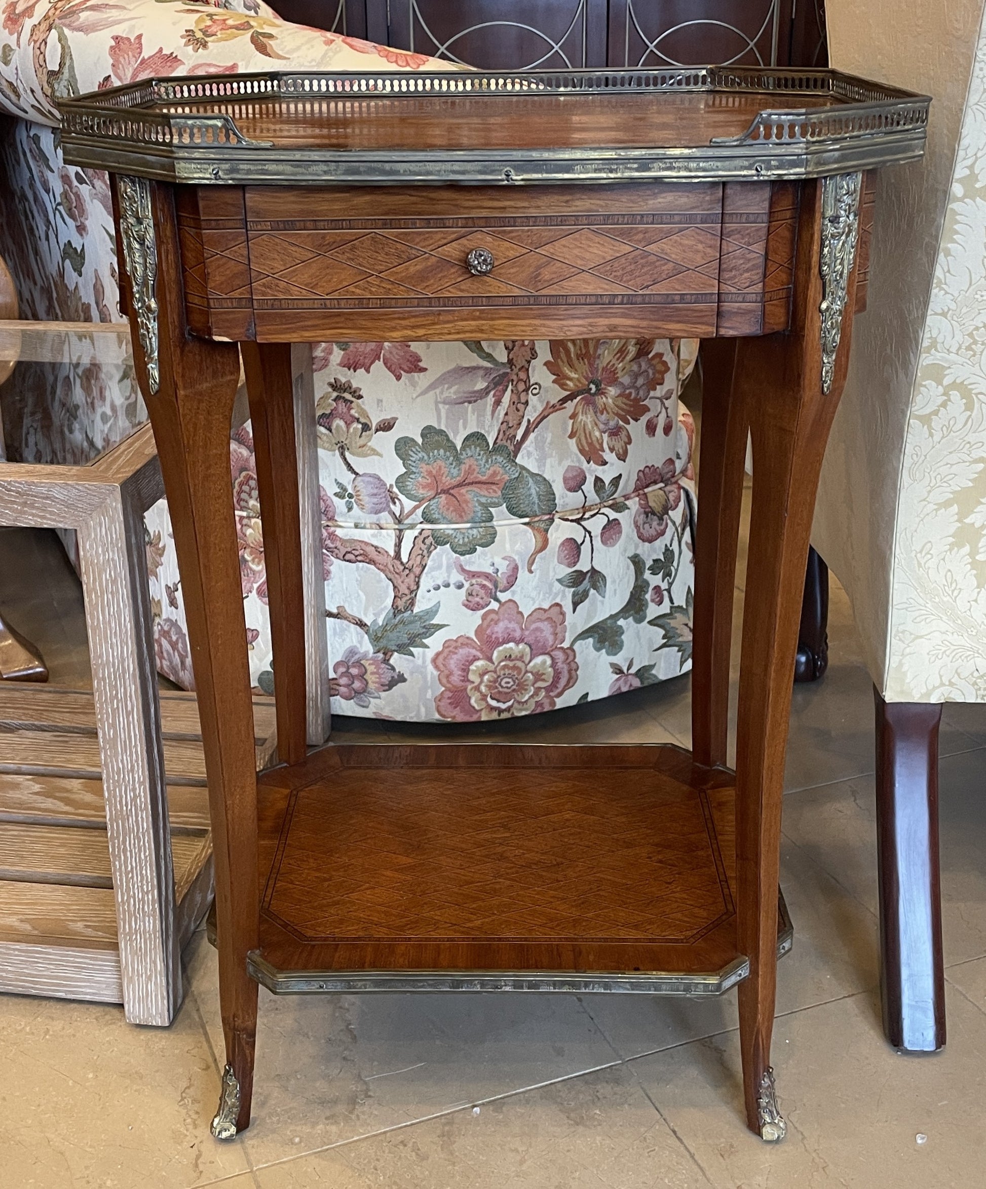 Gorgeous marquetry end table with brass gallery. This beautiful end table is an octagonal shape. The wood is a rich medium tone, which is complemented by the stunning brass accents. The piece sits on long, slender sabered legs with brass capped feet and ornate brass ormolu at their top. Between the legs rests a lower shelf. Both the tabletop and shelf have marquetry that includes a geometric diamond design in the center surrounded by a simple border. The edge of both the shelf and tabletop has a brass trim, and the tabletop also features a gallery that stretches around all sides of the piece but the front. The table includes one small drawer that sits just below the tabletop. The drawer opens with a small pull knob. A testament to quality craftsmanship that's sure to class up any space.