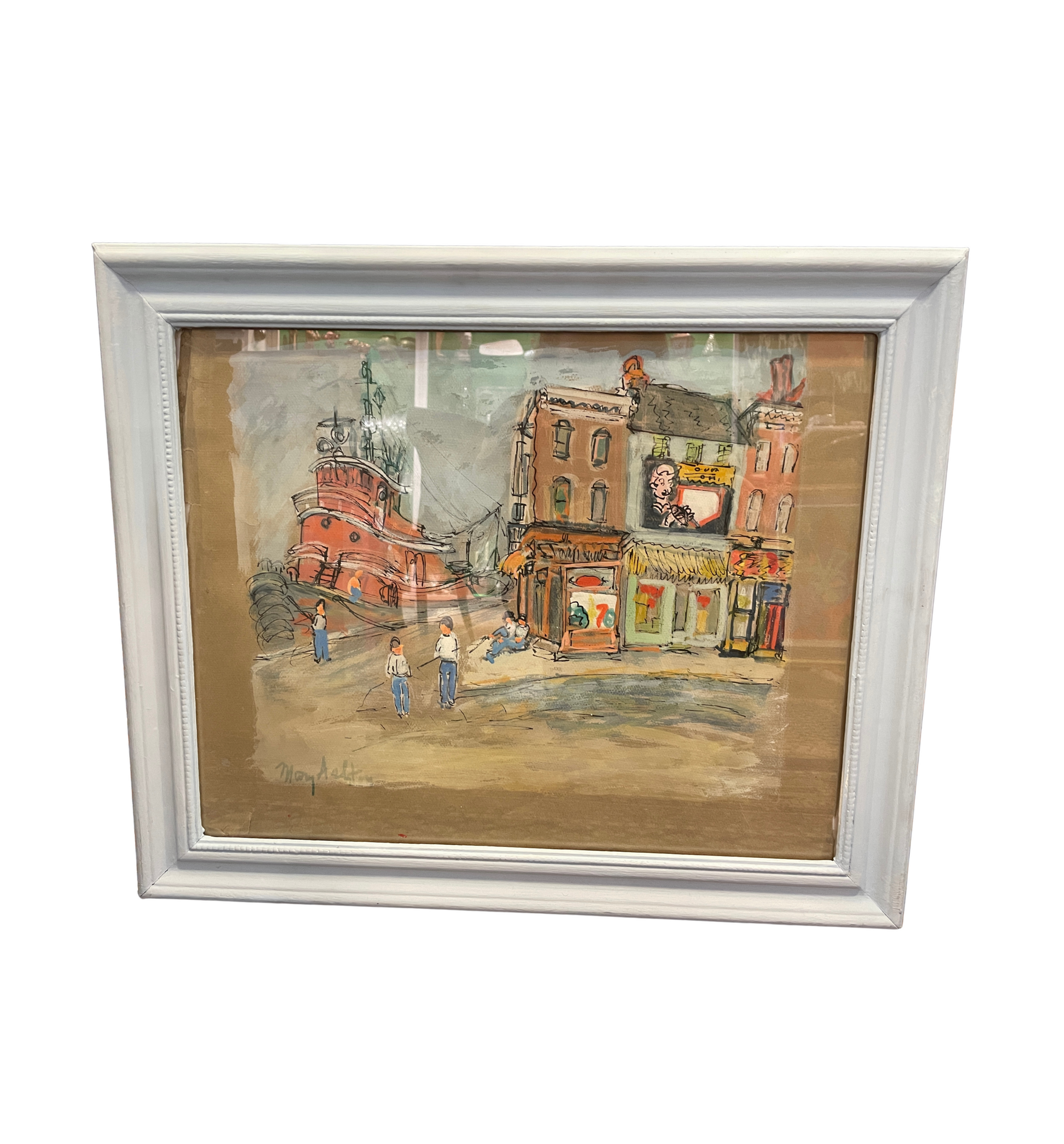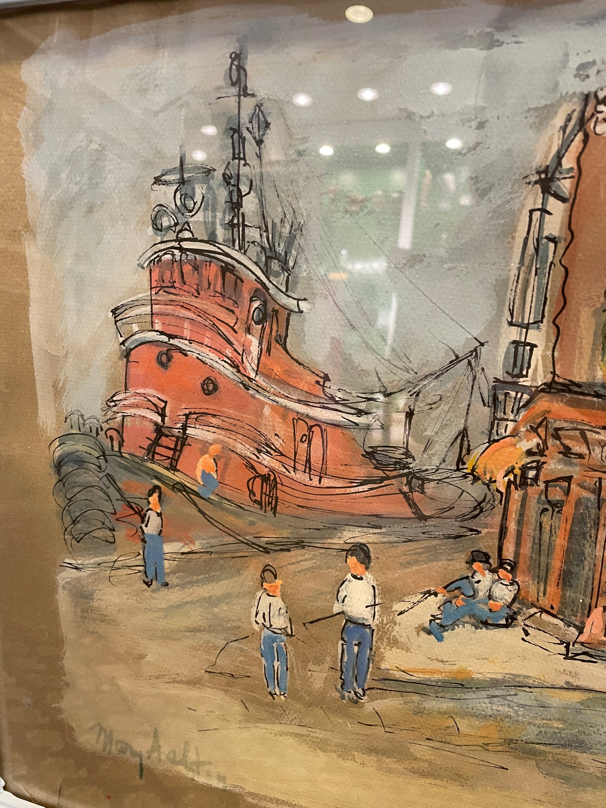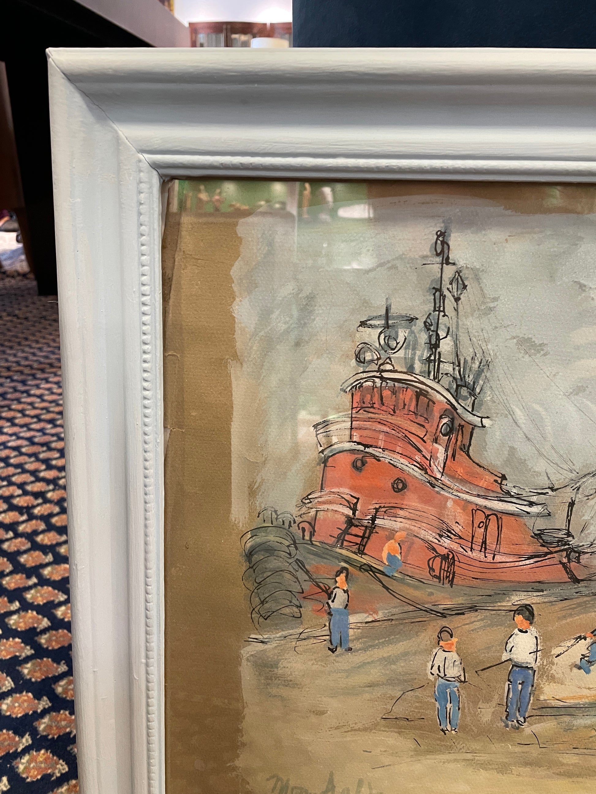 Mary Ashton gouache painting on paper. Signed lower right. This charming piece depicts street life beside a tugboat. Even with its minimalistic design, there is lots of personality exuding from all parts of this scene. The shops on the right are full of character, the people all seem as though they have something to do, and despite it being a dreary day for the weather, this painting really brightens up a room. The piece is in a beveled white frame. A subtle but lively piece for any space.