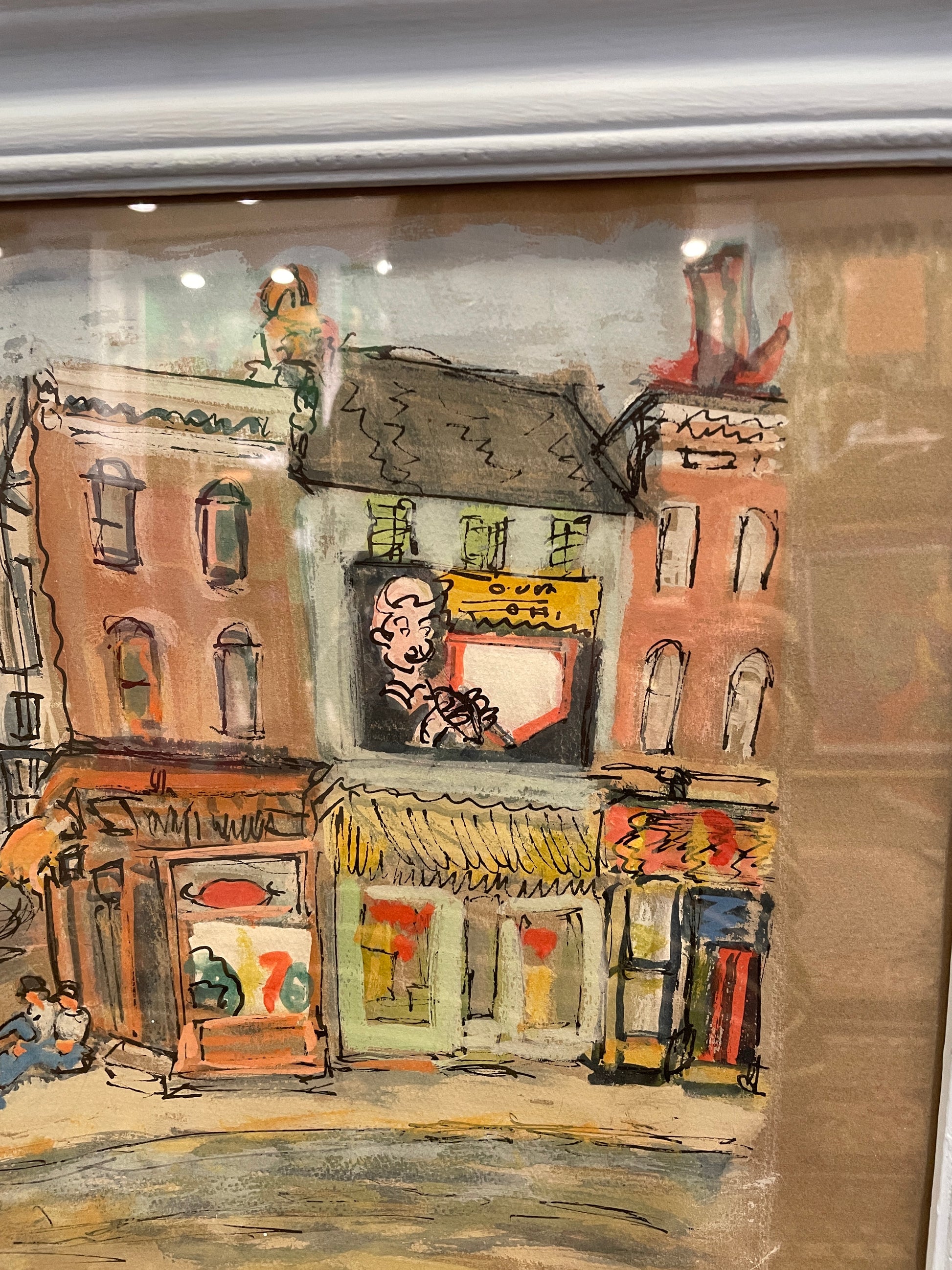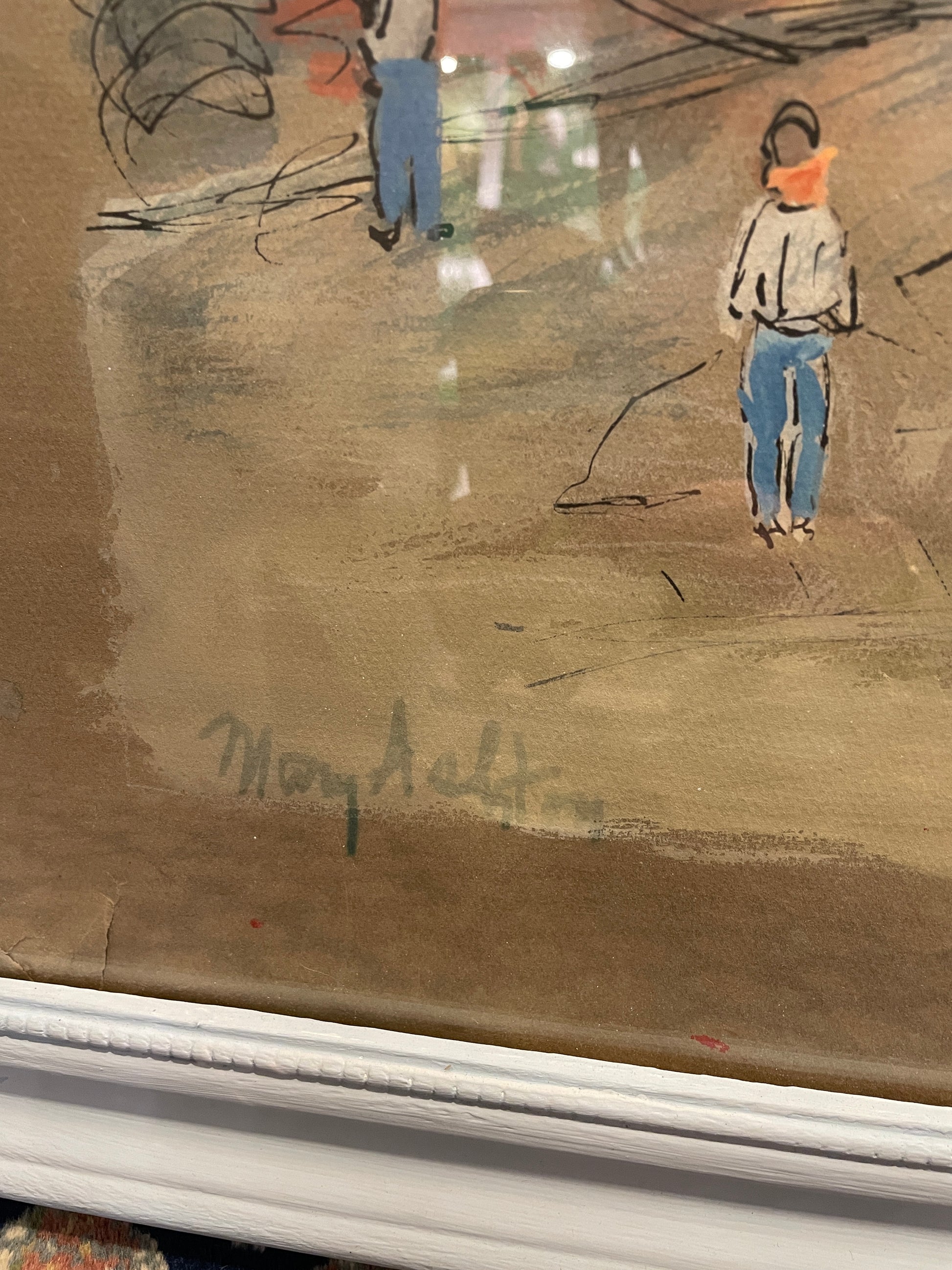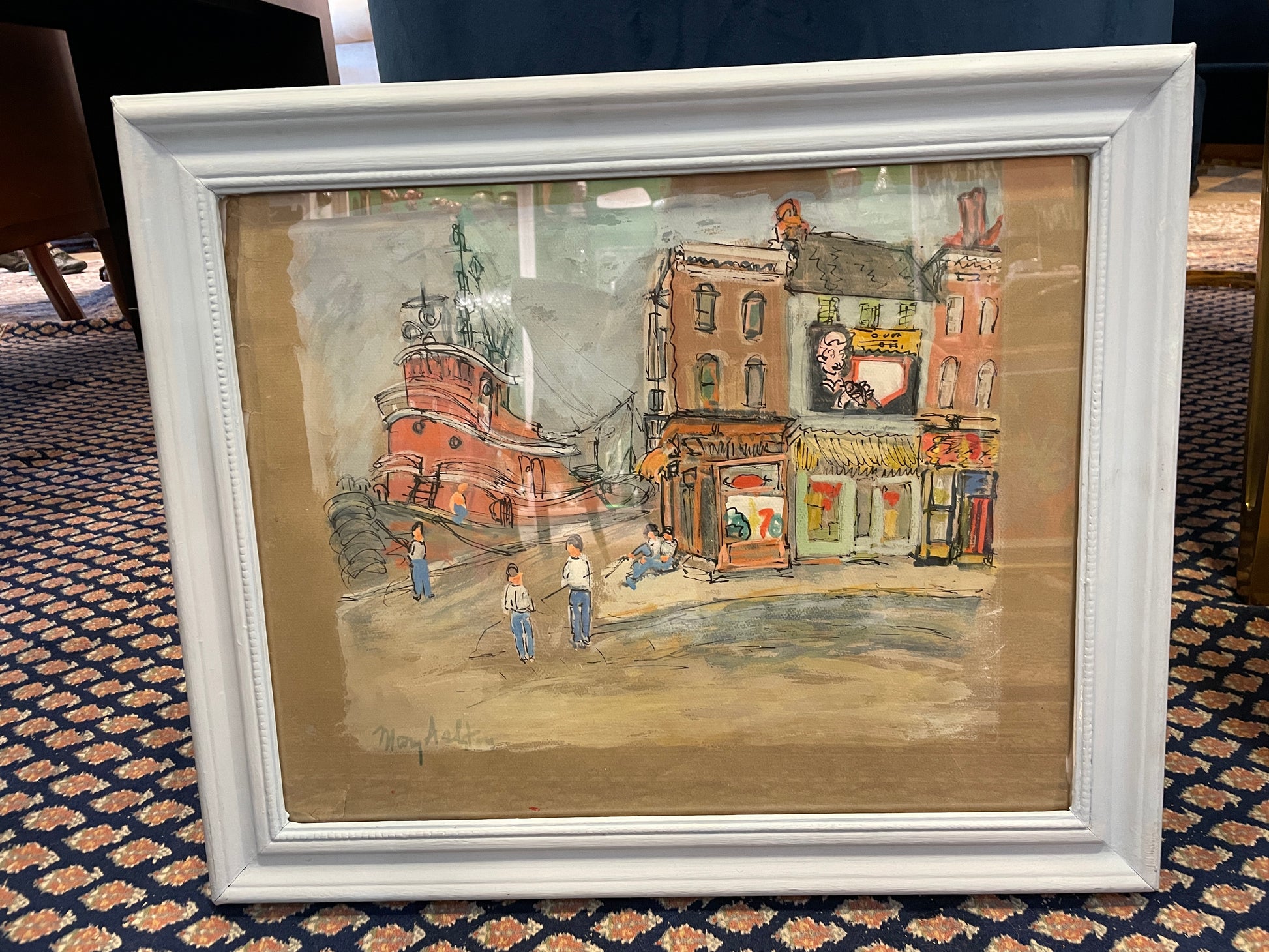 Mary Ashton gouache painting on paper. Signed lower right. This charming piece depicts street life beside a tugboat. Even with its minimalistic design, there is lots of personality exuding from all parts of this scene. The shops on the right are full of character, the people all seem as though they have something to do, and despite it being a dreary day for the weather, this painting really brightens up a room. The piece is in a beveled white frame. A subtle but lively piece for any space.