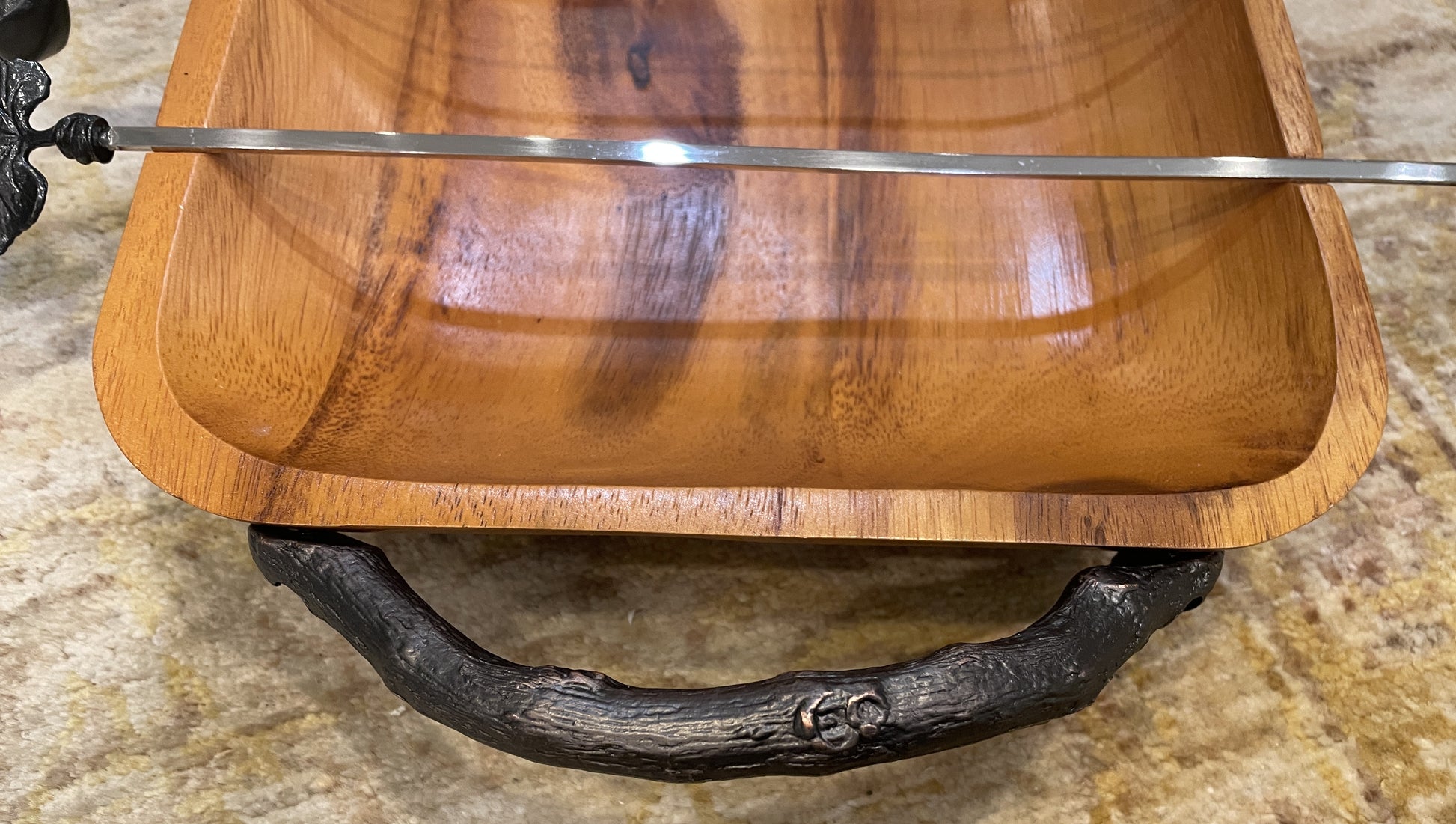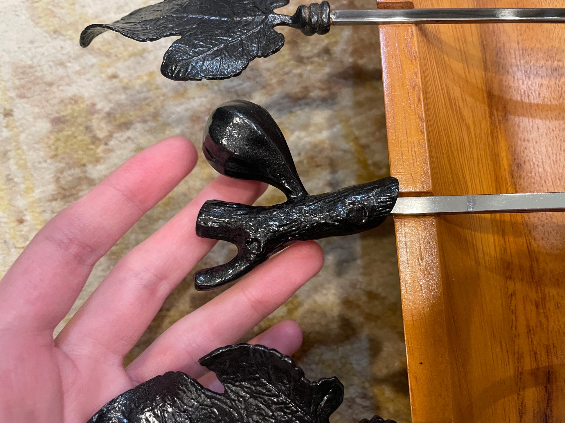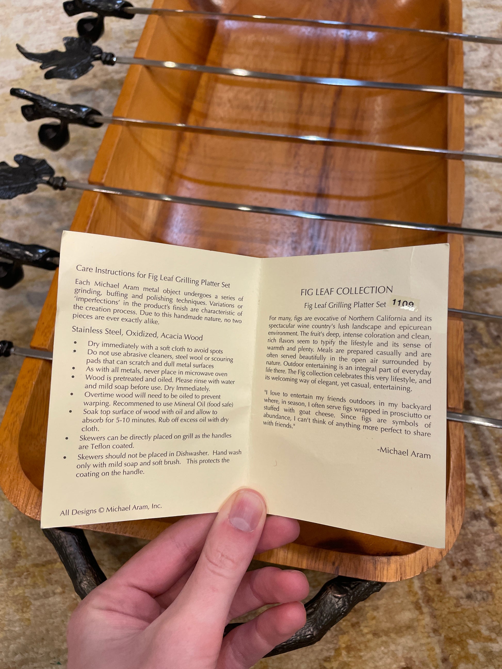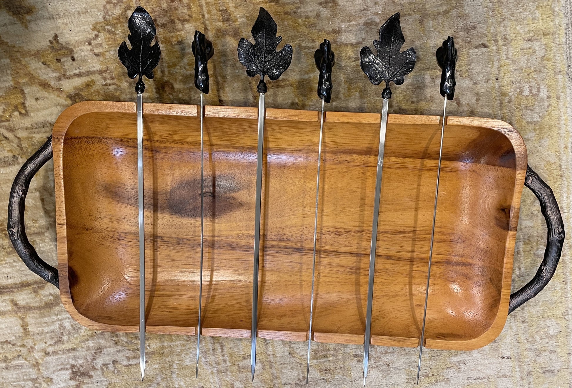 Michael Aram kebab set with tray. This kebab set is a functional work of art. The set is crafted from oxidized stainless steel and a medium-toned acacia wood. With sculptural fig leaf and branch elements on the skewers, and beautiful branch-like handles on the tray, this set is sure to impress. The set includes six skewers, three of which have a fig leaf design on the end, and the other three with a branch and fig detail. The rectangular tray is shallow with rounded corners and small grooves for the skewers to sit in. This gorgeous tray is a perfect way to elevate a setting with its artistic flair.