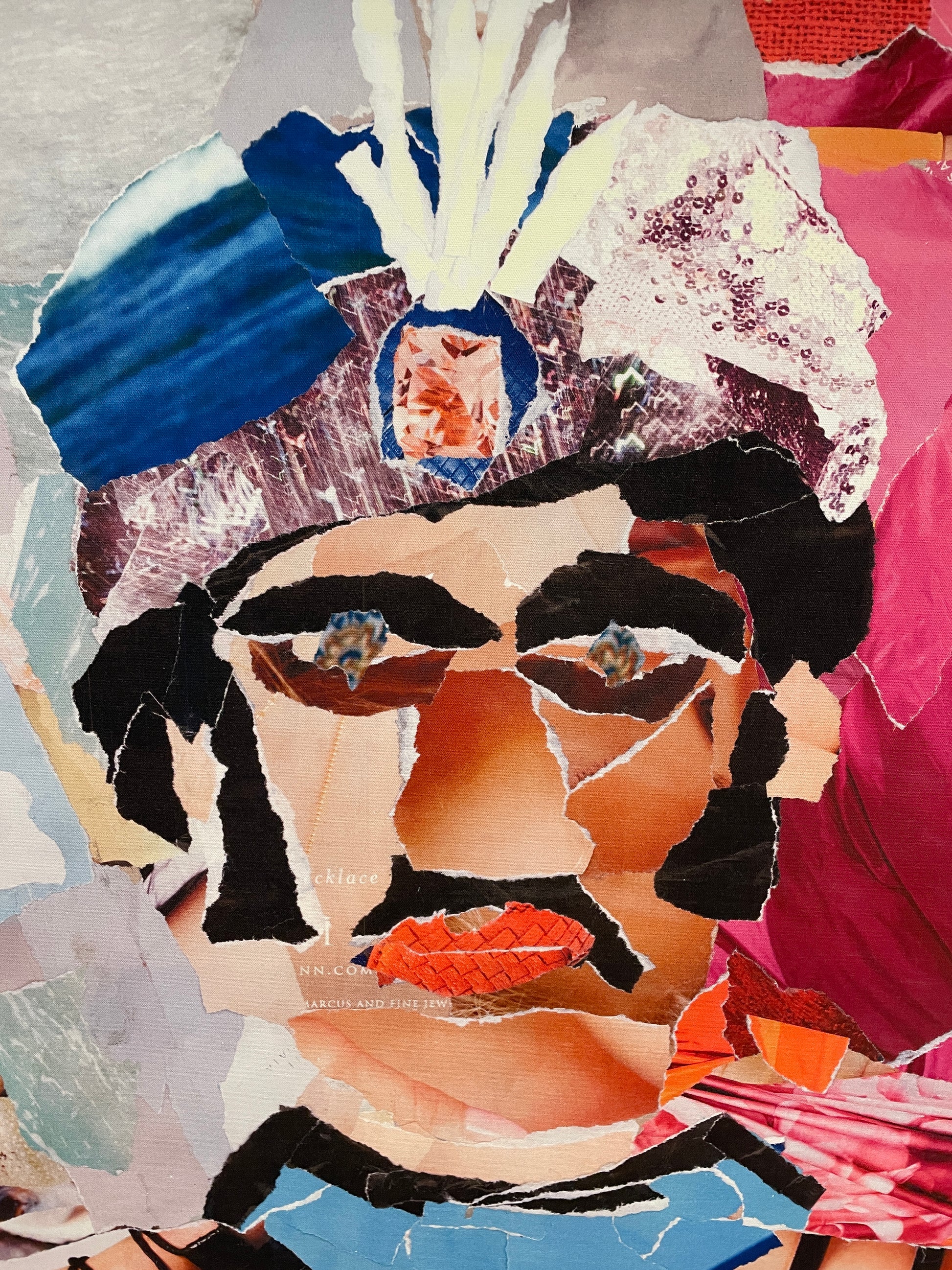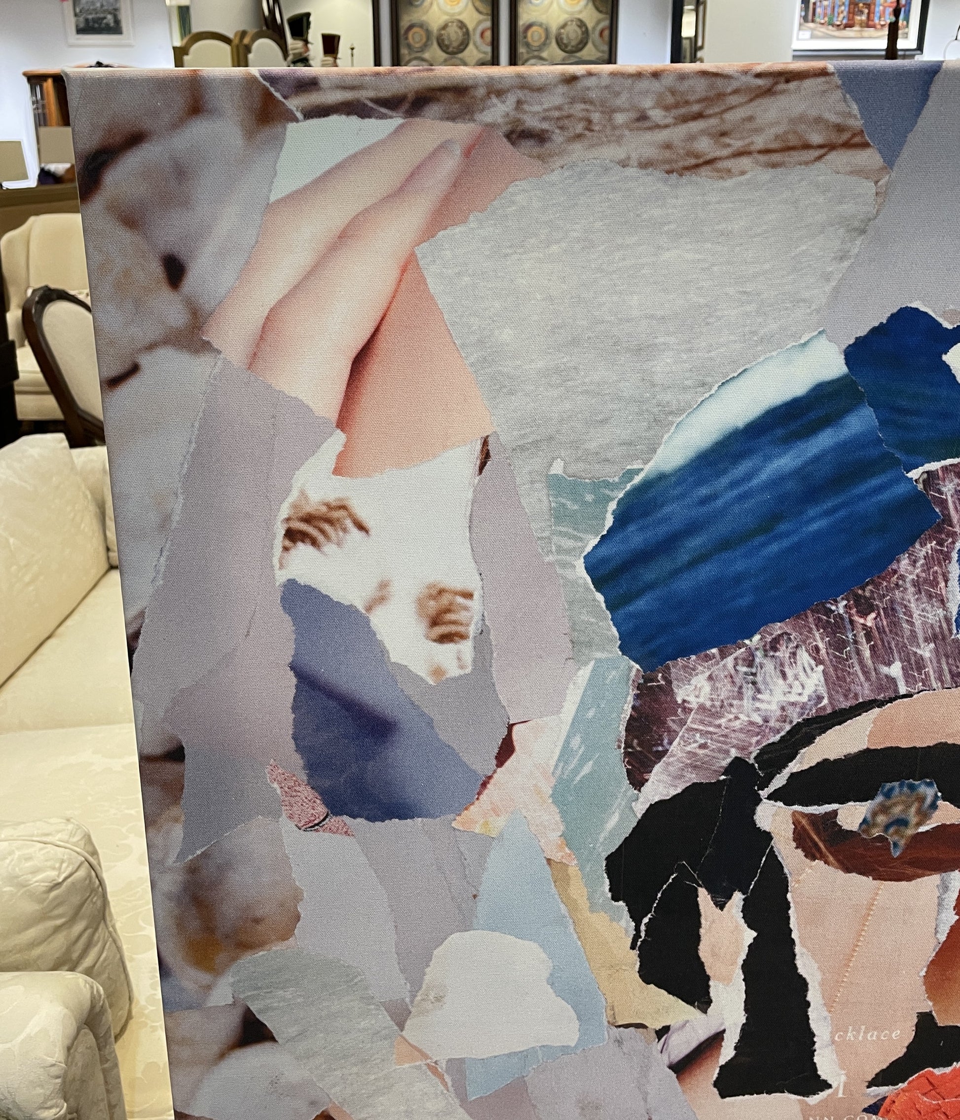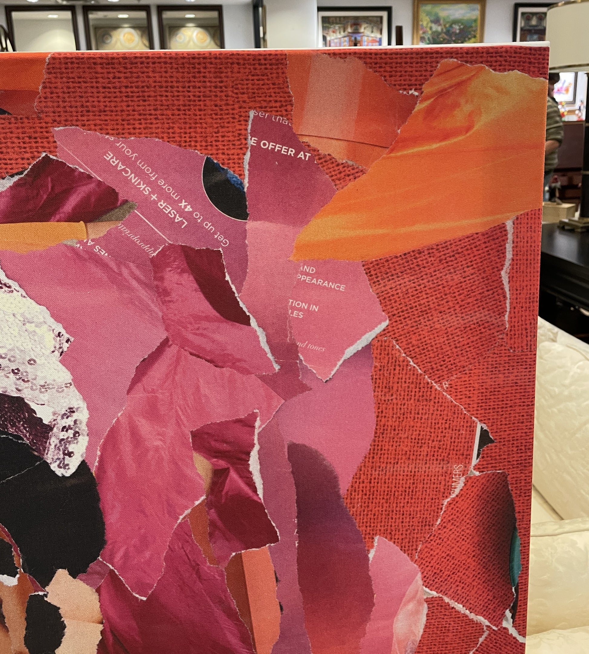Michelle Nussbaumer Maharaja on fabric print. This unique piece is a collage that creates the portrait of a great king. Various images are used to create the figure's features along with the background. The background consists of shades of pink and white. The king wears a feathered hat, and a suit and tie. A unique and captivating piece that's sure to catch eyes.