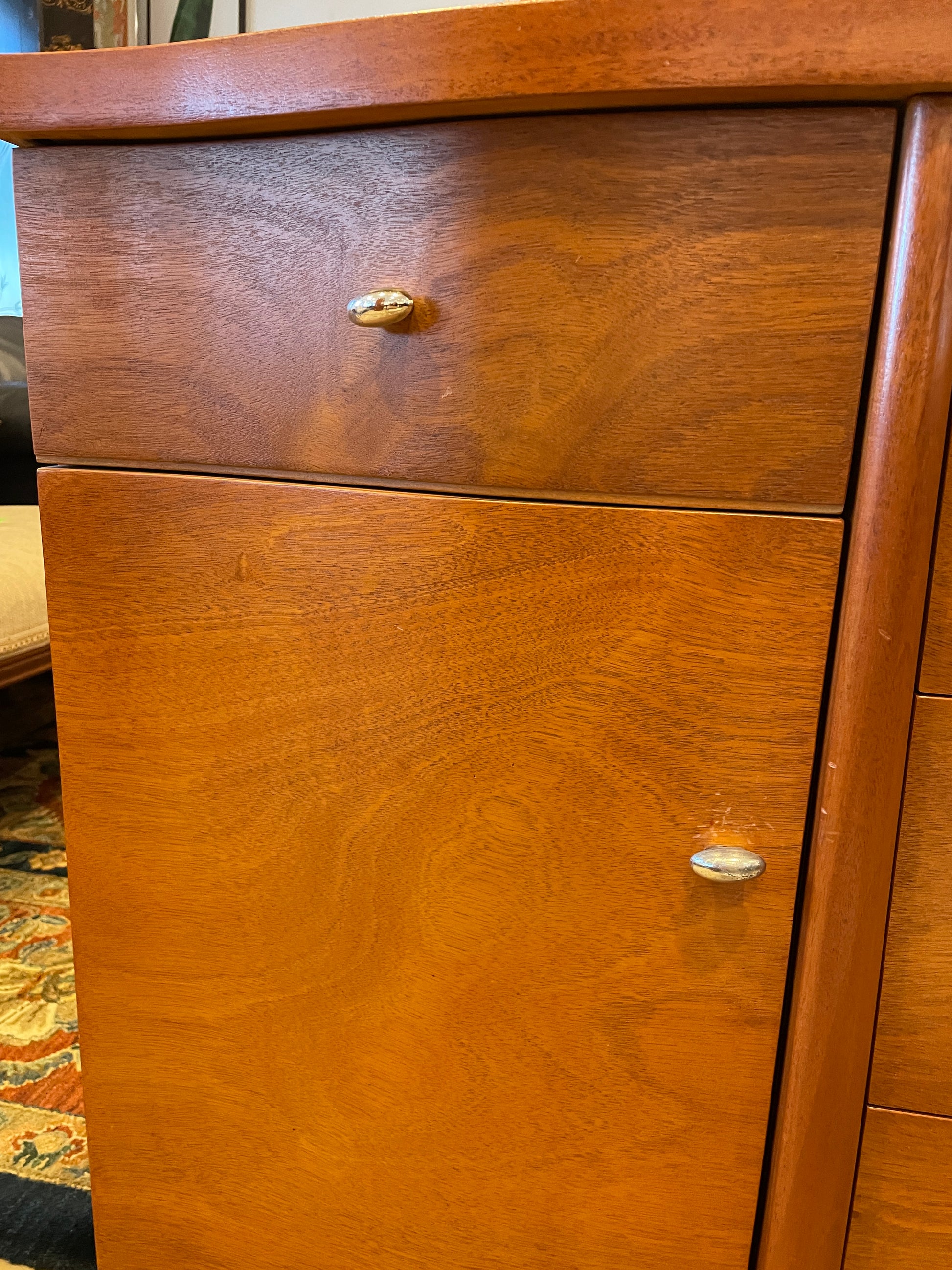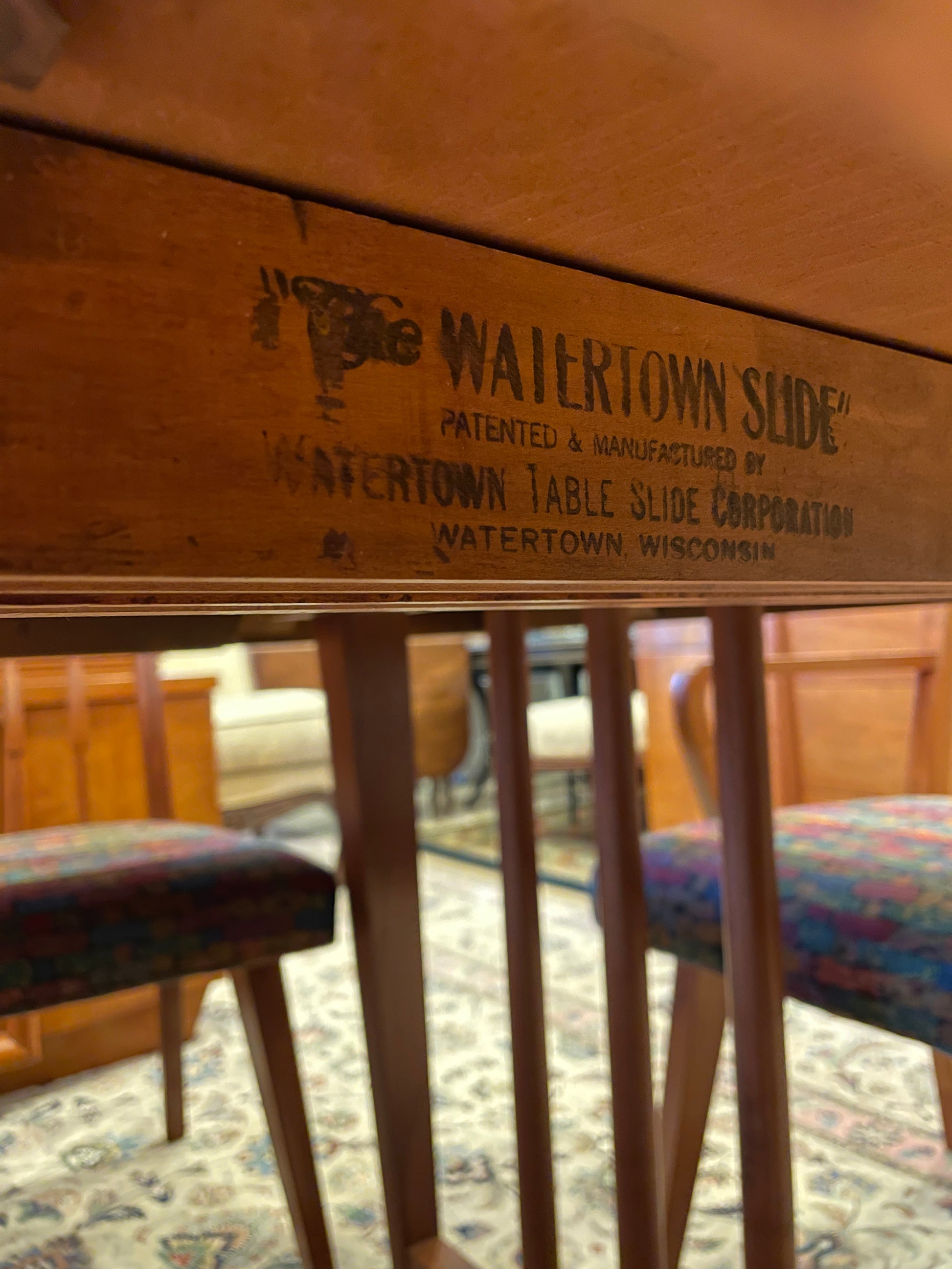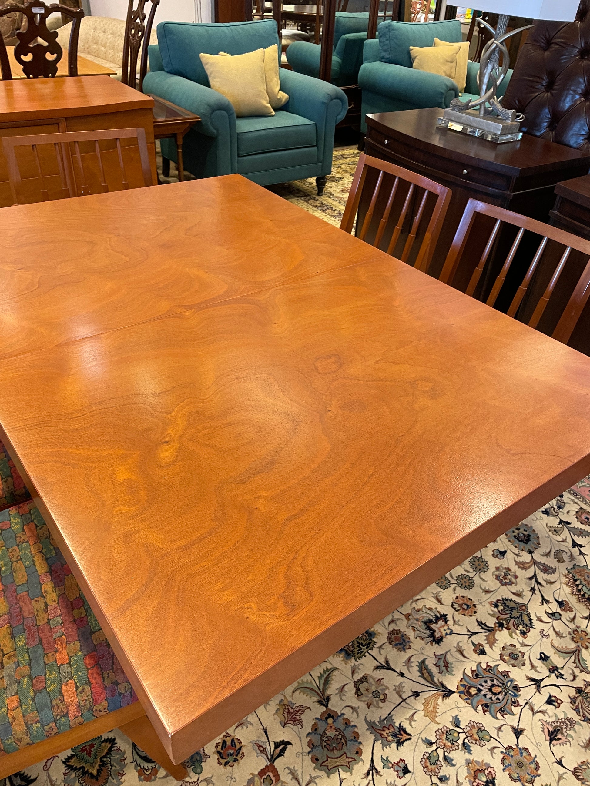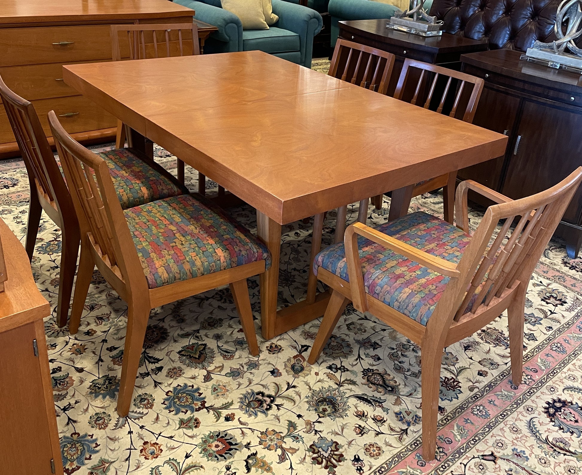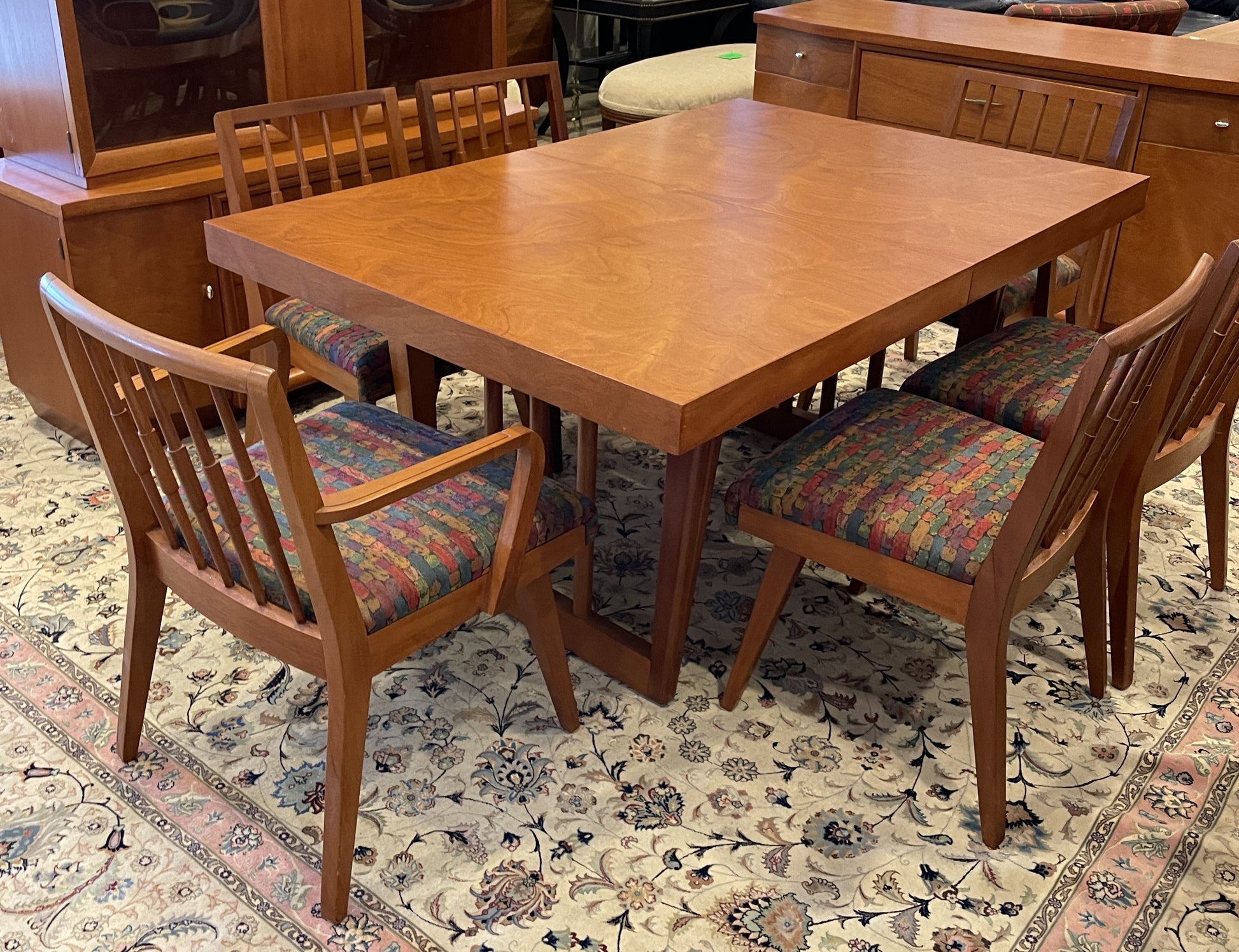 Sieling Mid-Century modern dining suite. Set includes a dining table, 6 chairs (2 with arms, 4 armless), a china cabinet, and a buffet table. Additionally, this set has pads and three 12" leaves.
