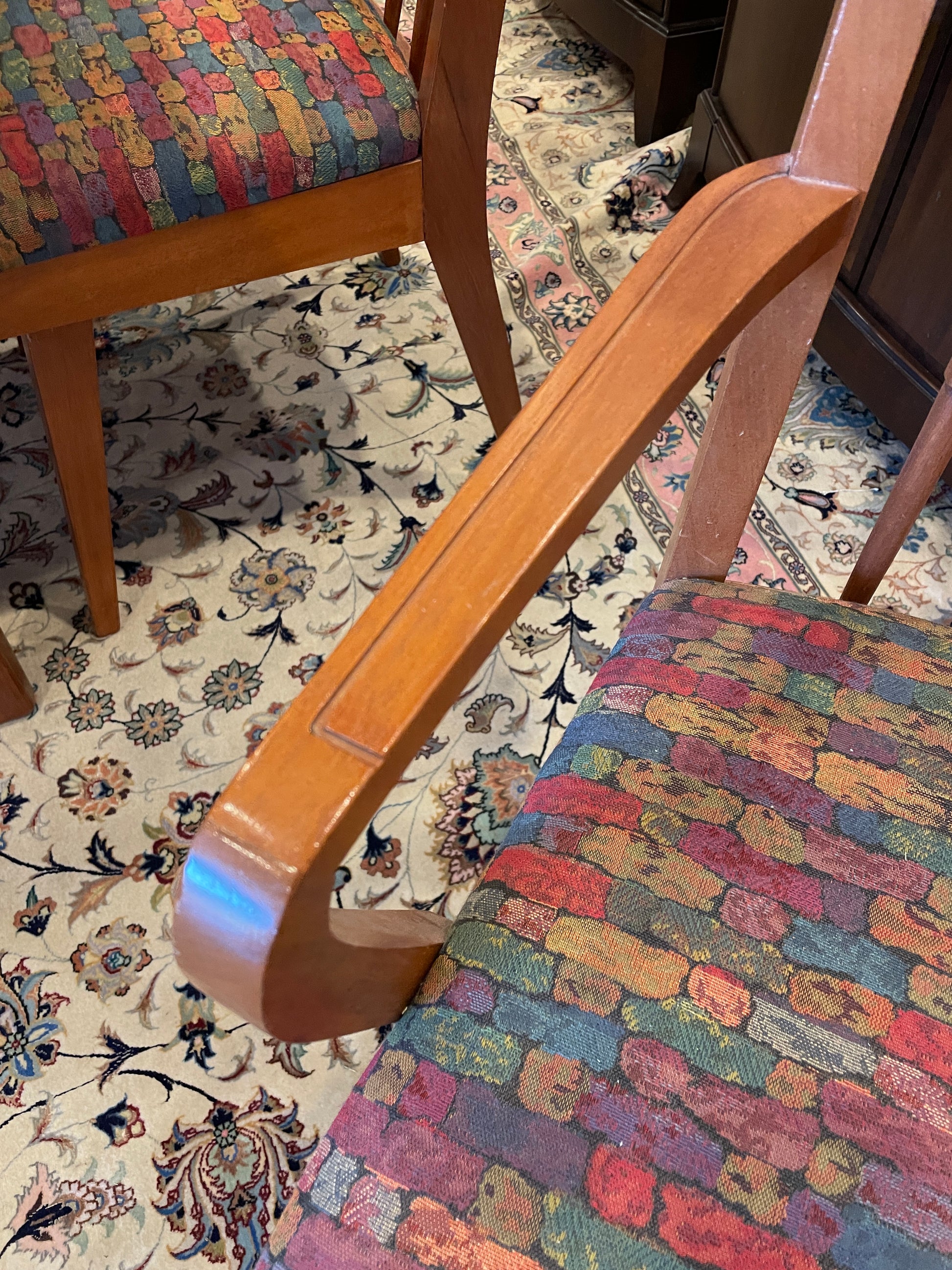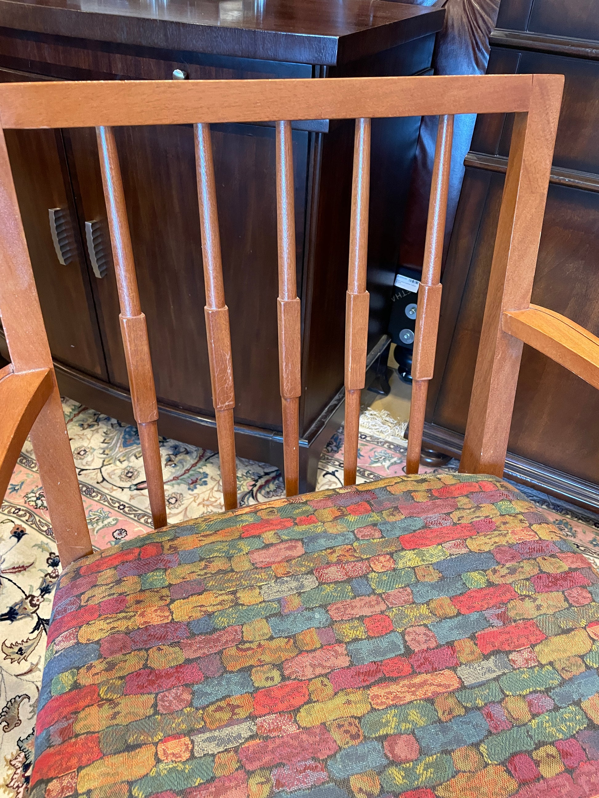 The chairs in this set sit upon a wooden frame with a banister back. The upholstered portion of each seat has a fun brick-like pattern in a rainbow of mellowed colors. Two of the chairs have angular arms with a channel carved into the top. The legs of the chairs are squared with a slight taper towards the foot.