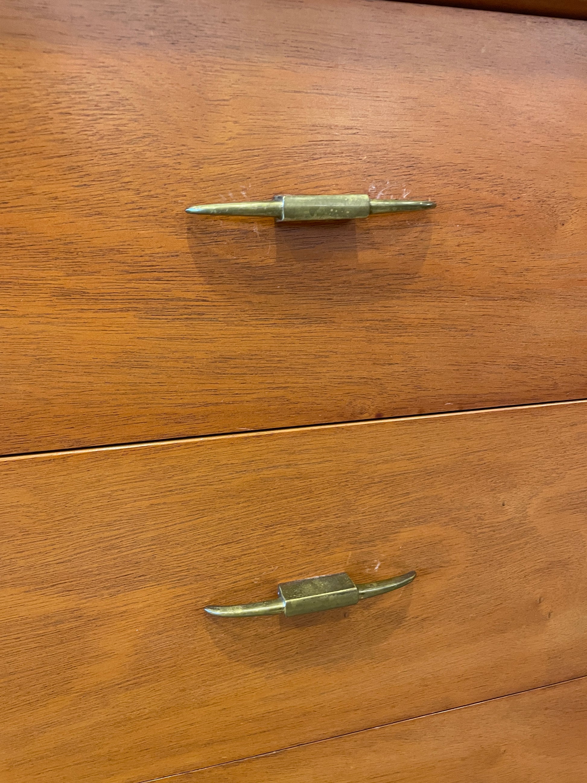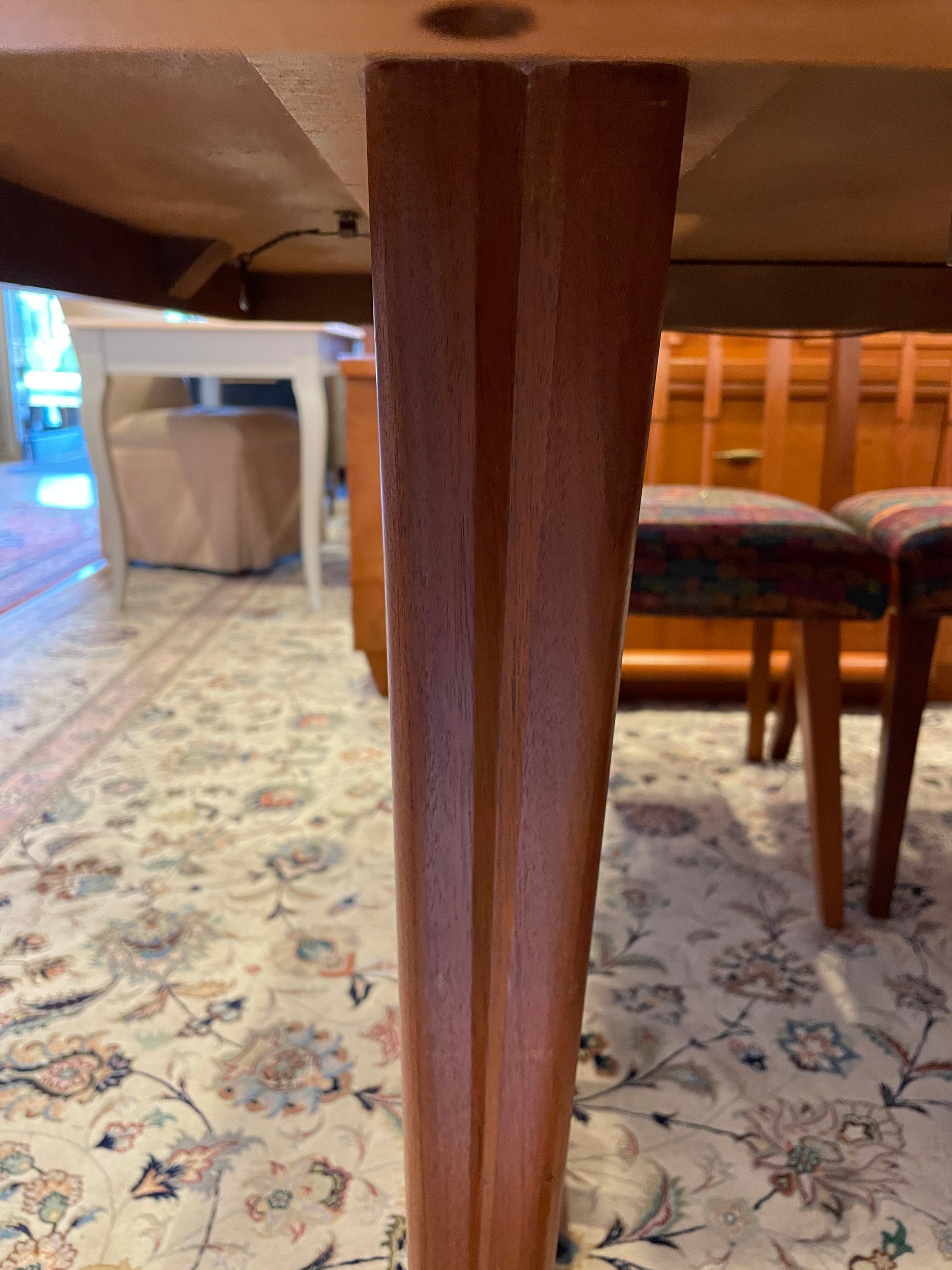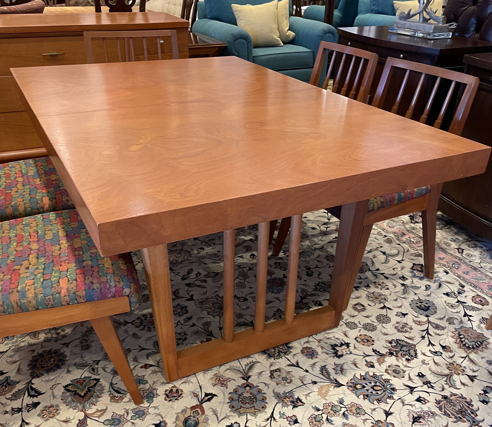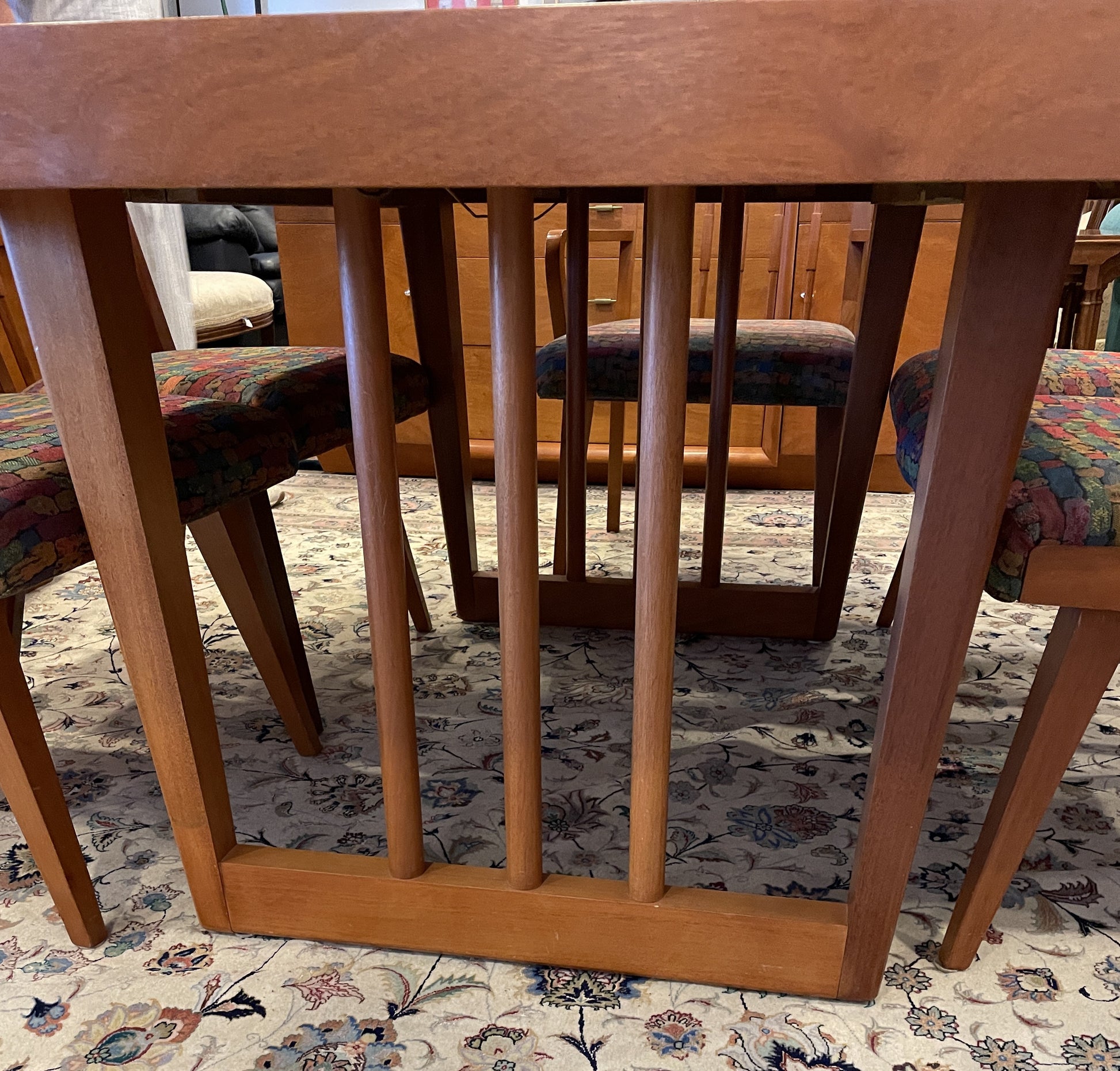 The dining table in this set is an especially beautiful piece. Its sleek tabletop, and unique banister-like legs complement the rest of the set perfectly. This table is a beautiful example of mid-century modern furniture.