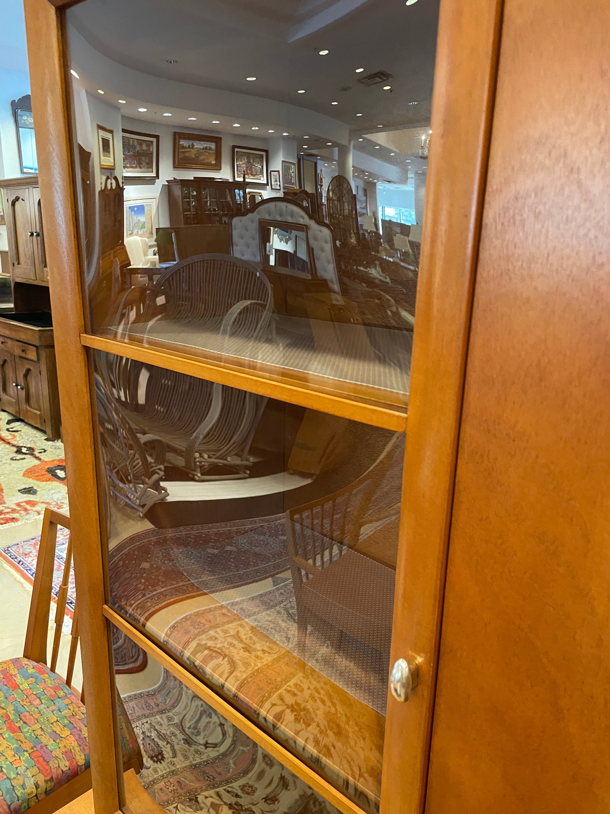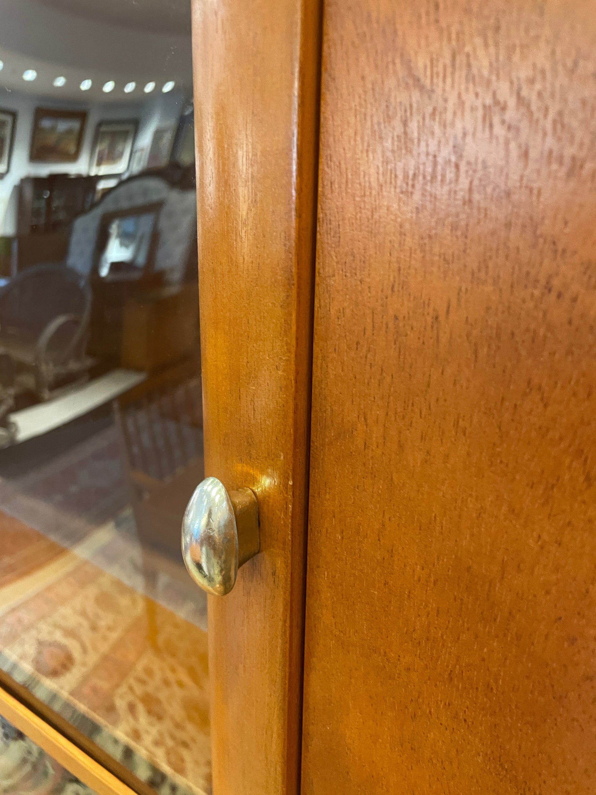 The china cabinet in this set features three shelves that sit behind glass doors, and a base that holds two drawers and two additional cabinets for hidden storage. The hardware on this cabinet is gold in color. The knobs of the cabinet doors are oblong, and the drawer pulls are a unique shape with tapered edges.